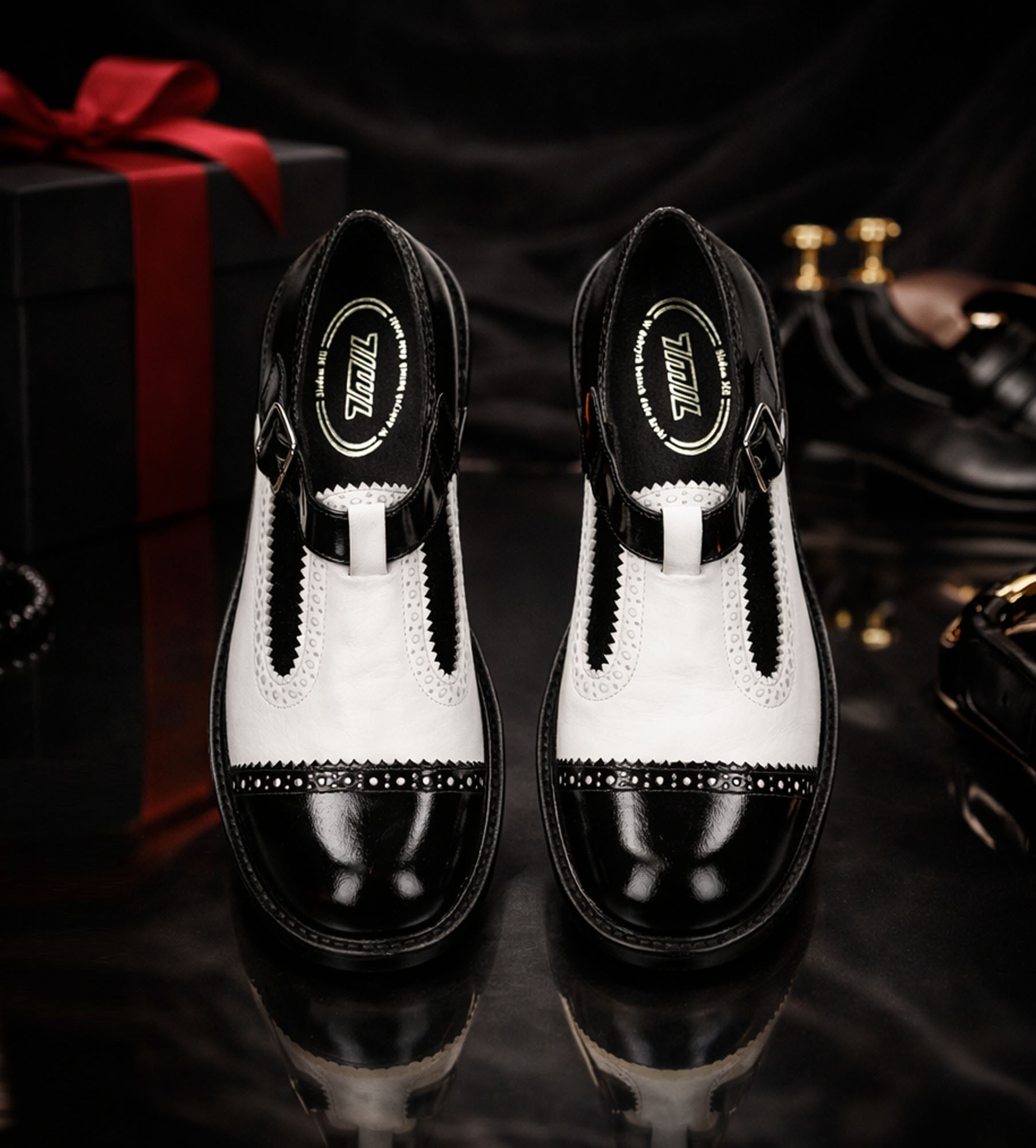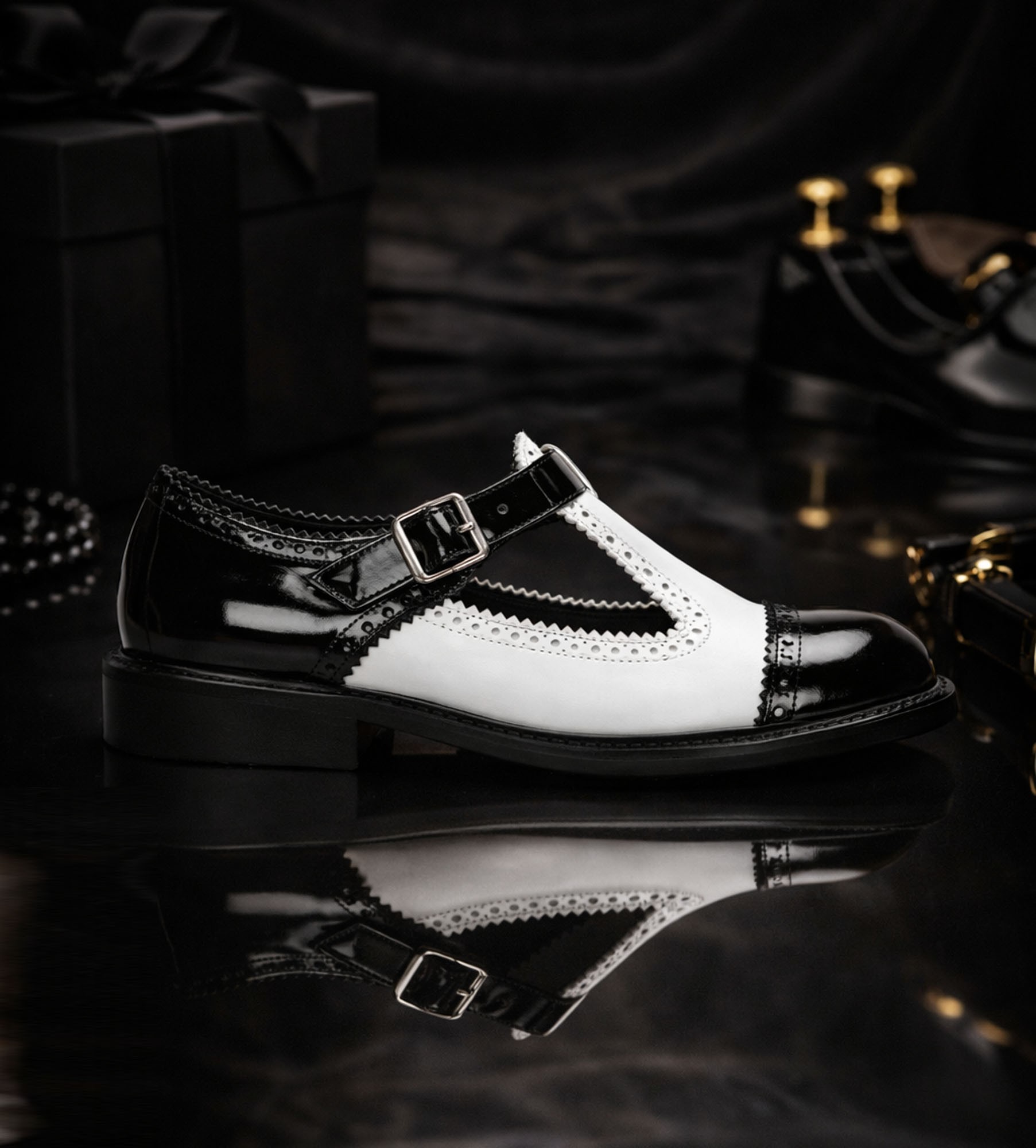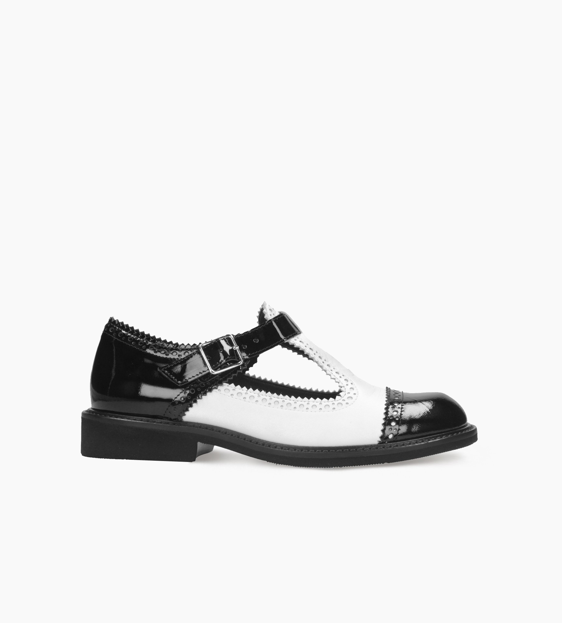 Eleganckie półbuty damskie w kontrastowym zestawieniu klasycznej bieli i głębokiej czerni zachwycają wysmakowanym wzornictwem. Wykonane z wysokiej jakości skóry naturalnej, z lakierowanymi elementami na czubku i pięcie, przyciągają uwagę połyskiem i precyzją wykończenia. Charakterystyczne wycięcia w cholewce i dekoracyjne perforacje nadają butom wyjątkowo kobiecego, retro-charakteru w nowoczesnym wydaniu. Pasek z klamerką stabilizuje stopę i dopełnia całość kompozycji. Wnętrze wyściełane delikatną skórą jagnięcą zapewnia komfort noszenia przez cały dzień.