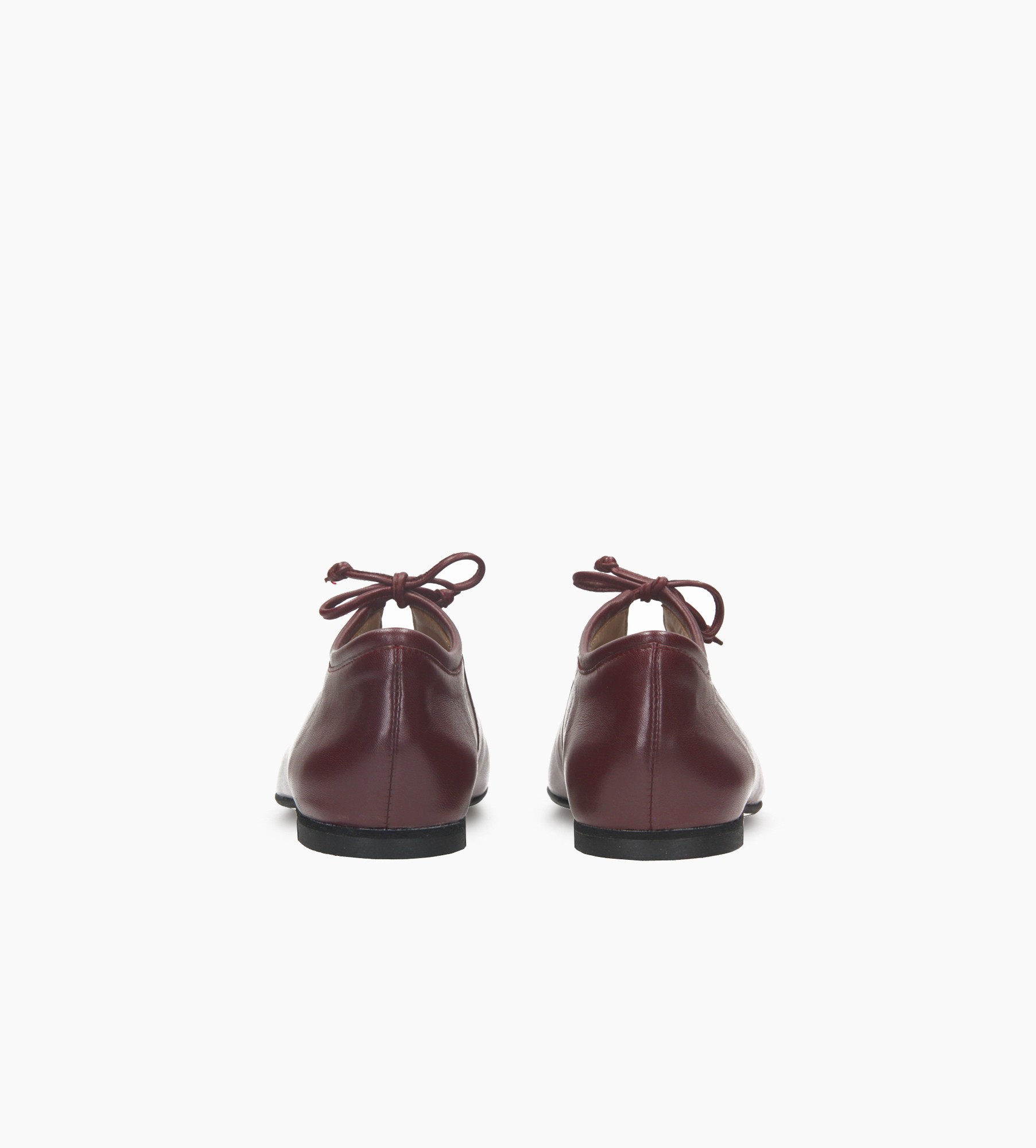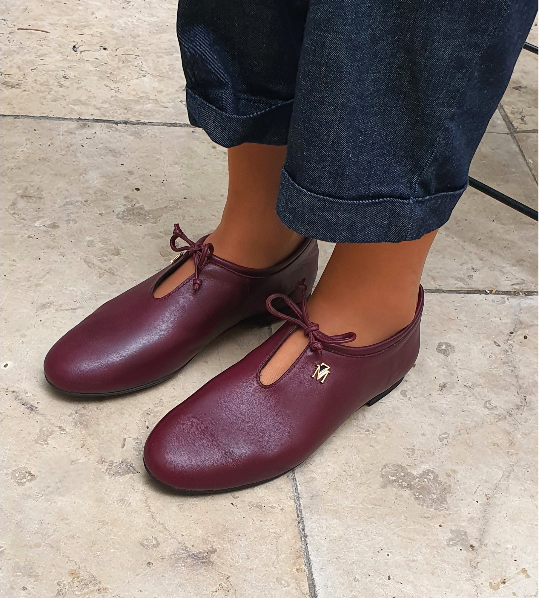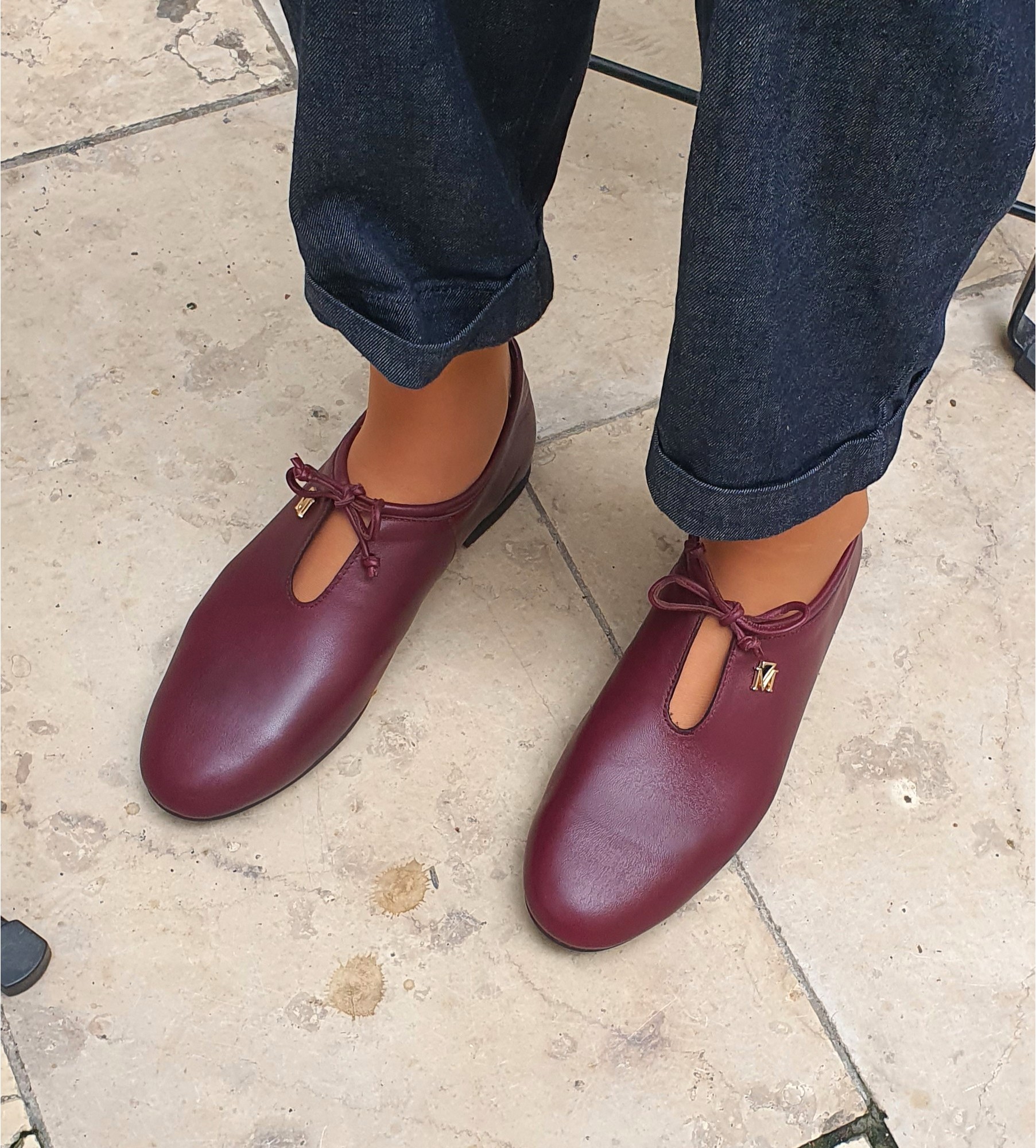 Te subtelne półbuty w odcieniu głębokiego bordo to ukłon w stronę klasycznego wzornictwa z nowoczesnym akcentem. Wykonane z miękkiej, naturalnej skóry cielęcej, zapewniają wyjątkowy komfort noszenia, a wnętrze z delikatnej skóry jagnięcej otula stopę niczym druga skóra. Cholewka z delikatnym wycięciem na podbiciu nadaje sylwetce lekkości, a finezyjne wiązanie z subtelnym logo marki stanowi szykowną ozdobę. Płaska podeszwa i staranne wykończenie sprawiają, że są to idealne buty zarówno do pracy, jak i na eleganckie spotkania.