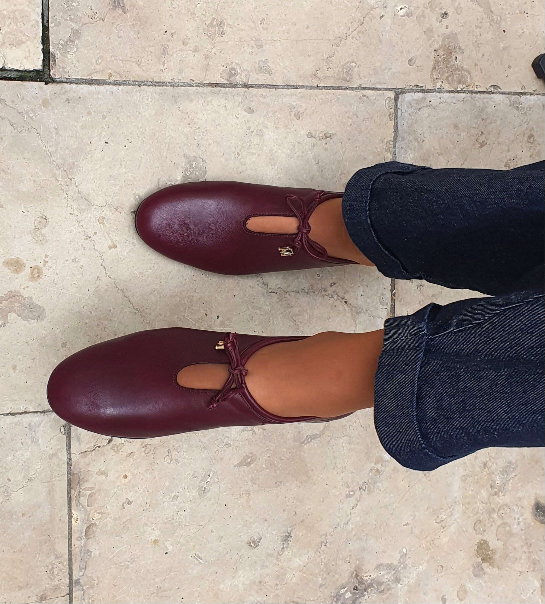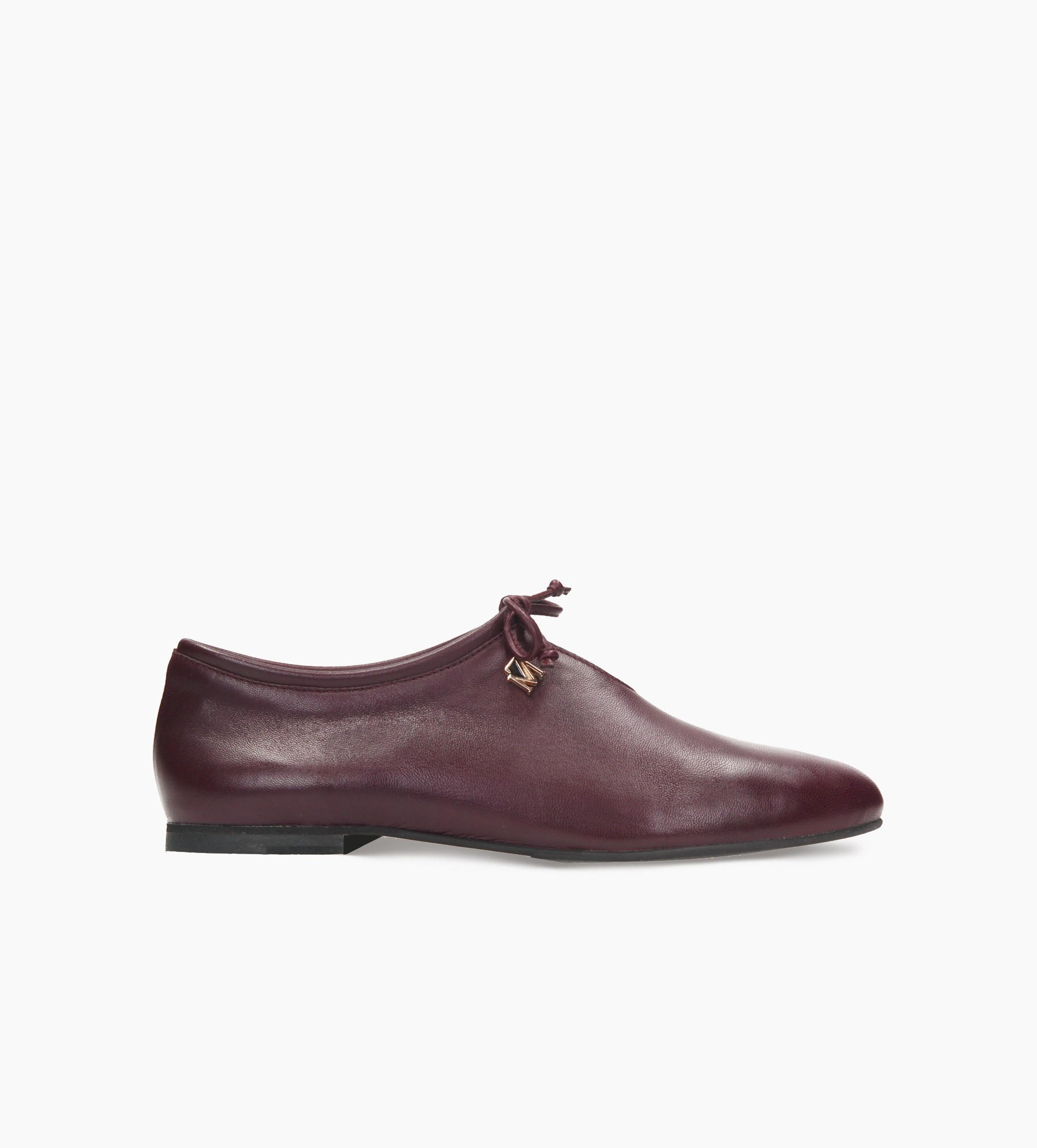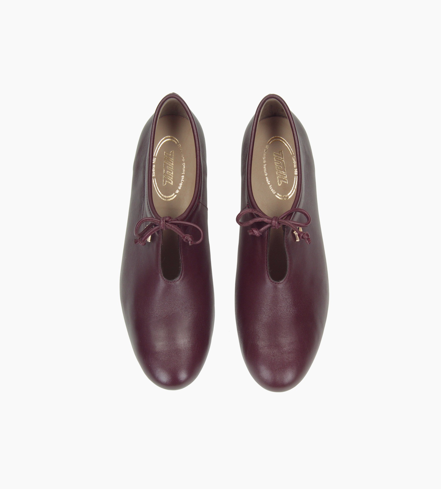 Te subtelne półbuty w odcieniu głębokiego bordo to ukłon w stronę klasycznego wzornictwa z nowoczesnym akcentem. Wykonane z miękkiej, naturalnej skóry cielęcej, zapewniają wyjątkowy komfort noszenia, a wnętrze z delikatnej skóry jagnięcej otula stopę niczym druga skóra. Cholewka z delikatnym wycięciem na podbiciu nadaje sylwetce lekkości, a finezyjne wiązanie z subtelnym logo marki stanowi szykowną ozdobę. Płaska podeszwa i staranne wykończenie sprawiają, że są to idealne buty zarówno do pracy, jak i na eleganckie spotkania.