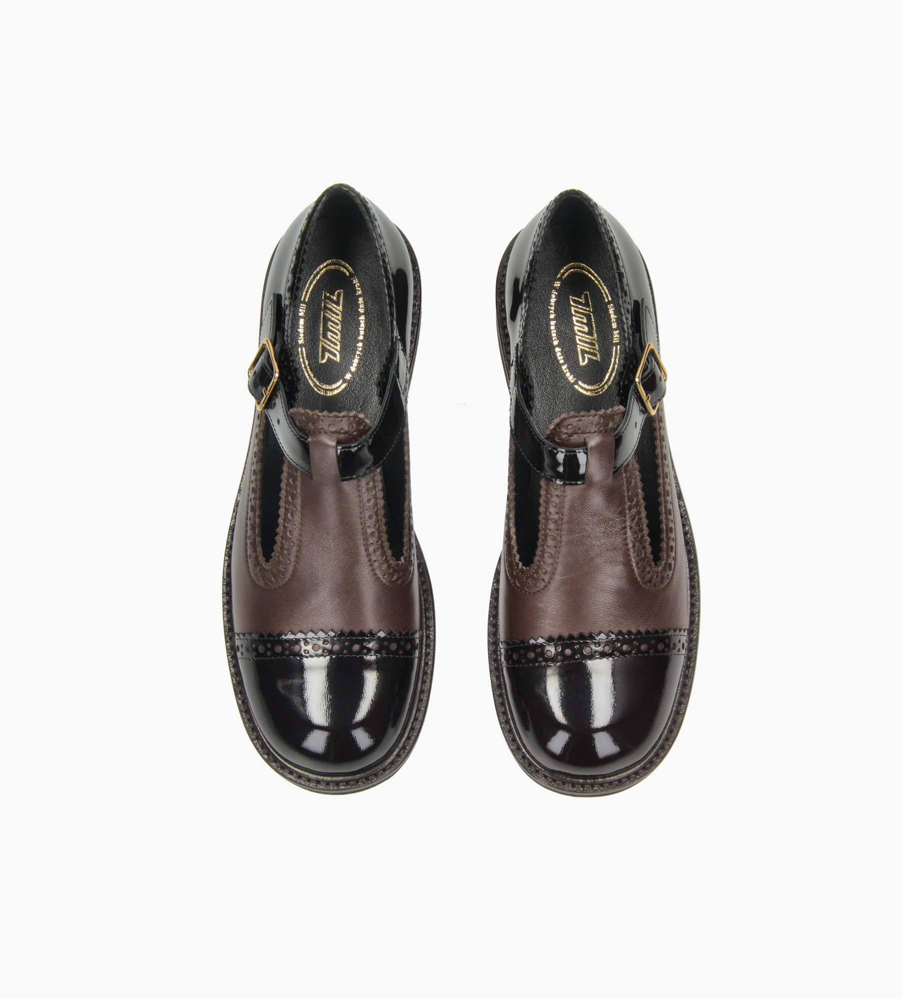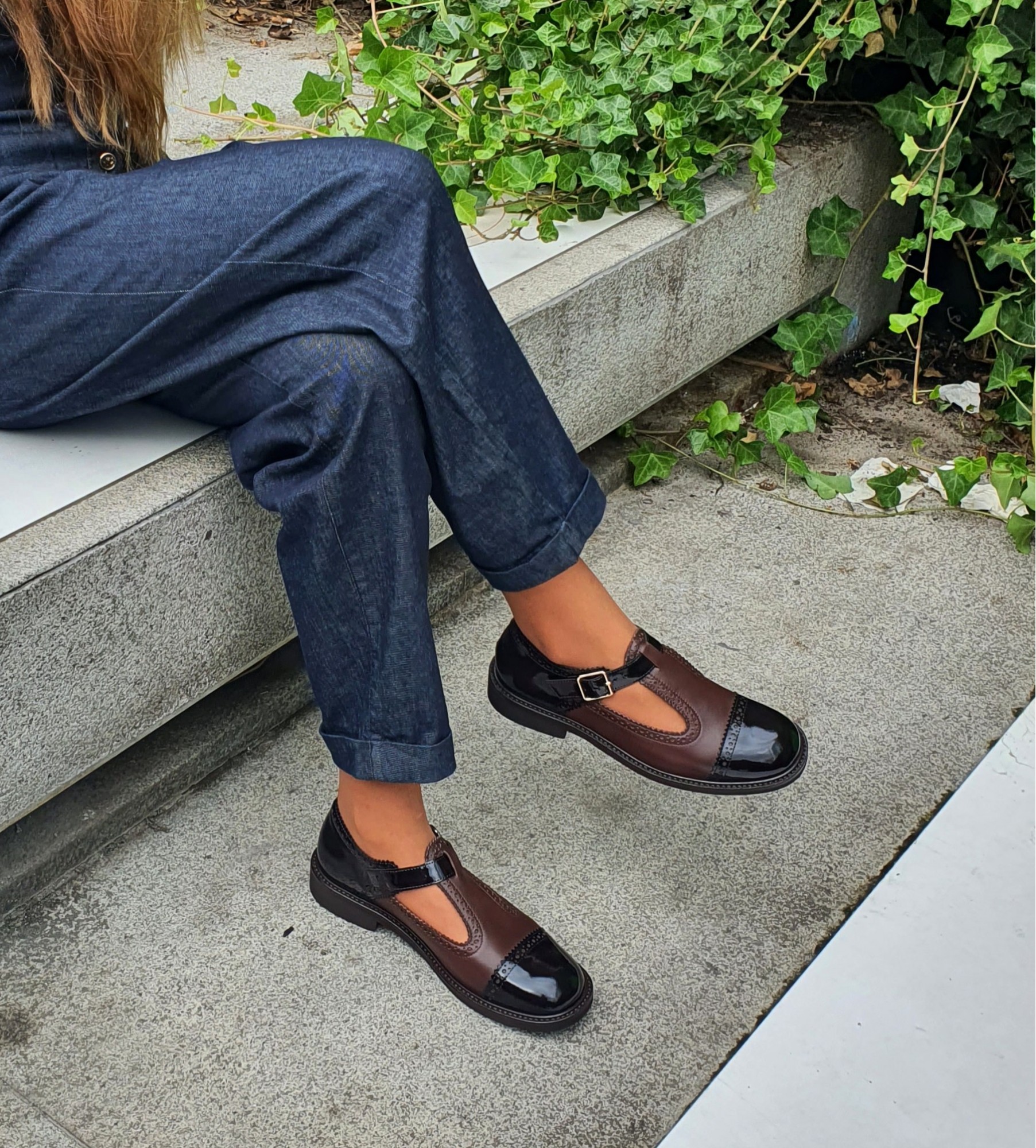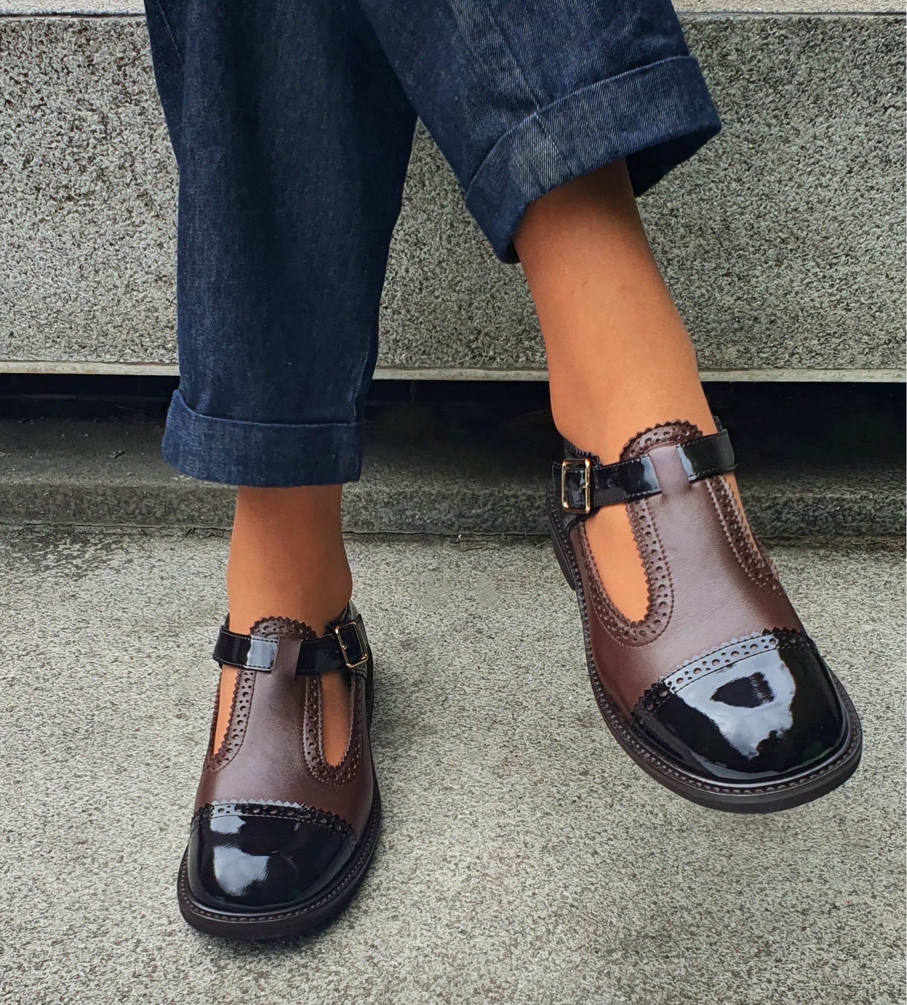 Wyjątkowe półbuty to połączenie klasycznej elegancji ze stylem retro. Wykonane z naturalnej skóry, łączą matową czekoladową cholewkę z kontrastującymi czarnymi, lakierowanymi detalami. Zapięcie na pasek z klamerką w stylu Mary Jane i dekoracyjne perforacje dodają całości subtelnego, kobiecego uroku. Wnętrze butów wyściełane jest miękką skórą jagnięcą, co gwarantuje nie tylko komfort, ale i przyjemne ciepło podczas chłodniejszych dni. Dzięki niskiemu, stabilnemu obcasowi i delikatnie zaokrąglonemu noskowi model ten jest idealnym wyborem zarówno do eleganckich stylizacji, jak i do bardziej codziennych zestawów z nutą vintage.
