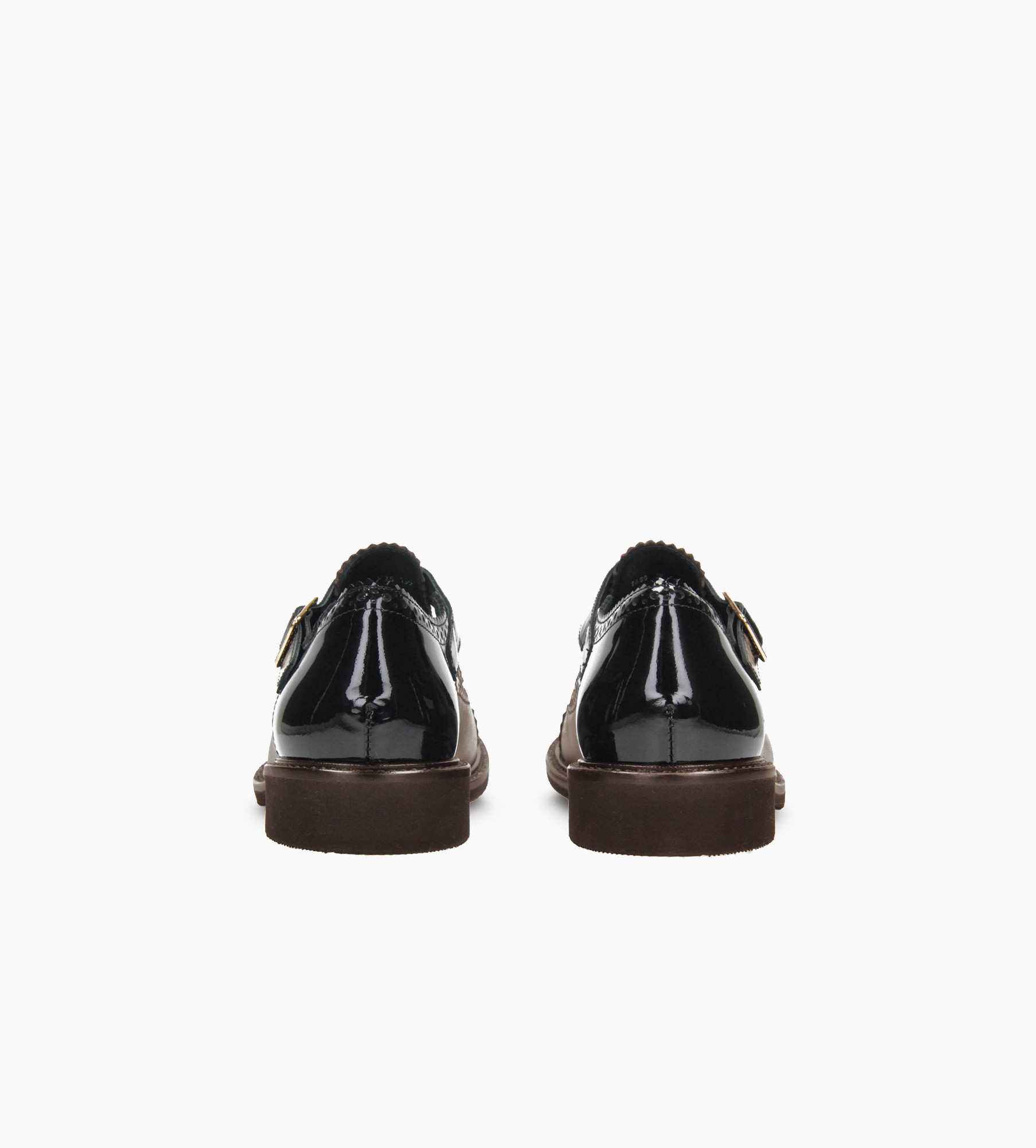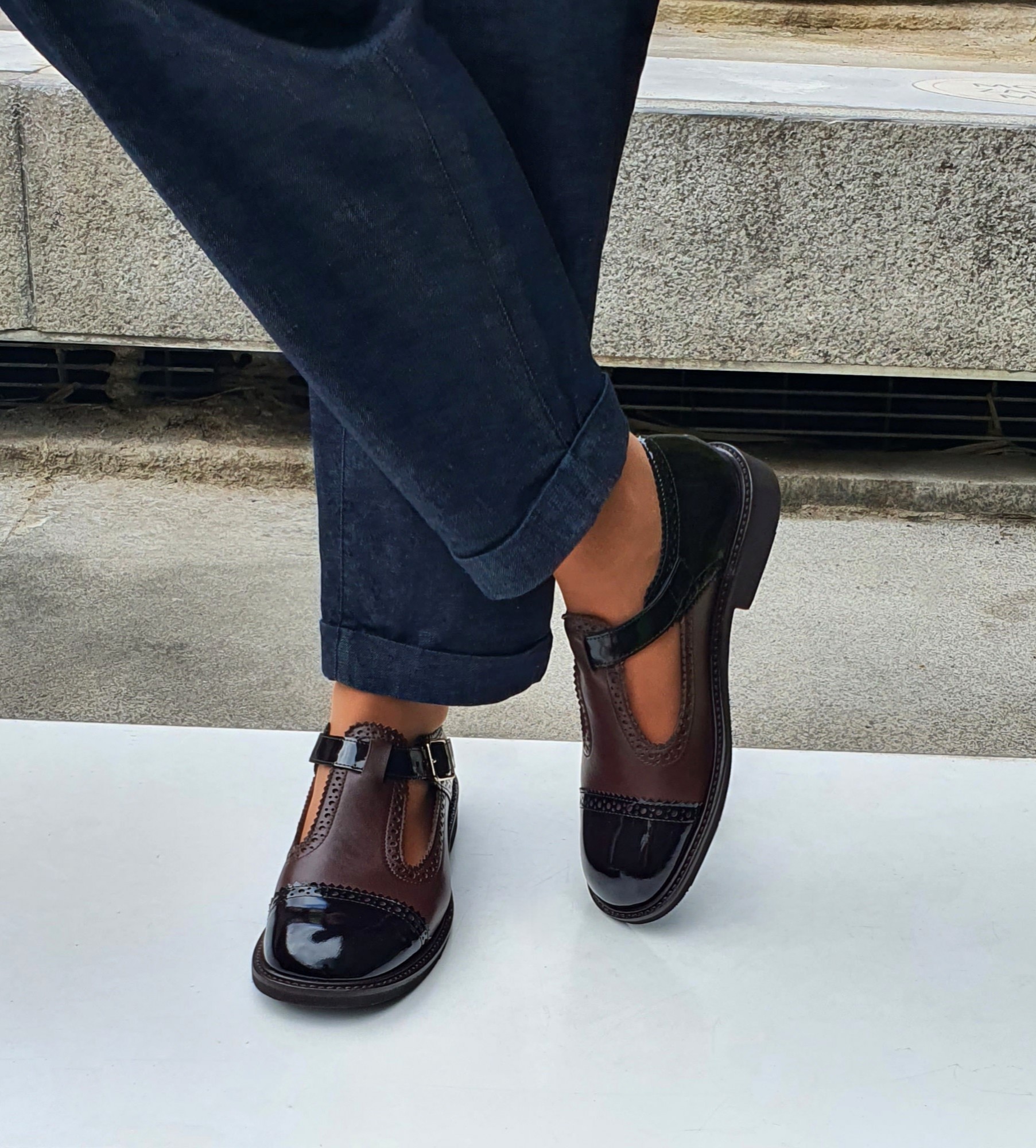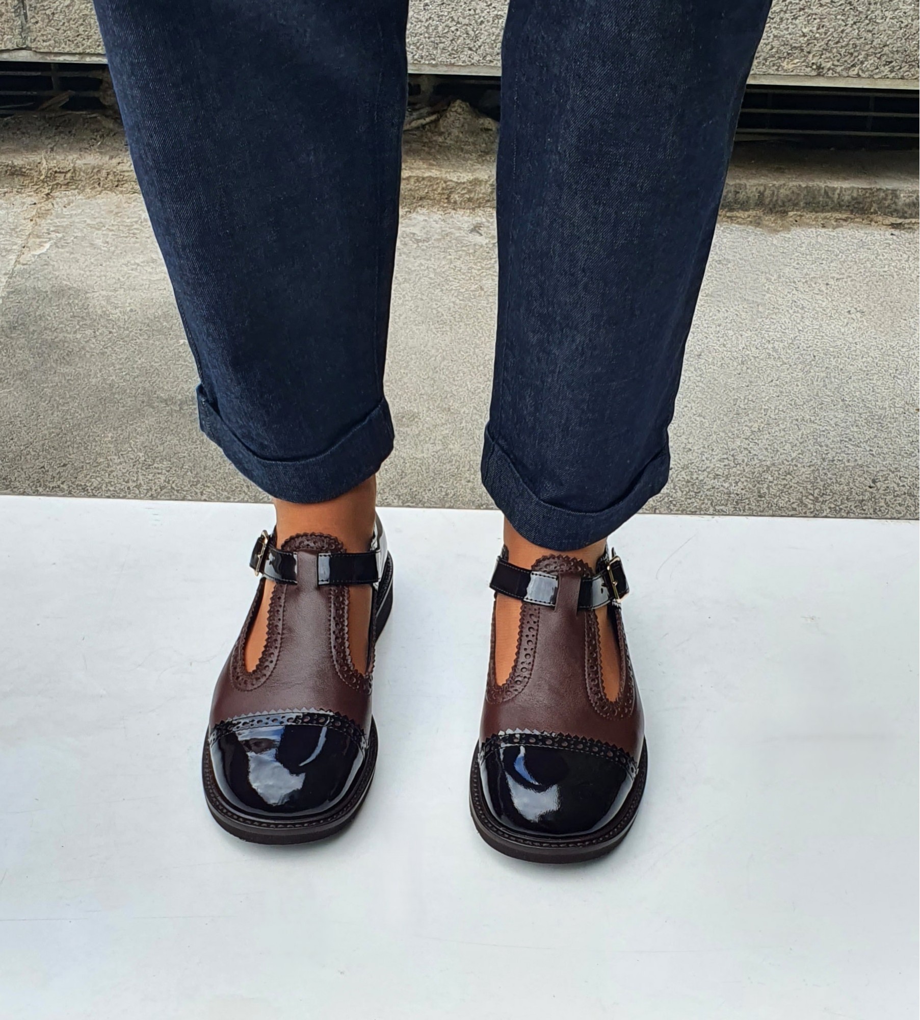 Wyjątkowe półbuty to połączenie klasycznej elegancji ze stylem retro. Wykonane z naturalnej skóry, łączą matową czekoladową cholewkę z kontrastującymi czarnymi, lakierowanymi detalami. Zapięcie na pasek z klamerką w stylu Mary Jane i dekoracyjne perforacje dodają całości subtelnego, kobiecego uroku. Wnętrze butów wyściełane jest miękką skórą jagnięcą, co gwarantuje nie tylko komfort, ale i przyjemne ciepło podczas chłodniejszych dni. Dzięki niskiemu, stabilnemu obcasowi i delikatnie zaokrąglonemu noskowi model ten jest idealnym wyborem zarówno do eleganckich stylizacji, jak i do bardziej codziennych zestawów z nutą vintage.