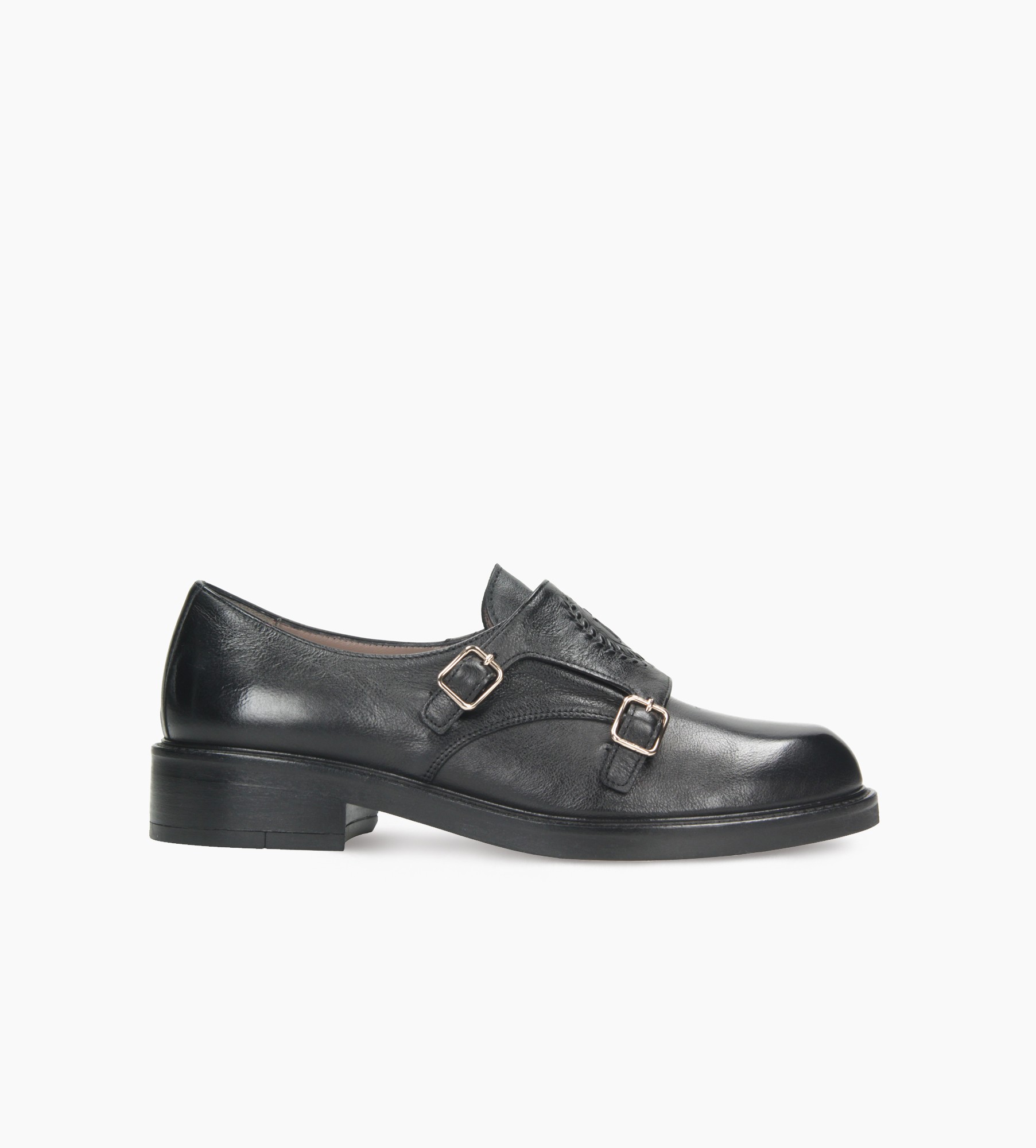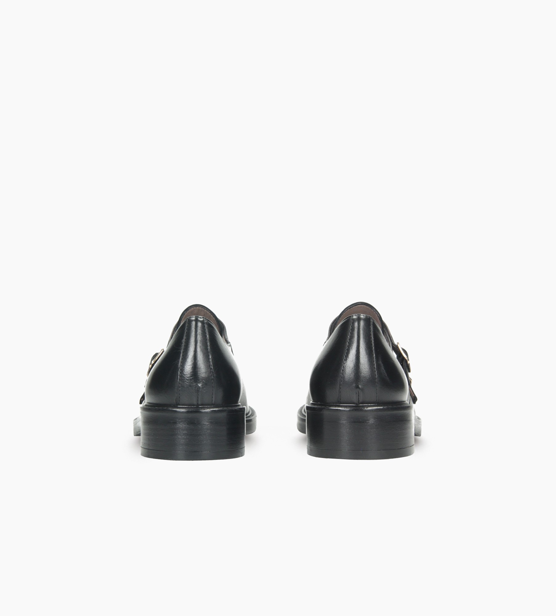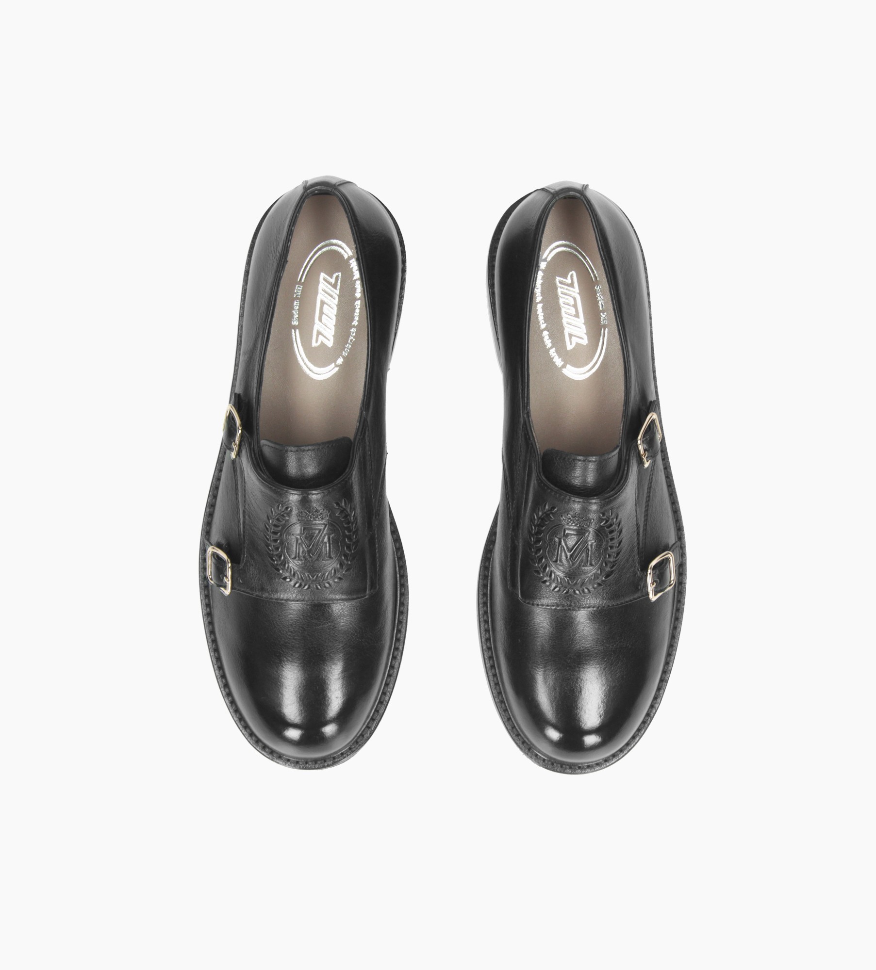 Czarne półbuty damskie wykonane są z wysokiej jakości skóry cielęcej, która nadaje im elegancki wygląd. Charakterystycznym elementem tego modelu jest subtelna, ale efektowna wytłoczona dekoracja na języku, dodająca butom unikalnego stylu. Dodatkowo, po bokach znajdują się dwie ozdobne klamry, które wprowadzają wyrafinowany akcent, jednocześnie podkreślając nowoczesny design. To idealny wybór na formalne, jak i casualowe stylizacje, gwarantujący komfort noszenia i wyjątkowy wygląd.