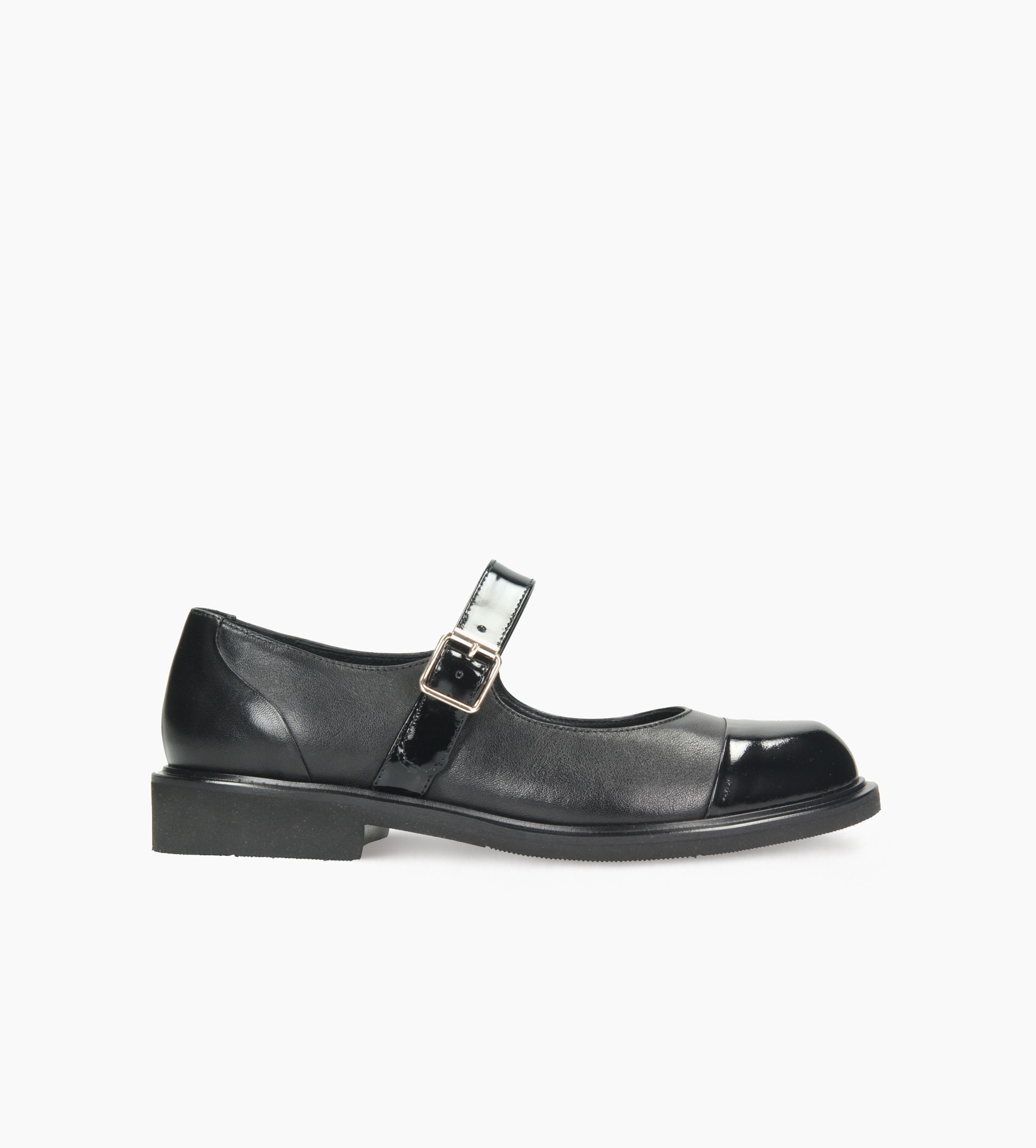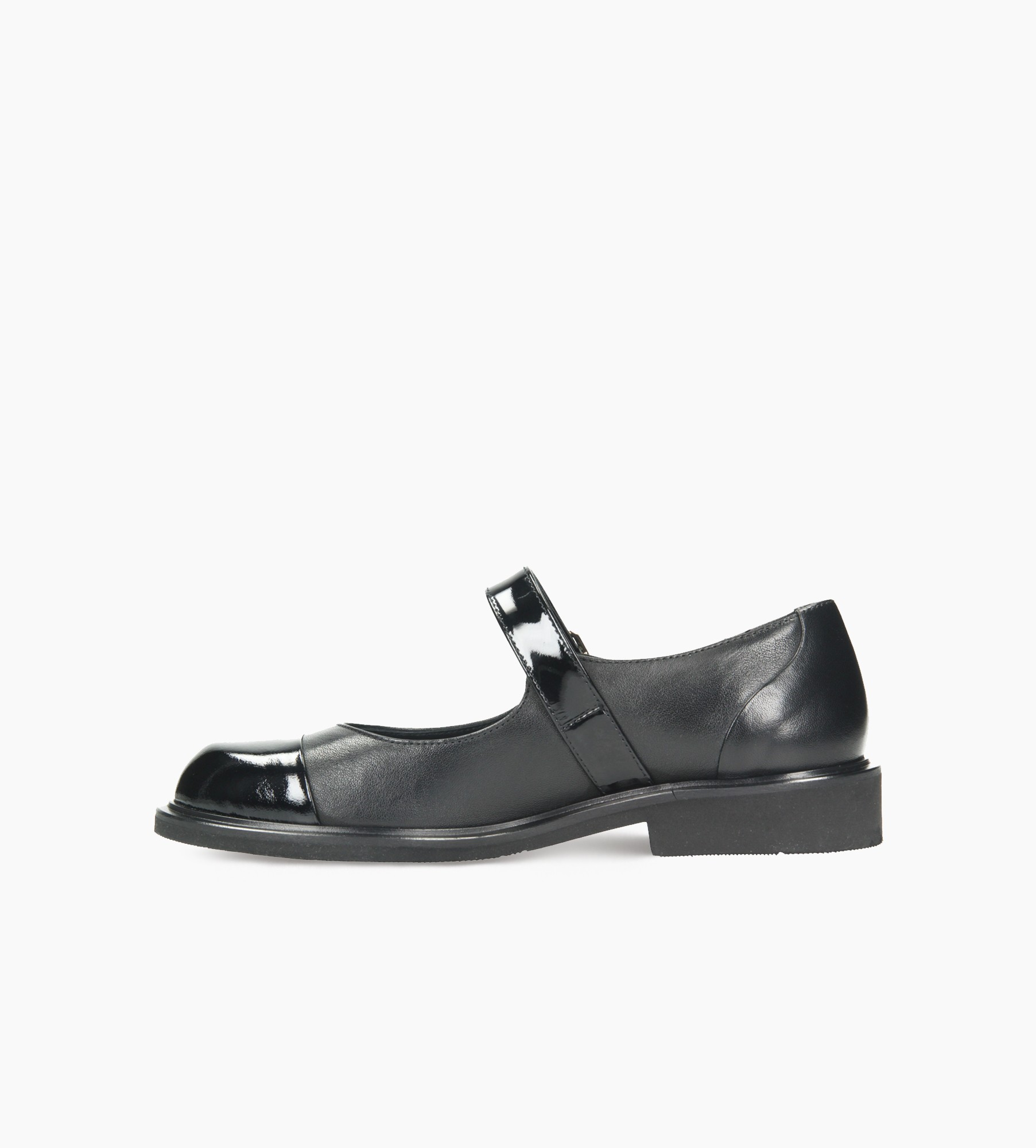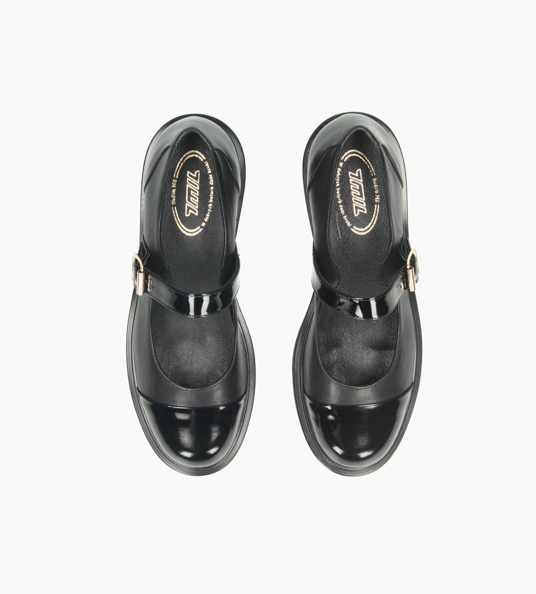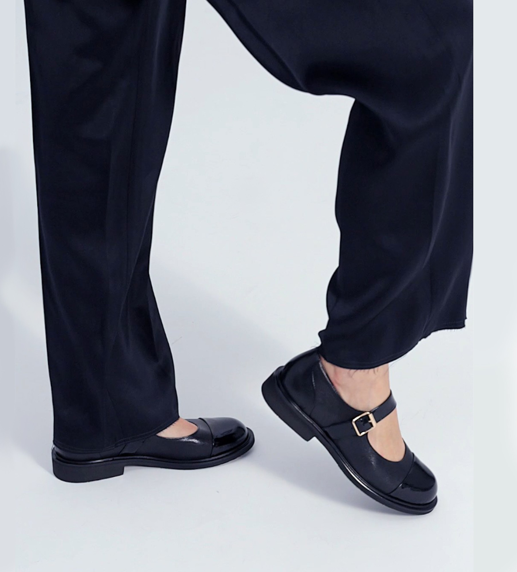 Czarne półbuty damskie w połączeniu gładkiej skóry licowej z lakierowanymi akcentami na nosku i pasku nadaje im unikalnego charakteru, podkreślając ich klasyczny, a jednocześnie nowoczesny wygląd. Model został wyposażony w regulowany pasek z subtelną klamerką, który gwarantuje doskonałe dopasowanie i podtrzymanie stopy, a niski, stabilny obcas zapewnia komfort noszenia przez cały dzień. Wnętrze buta, wyściełane delikatną, oddychającą skórą naturalną, zwiększa wygodę, czyniąc je idealnym wyborem zarówno na co dzień, jak i na bardziej formalne okazje.