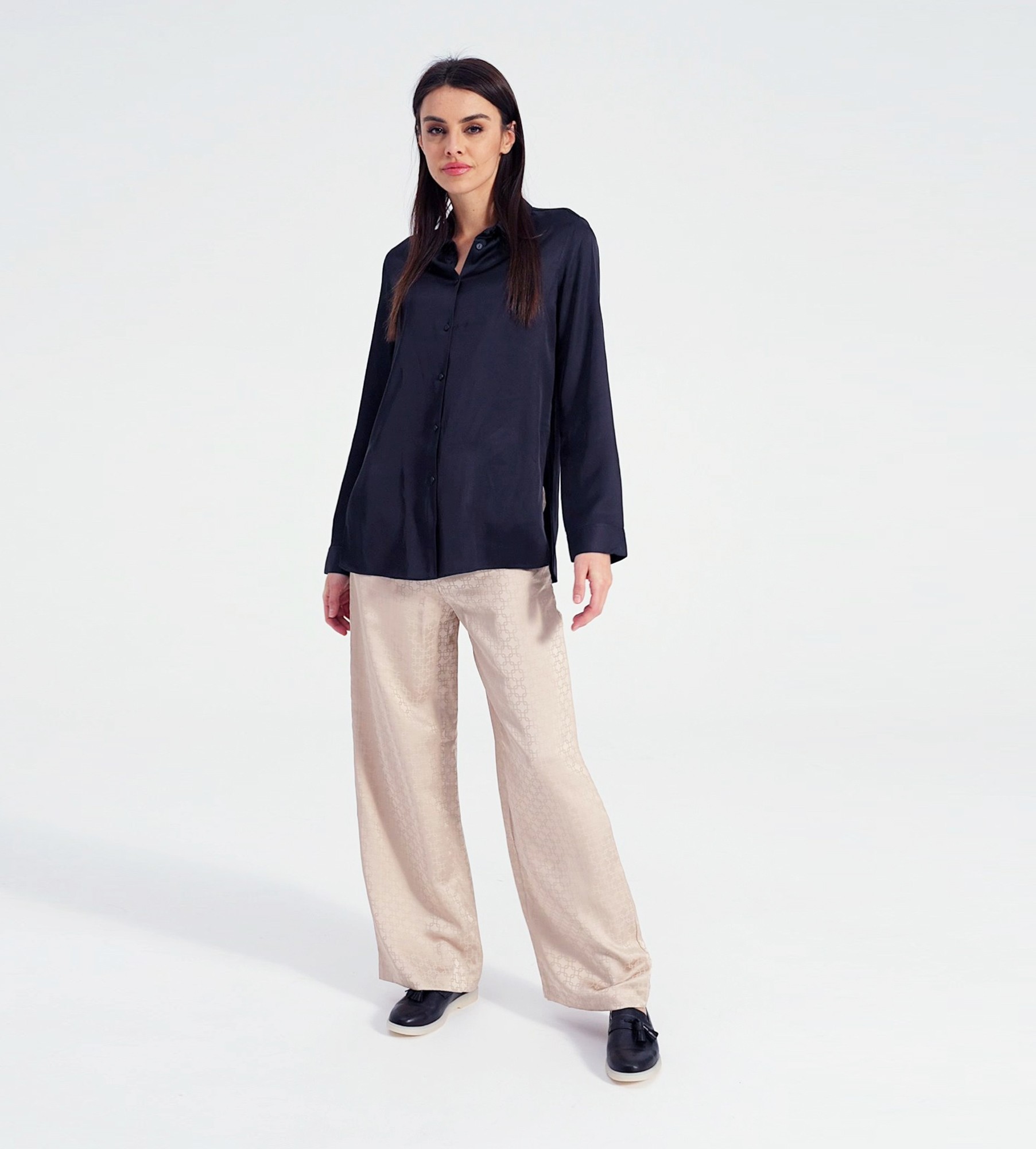 Postaw na proste, jasne jeansy o kroju straight leg i połącz je z dopasowanym golfem lub cienkim swetrem z dekoltem w łódkę w odcieniu écru lub beżu. Aby dodać stylizacji wyrafinowanego charakteru, narzuć oversizową marynarkę w kolorze gołębiej szarości lub granatu. Czarne półbuty z jasną podeszwą przełamią monochromatyczny look, dodając mu lekkości. Całość uzupełnij skórzaną listonoszką i minimalistyczną złotą biżuterią.