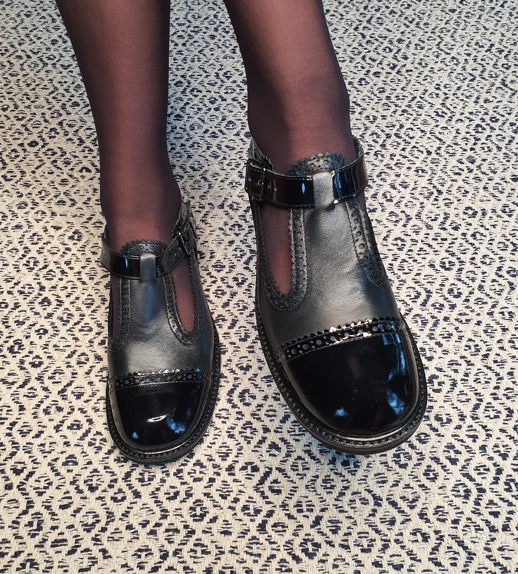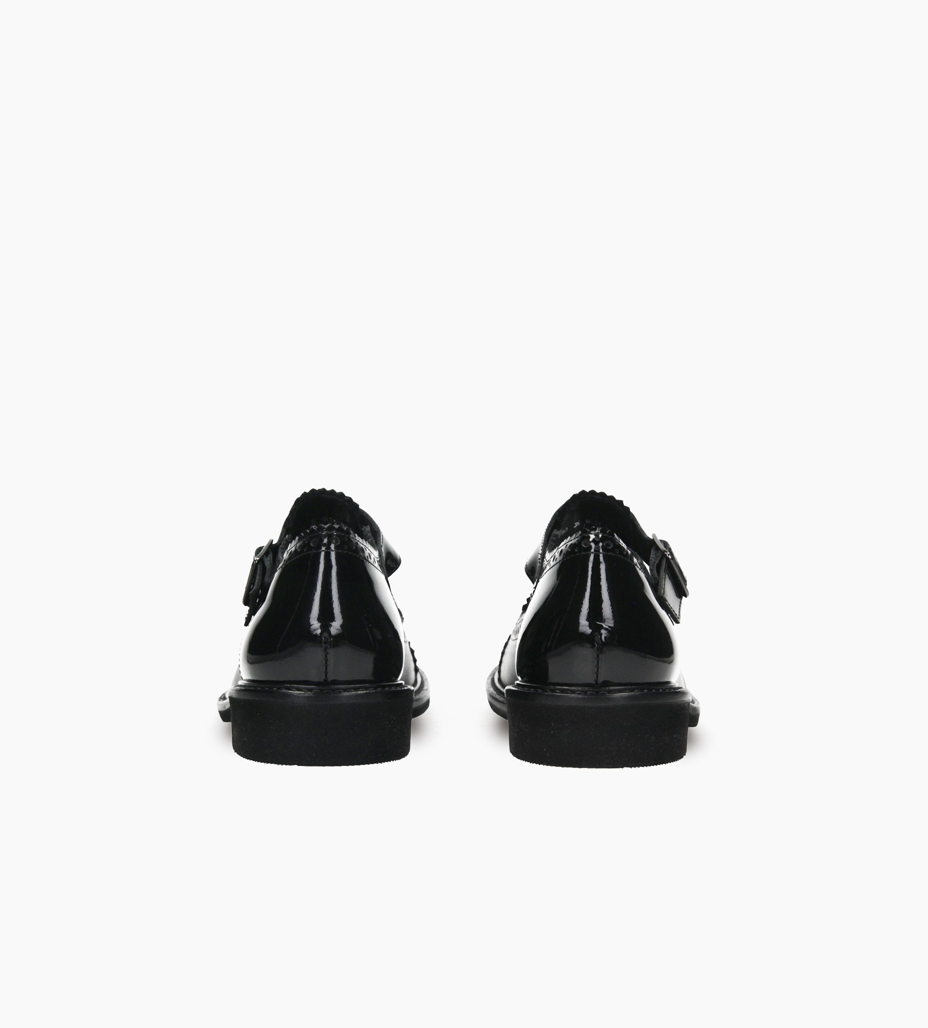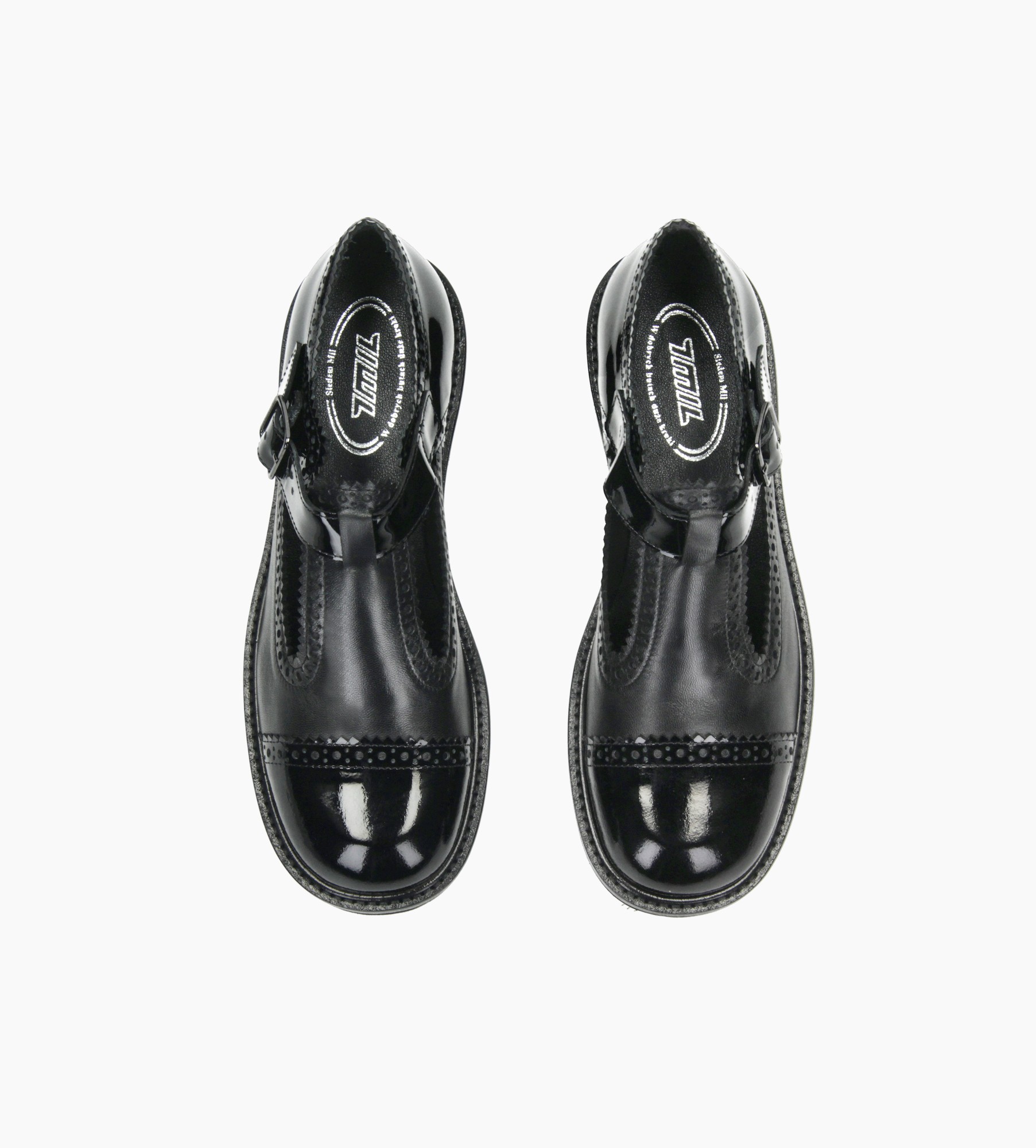 Eleganckie i wyraziste półbuty damskie wykonane z wysokiej jakości naturalnej skóry, w efektownym połączeniu matowego i lakierowanego wykończenia. Wnętrze wyściełane miękką skórą jagnięcą zapewnia wyjątkowy komfort noszenia przez cały dzień. Model charakteryzuje się subtelnym, dekoracyjnym wzorem perforacji oraz kontrastowym, błyszczącym noskiem i paskiem, które dodają całości charakteru. Zapięcie na kostce w formie sprzączki pozwala na doskonałe dopasowanie i stabilizację stopy.