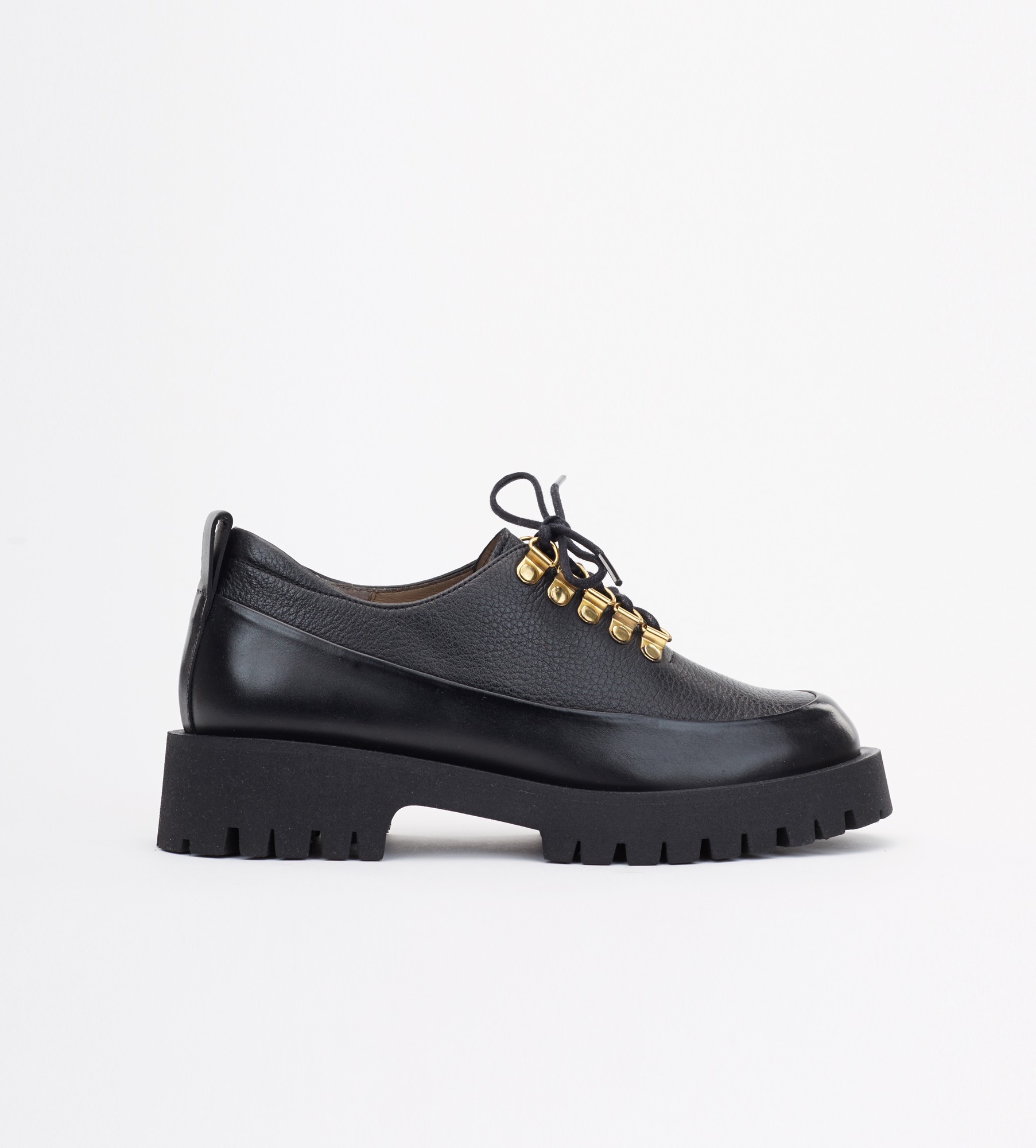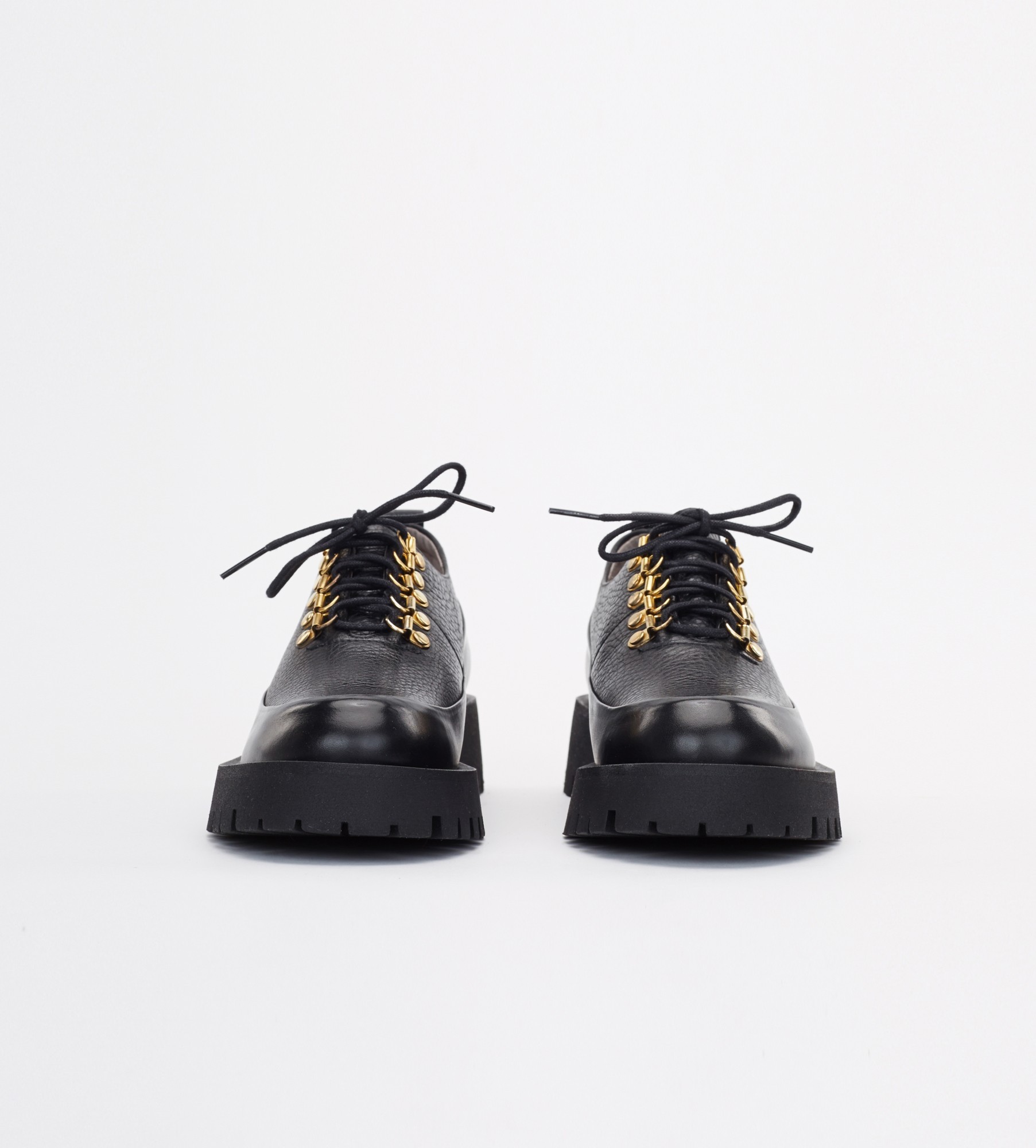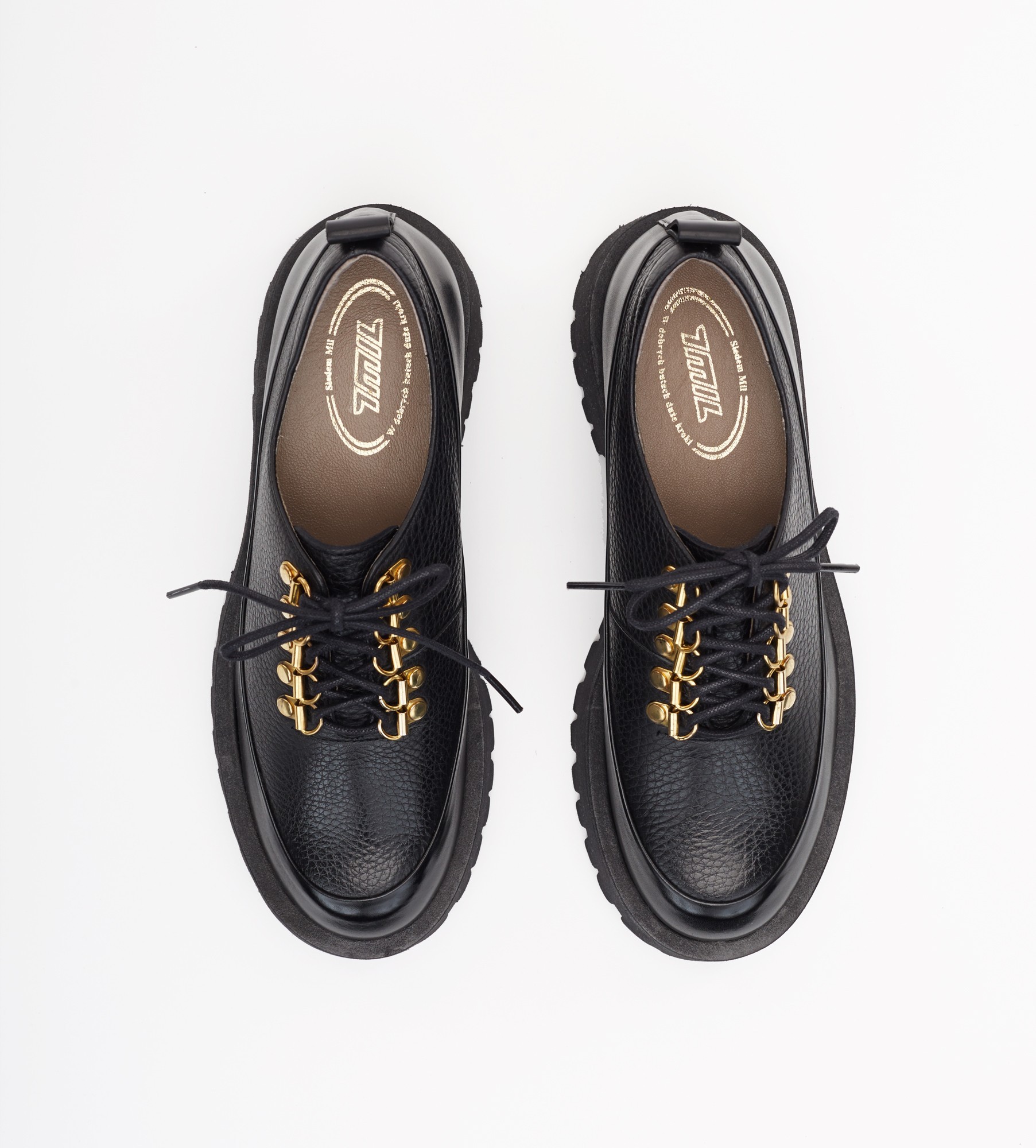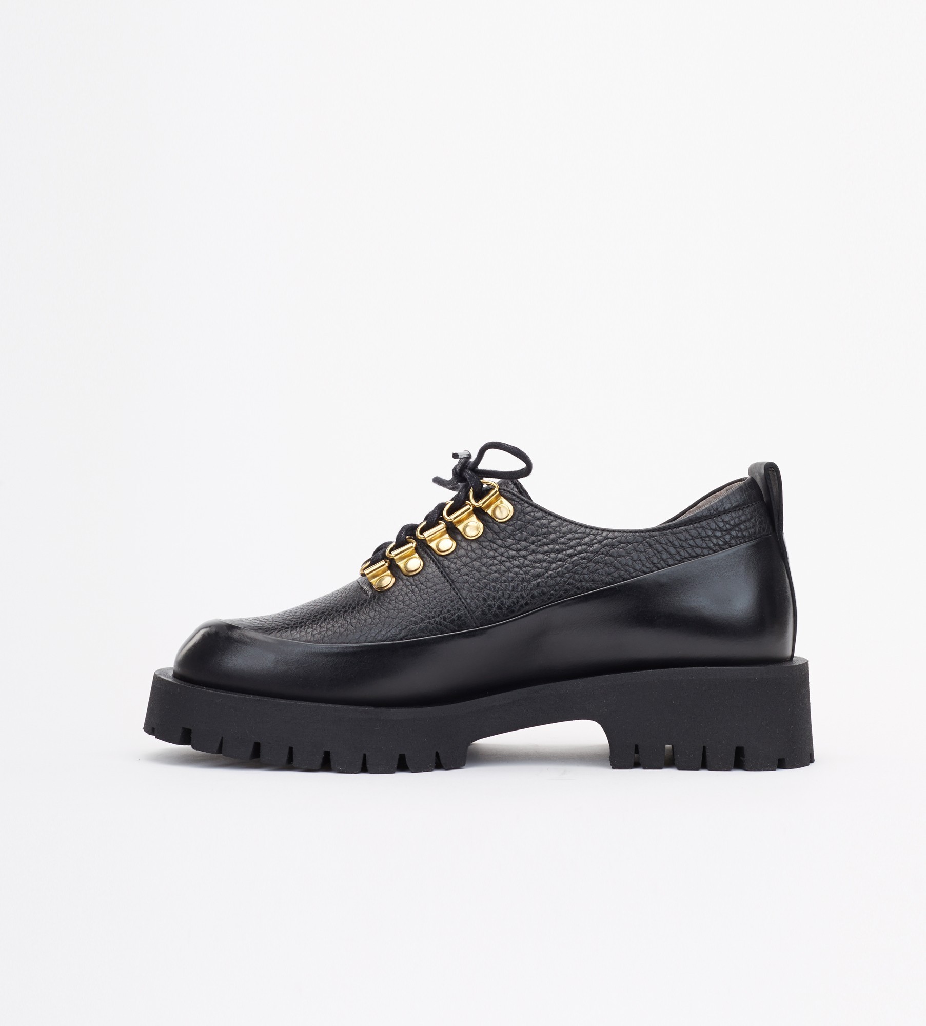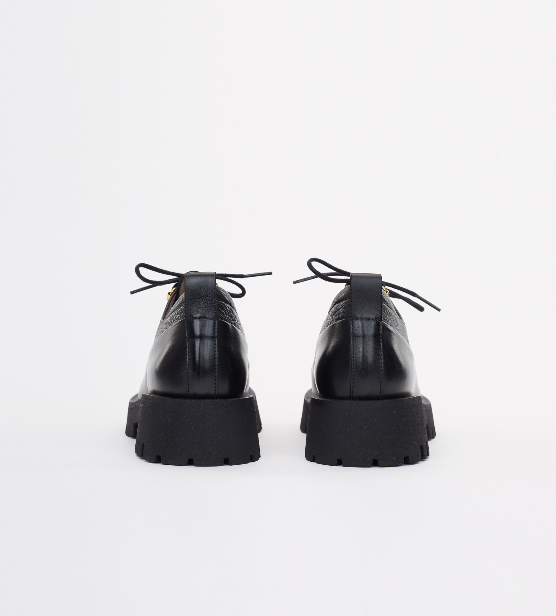 Czarne półbuty damskie z naturalnej skóry cielęcej to stylowa propozycja dla kobiet ceniących komfort i klasę. Charakteryzują się ryflowaną podeszwą i delikatnym wiązaniem ze złotymi oczkami. Wnętrze butów wyłożone jest miękką skórą jagnięcą, co zapewnia wyjątkową wygodę przez cały dzień. Amortyzująca grubsza podeszwa dodaję dodatkowej wygody i elegancji. Idealne do codziennych stylizacji, jak i bardziej formalnych okazji, te buty łączą w sobie funkcjonalność z kobiecym wdziękiem.