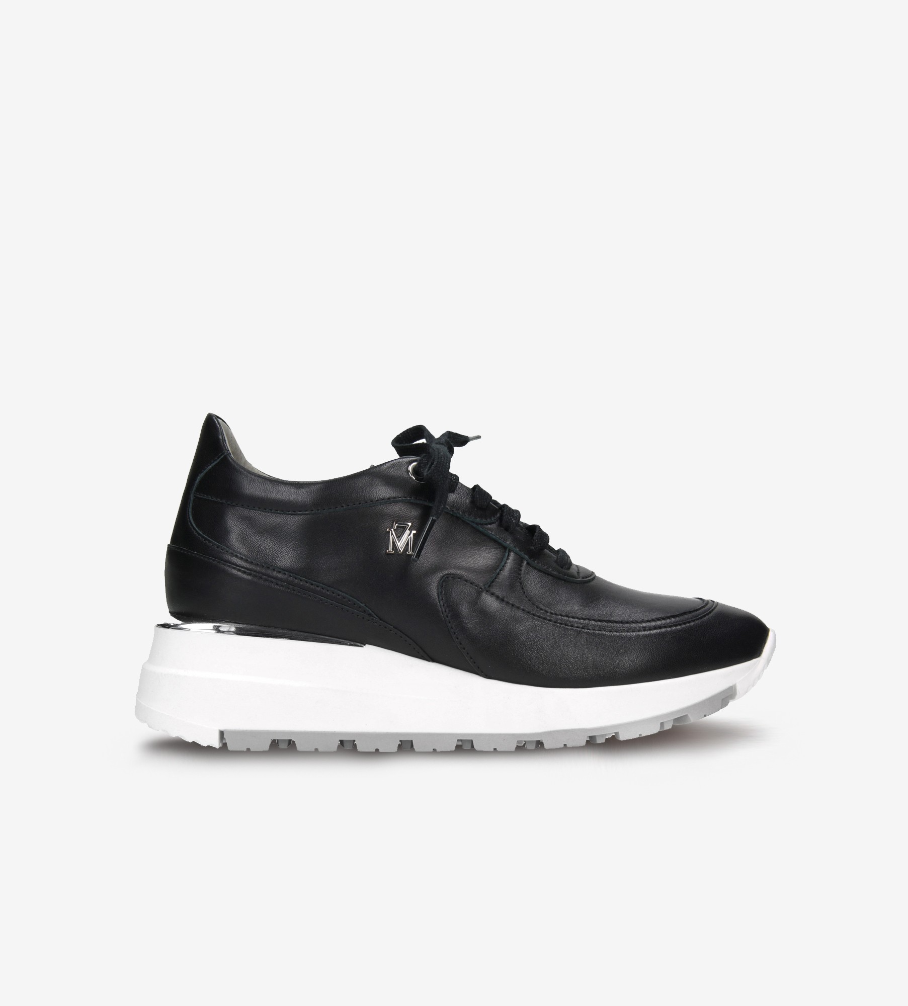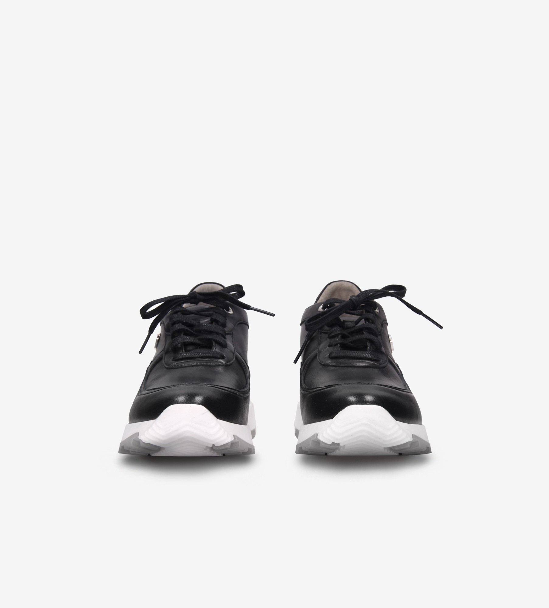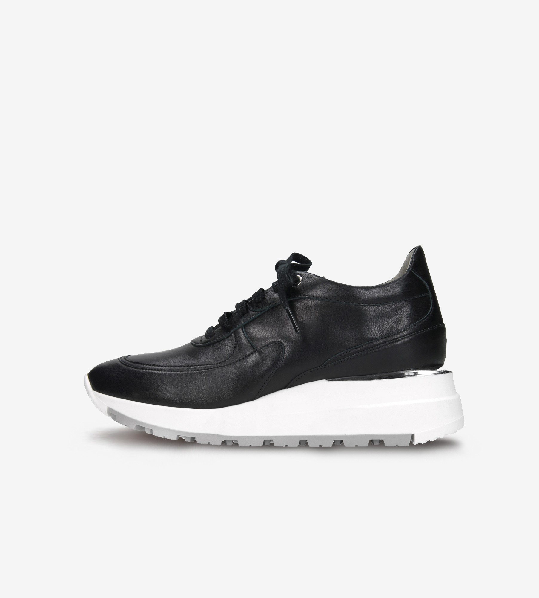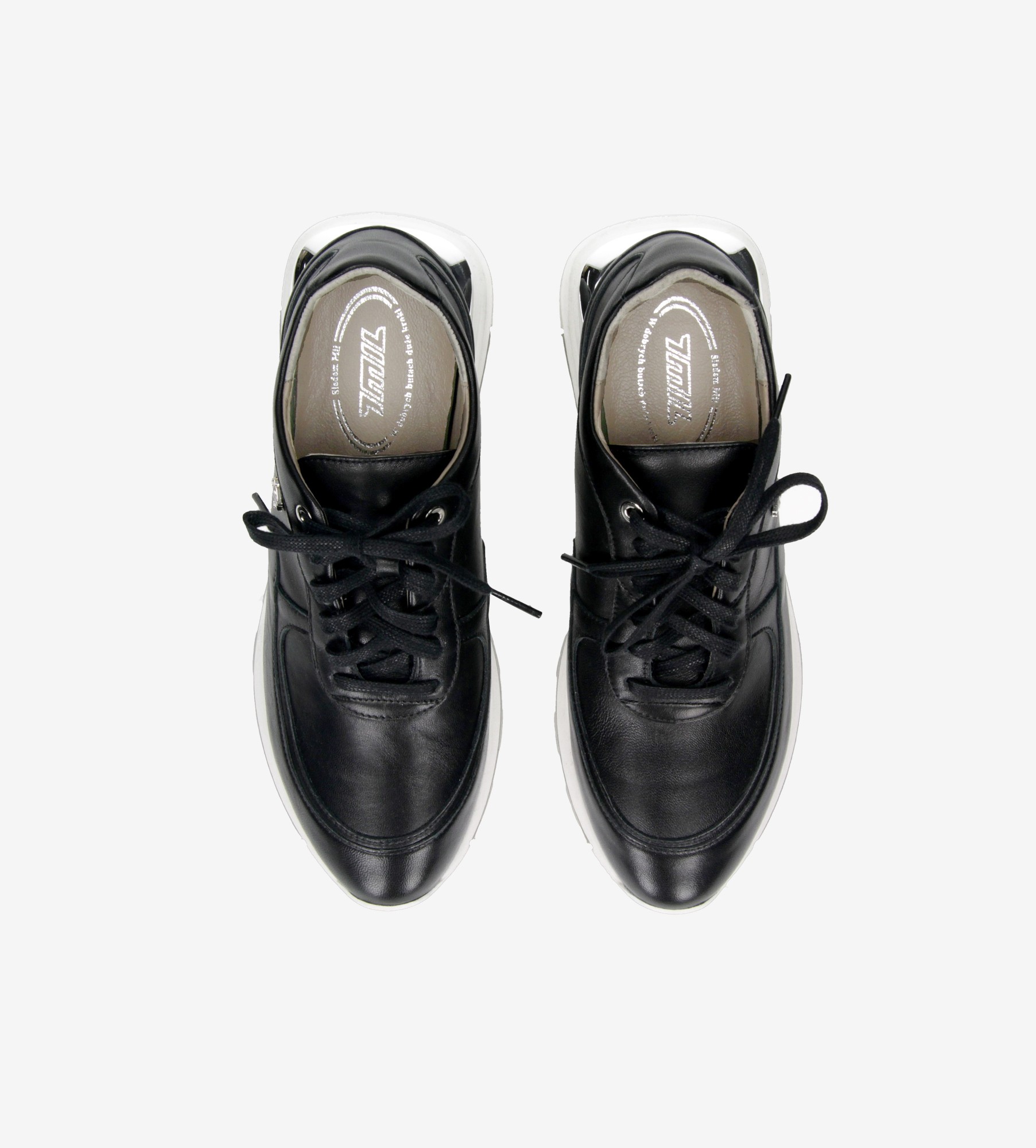 Czarne sneakersy damskie wykonane są z naturalnej skóry licowej. Wnętrze i wkładka są ze skóry jagnięcej, zapewniającej komfort noszenia. Wkładka jest higroskopijna, co pomaga stopom odychać. Sneakersy mają wysokość obcasa 4 cm. Buty zdobią srebrne nity, co dodaje im elegancji i nowoczesnego wyglądu. Idealne do codziennego użytku, łączą w sobie styl i wygodę.