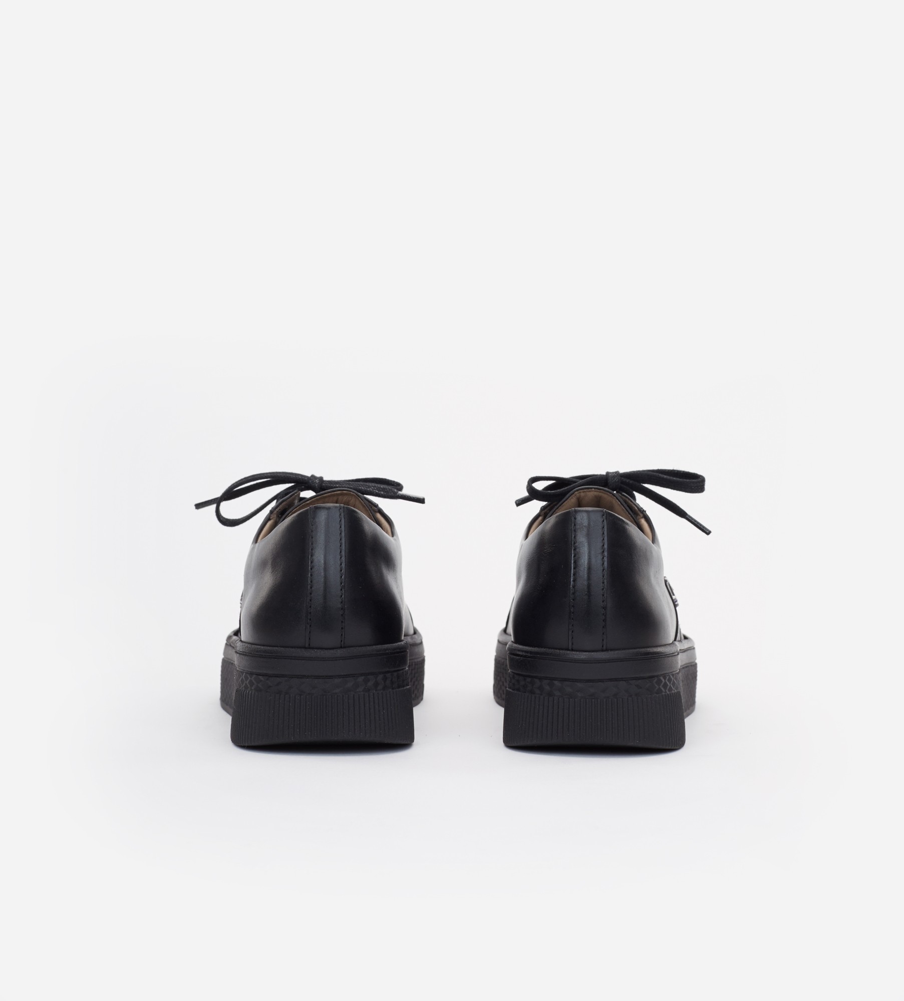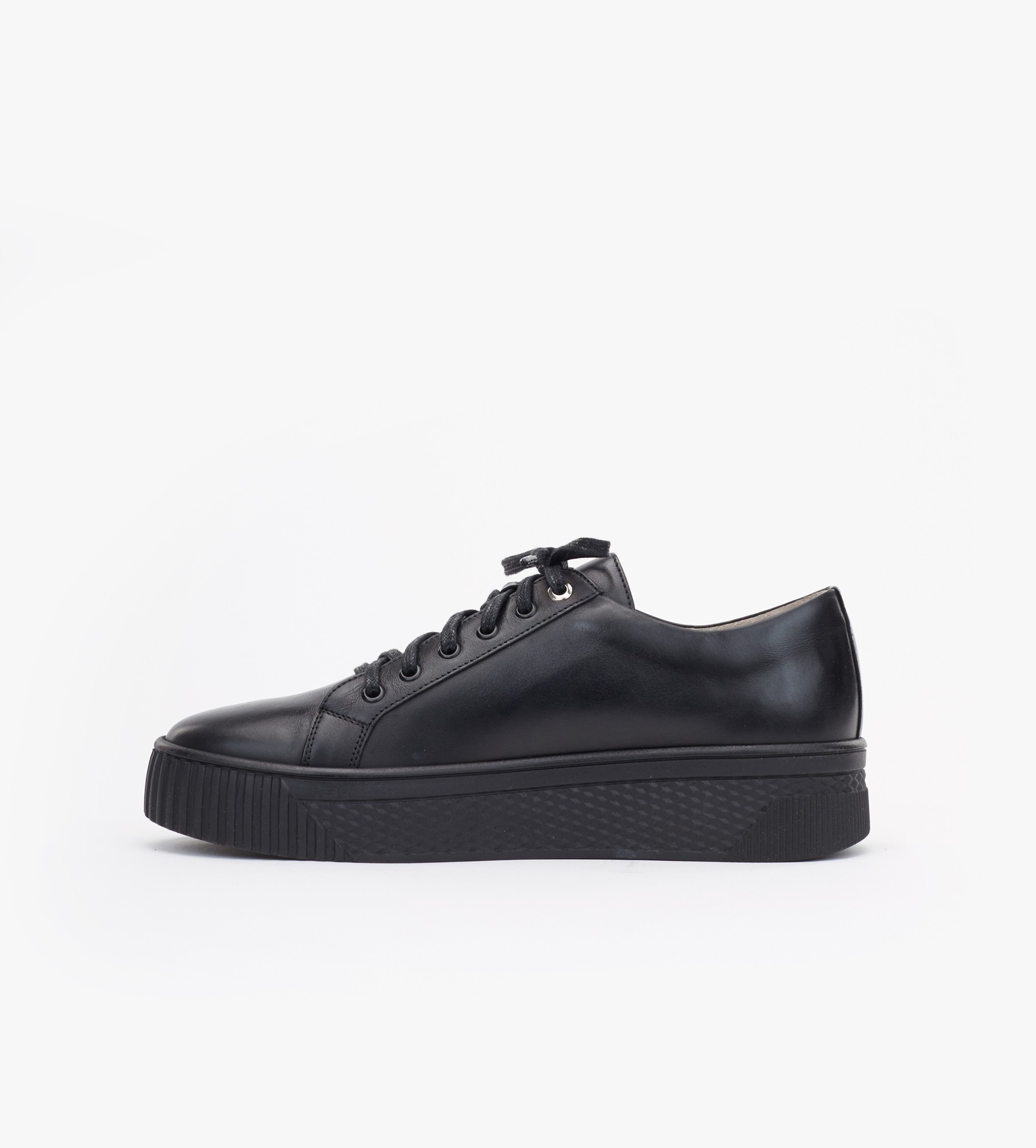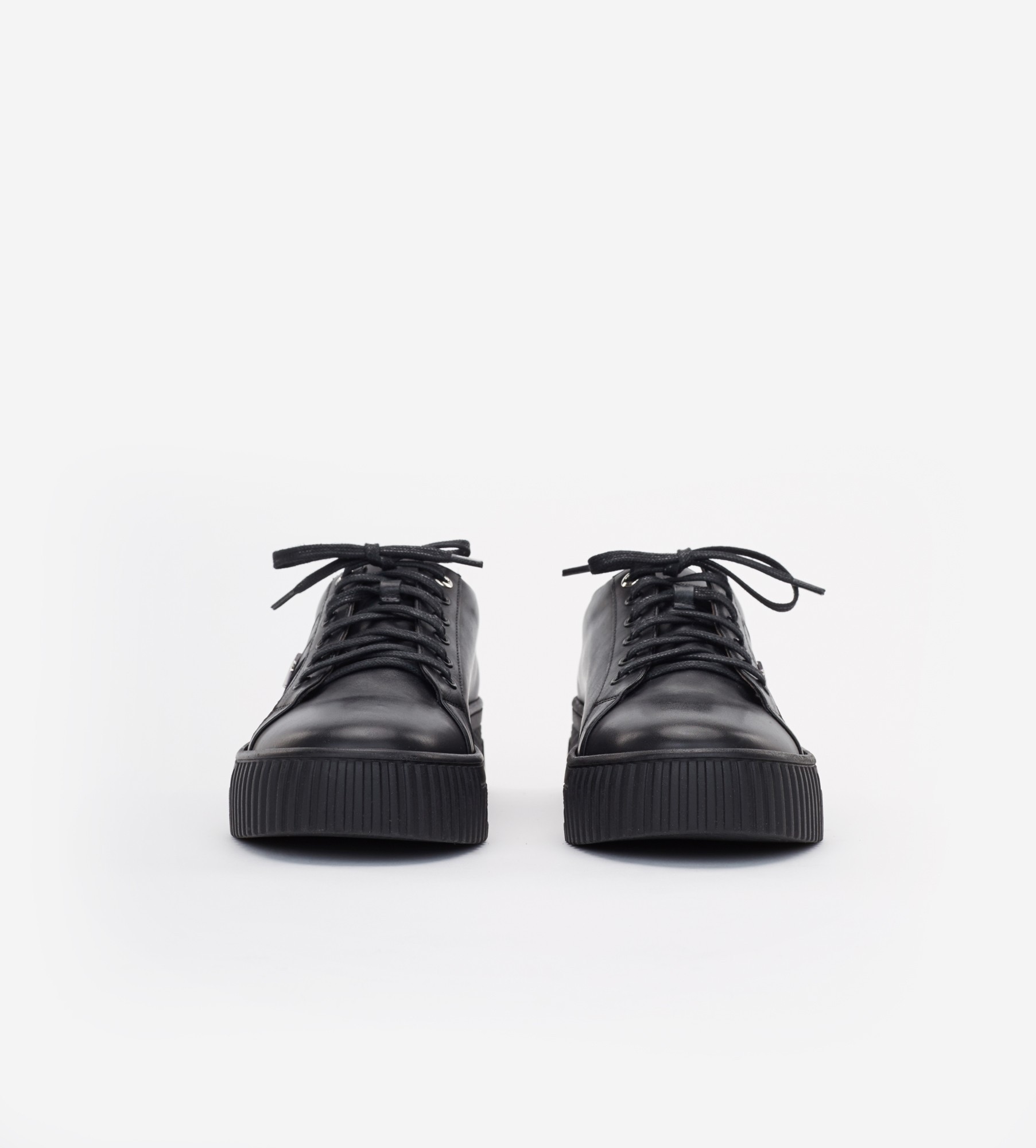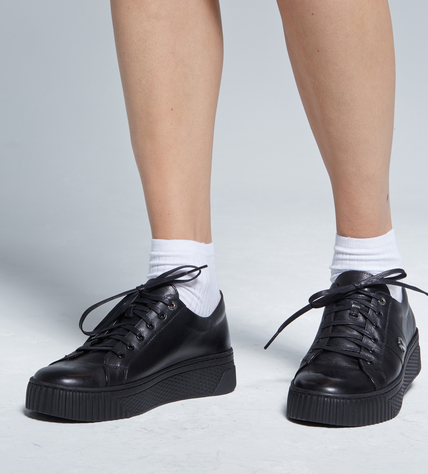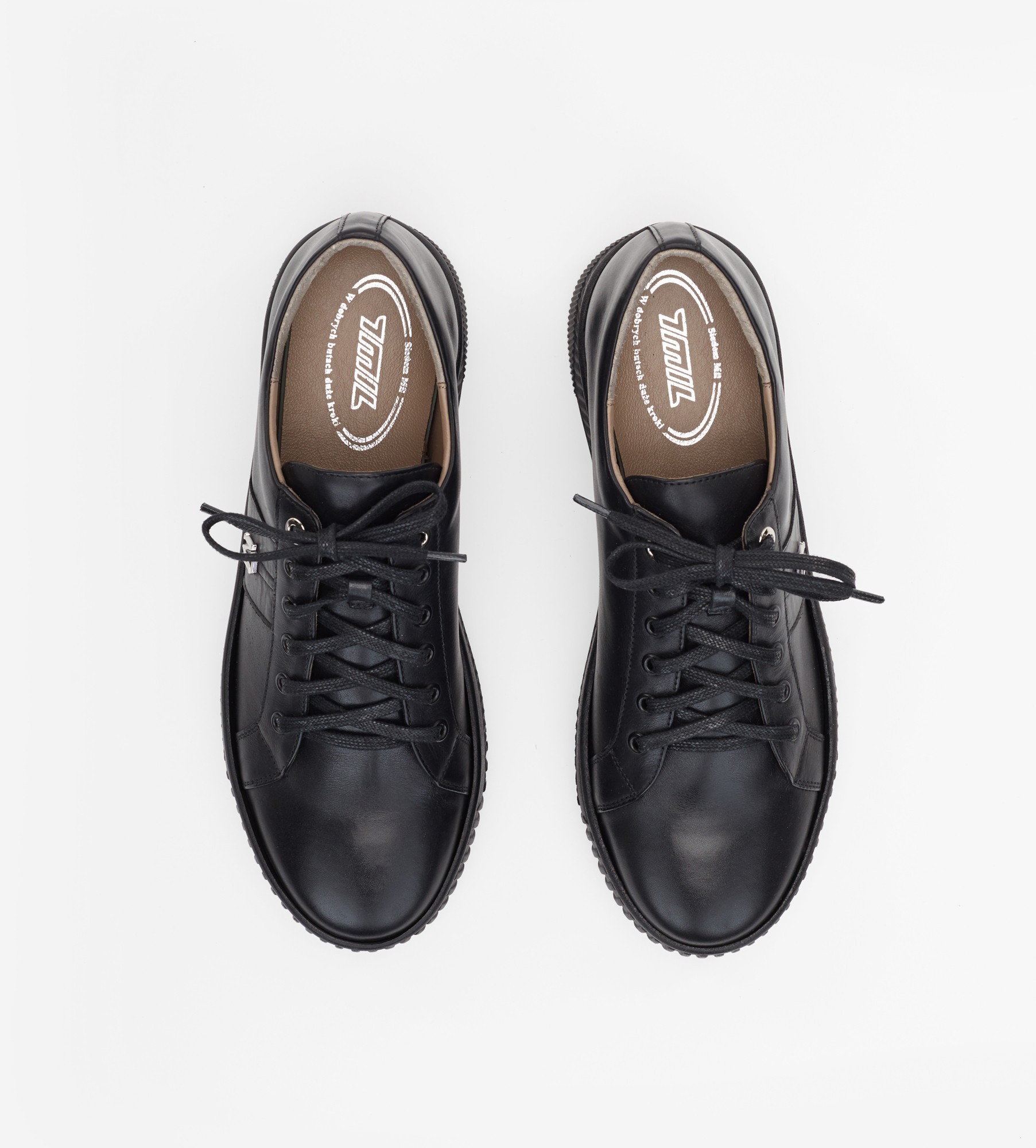Czarne skórzane sneakersy wykonane z naturalnej skóry licowej, casualowe buty to połączenie wygody i wysmakowanej estetyki. Perforowana, gruba podeszwa, która ma właściwości odprowadzające wilgoć dodają charakteru butom, jednocześnie pozostając w harmonii z całością. Minimalistyczna stylistyka jest podkreślana przez proste szwy i wykończenia i delikatny nit z logo 7Mil.