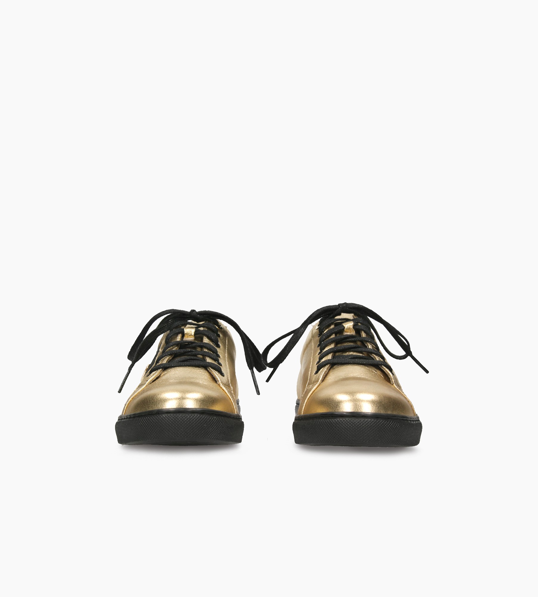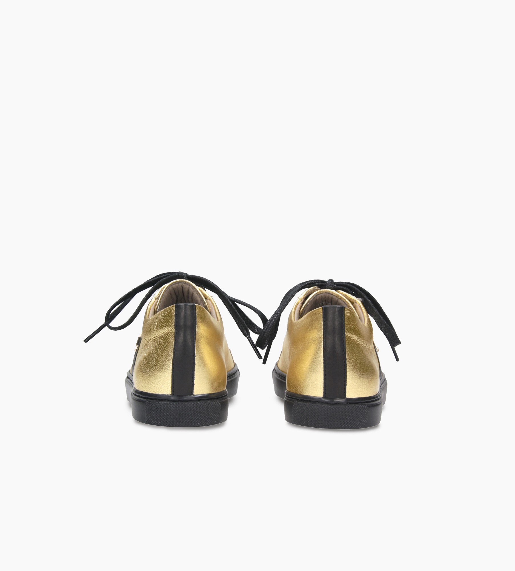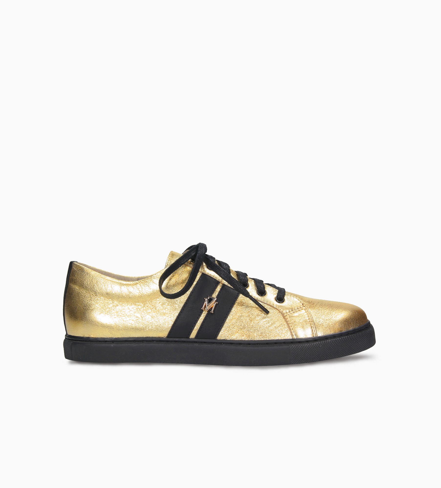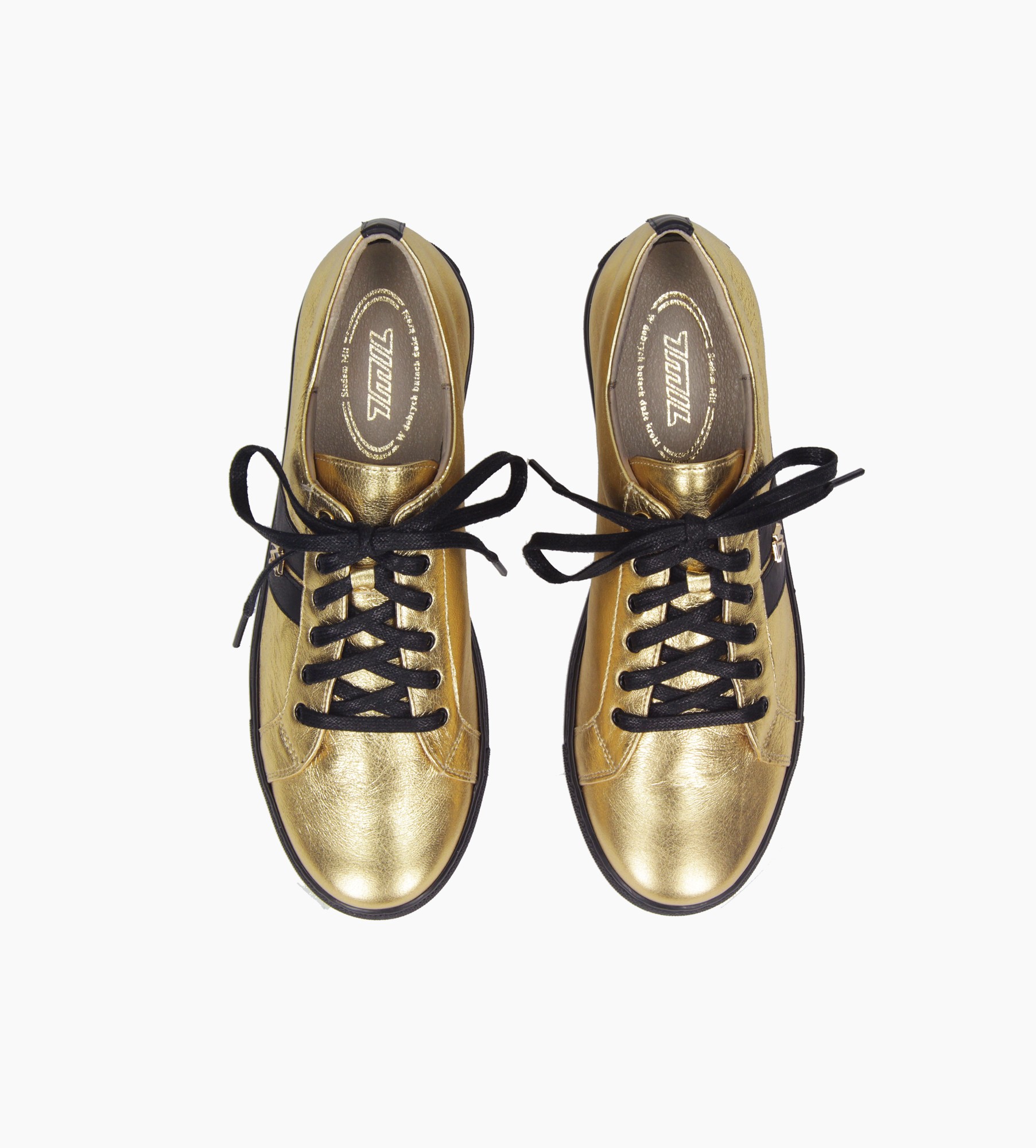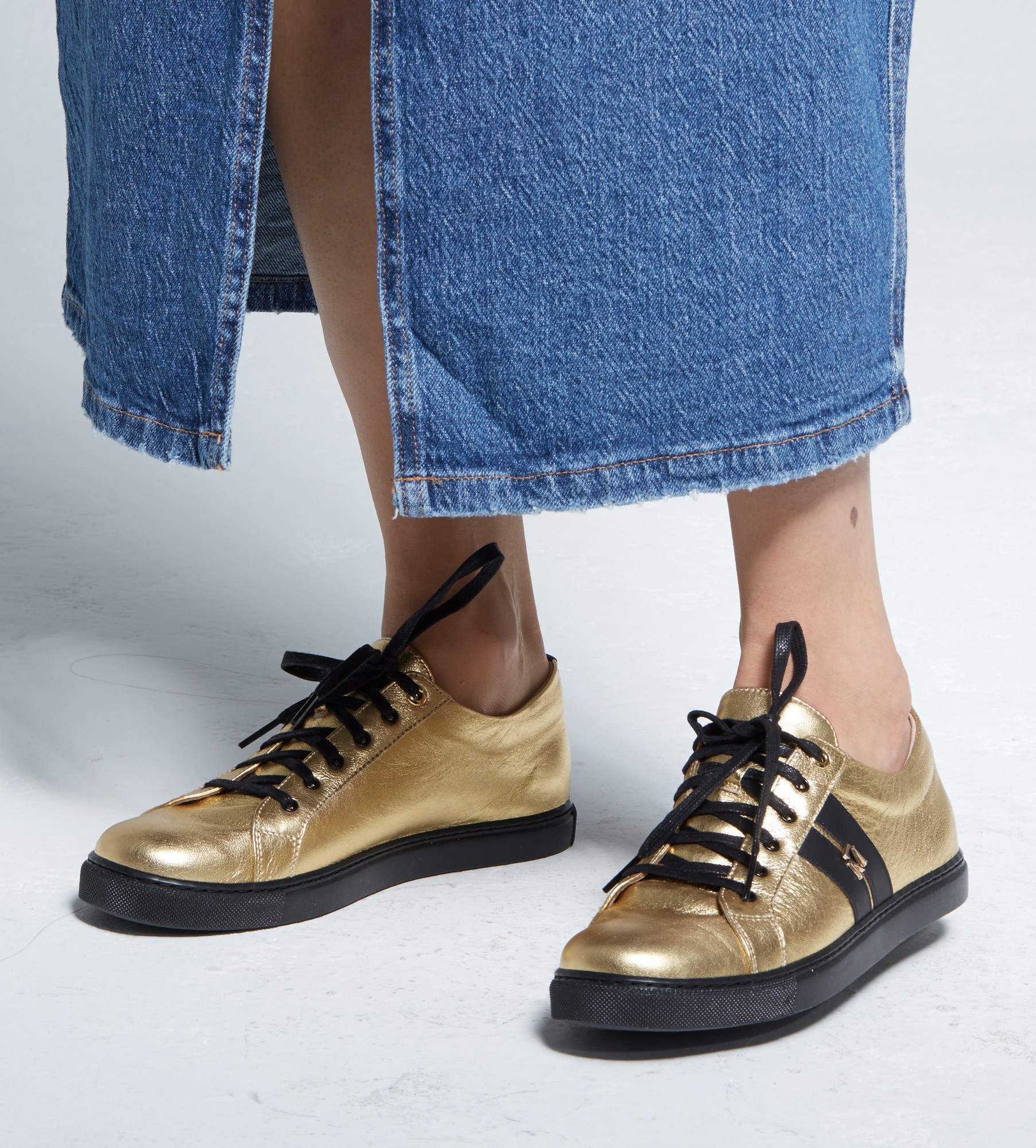 Złote trampki wykonane z wysokiej jakości naturalnej skóry licowej to absolutny must have w garderobie aktywnej kobiety, która podąża za bieżącymi trendami. Buty wykonane z wytrzymałej skóry o gładkim licu wyglądają bardzo schludnie i elegancko. Złoty, kolor doskonale komponuje się czarnymi paskami, zgrabny krój cholewki sprawia, że trampki doskonale układają się na stopie i uroczo się na niej prezentują. Wyjątkową wygodę i komfort użytkowania gwarantuje wyściółka z delikatnej i miękkiej w dotyku jagniecej skóry. Lekka, prosta podeszwa powoduje, że buty są praktycznie niewyczuwalne na nodze.