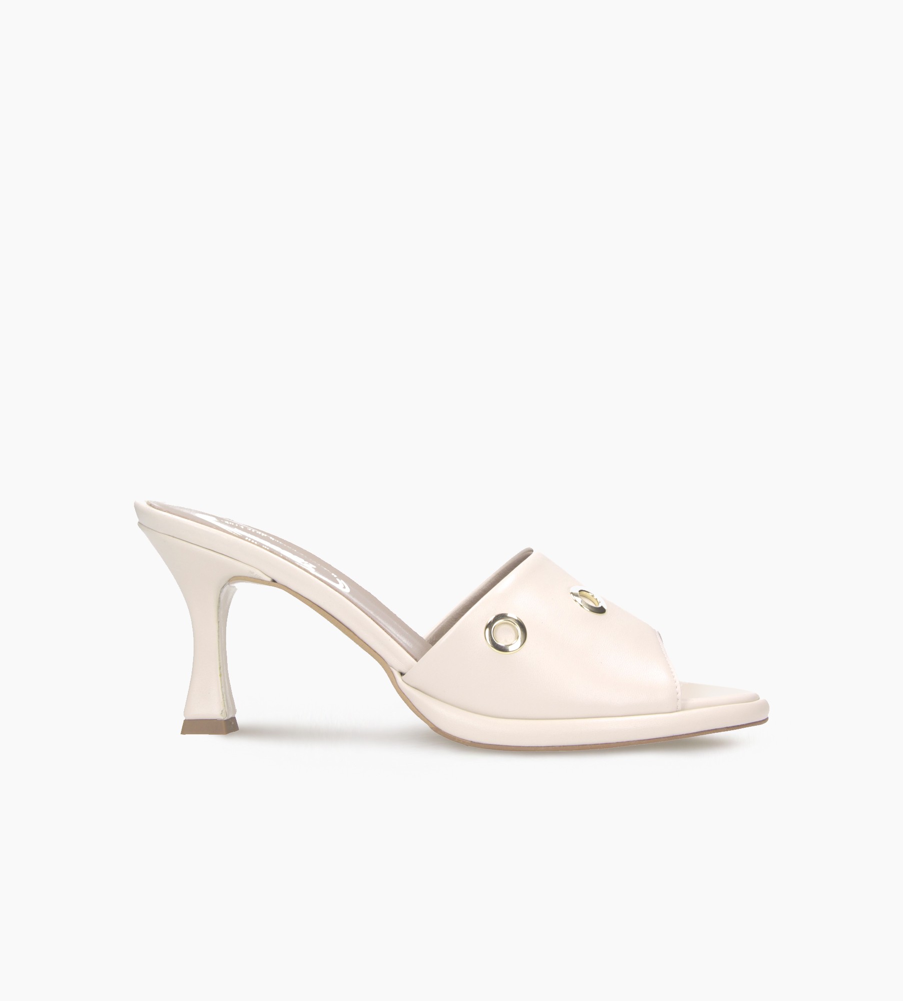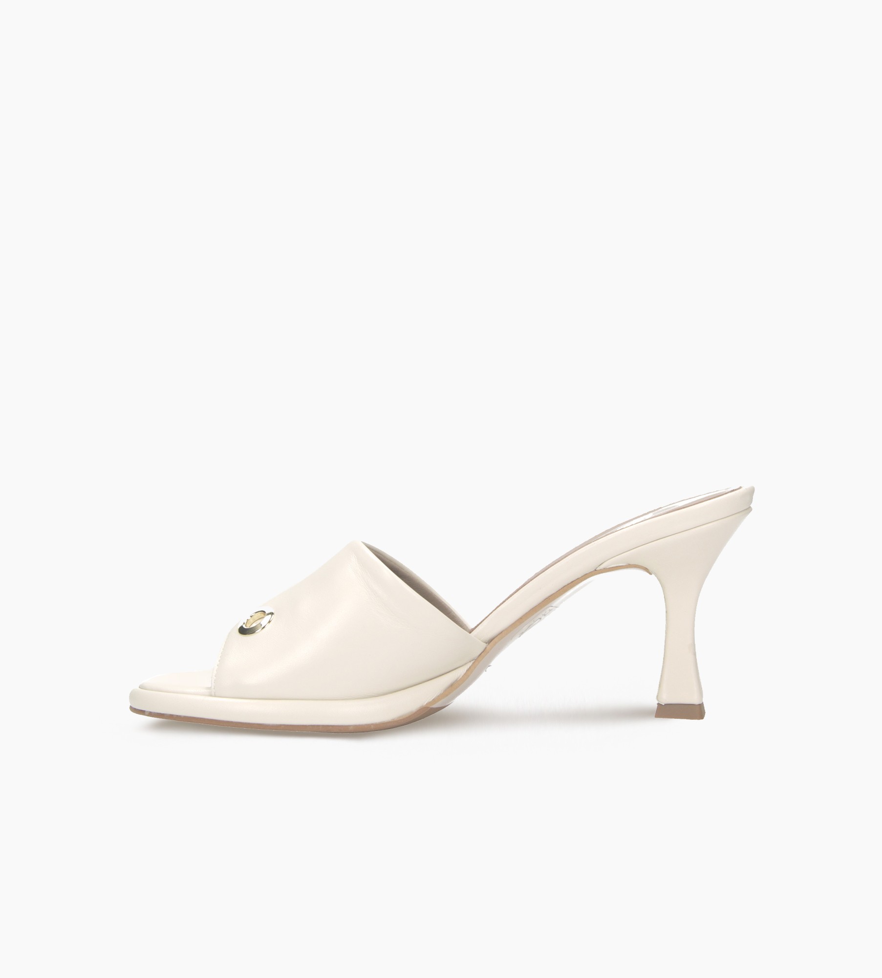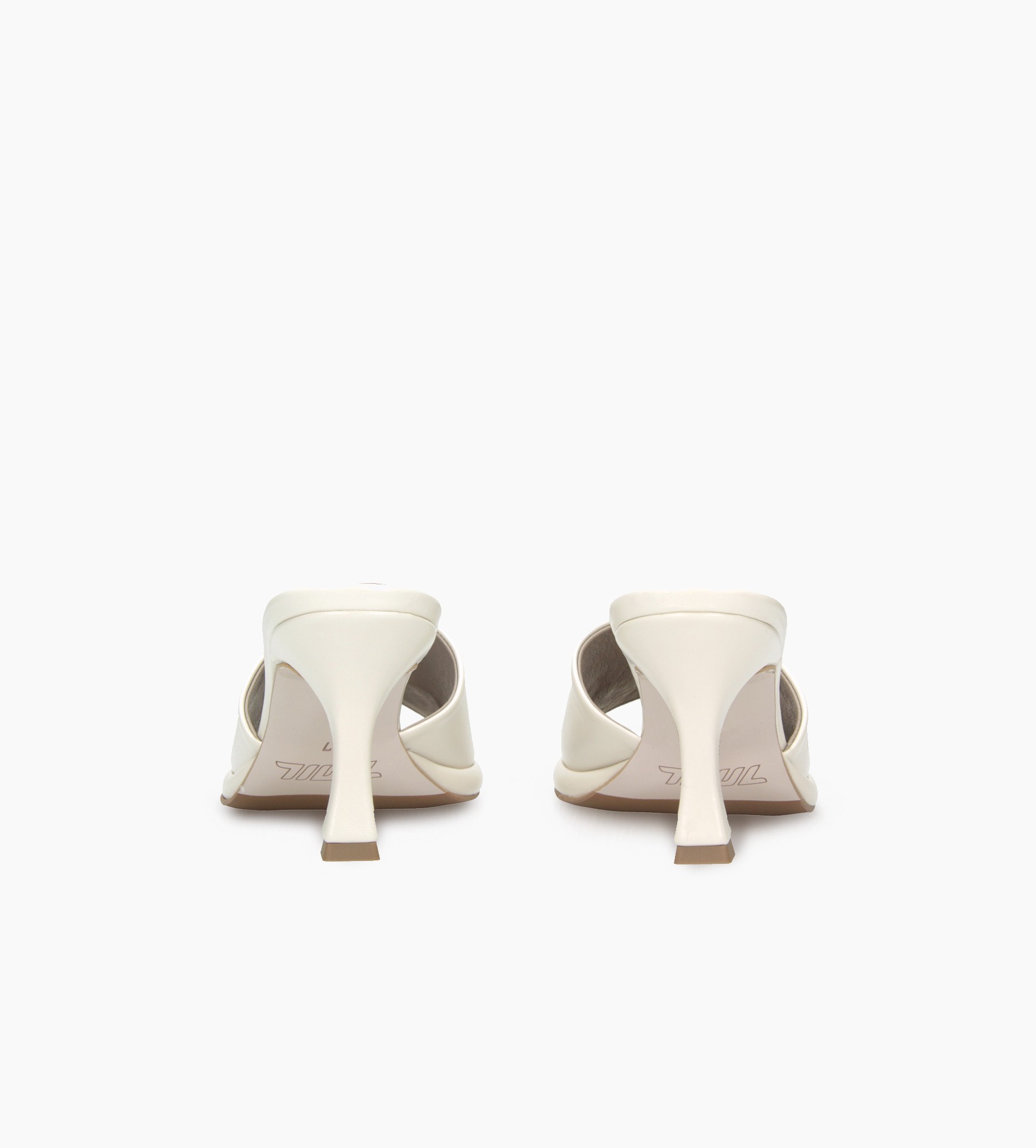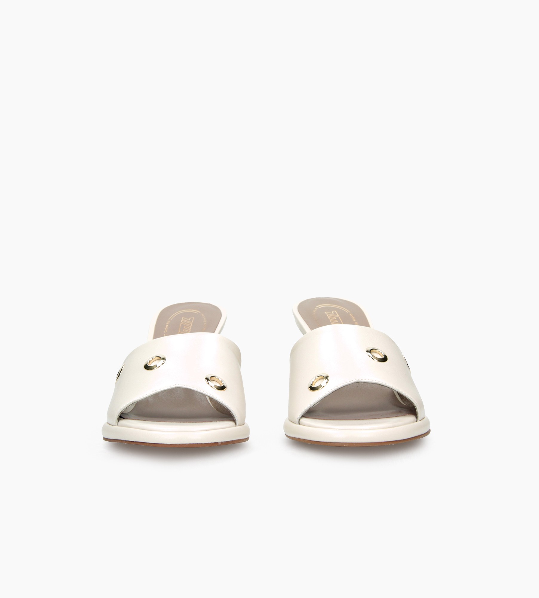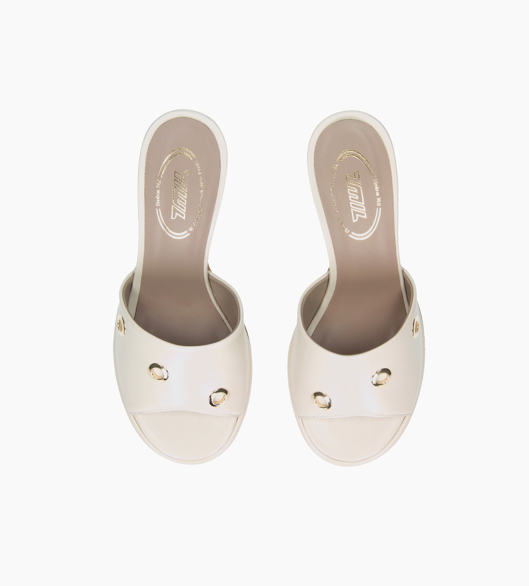 Białe klapki damskie z naturalnej skóry licowej to eleganckie i stylowe obuwie, które doskonale łączy komfort z wyrafinowanym wyglądem. Bardzo wygodny 8 centymetrowy obcas i delikatne detale takie jak ozdobne srebrne koła dodadzą szyku każdej stylizacji. Zaprojektowane z myślą o nowoczesnych kobietach ceniących zarówno estetykę, jak i wygodę, te klapki są idealnym wyborem na letnie dni.