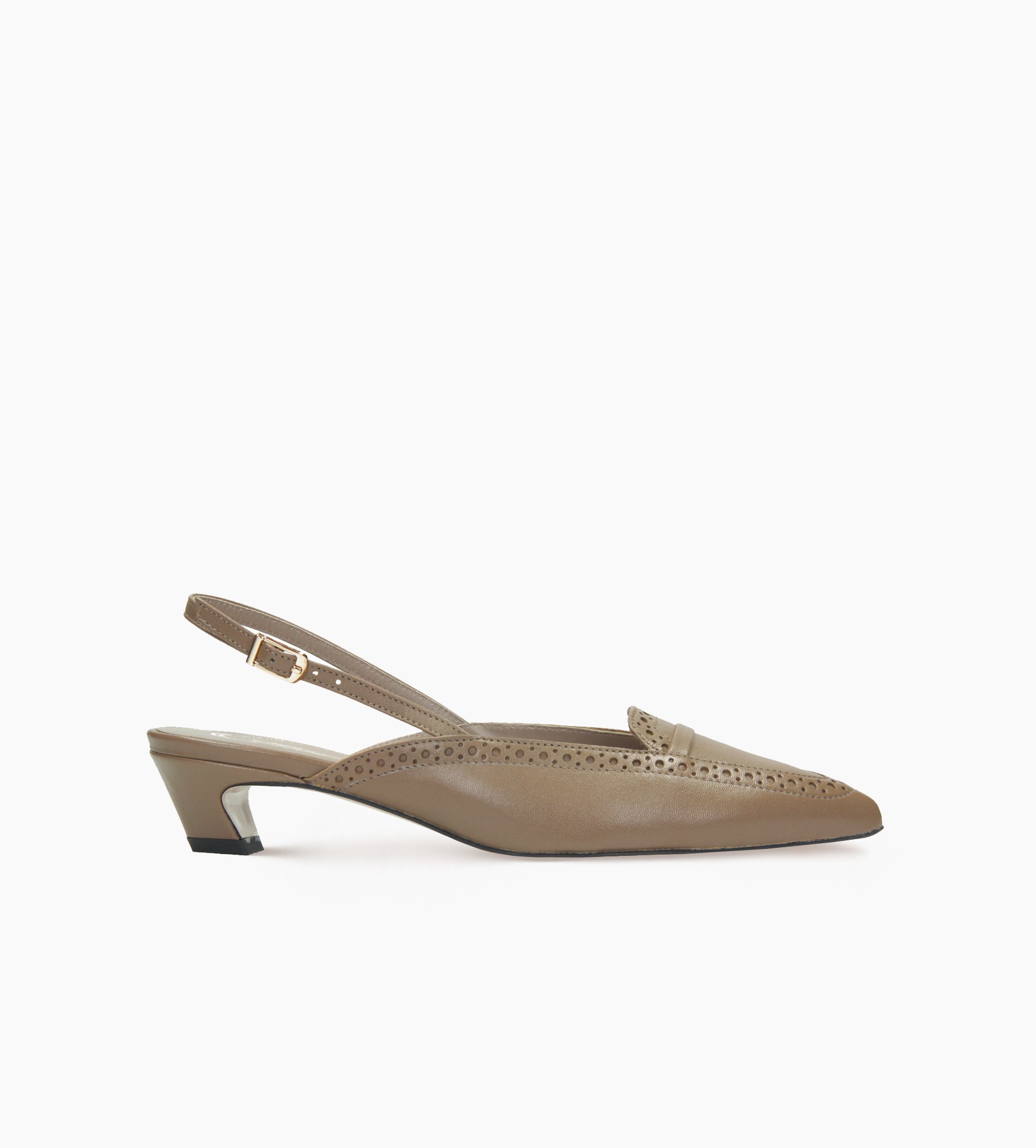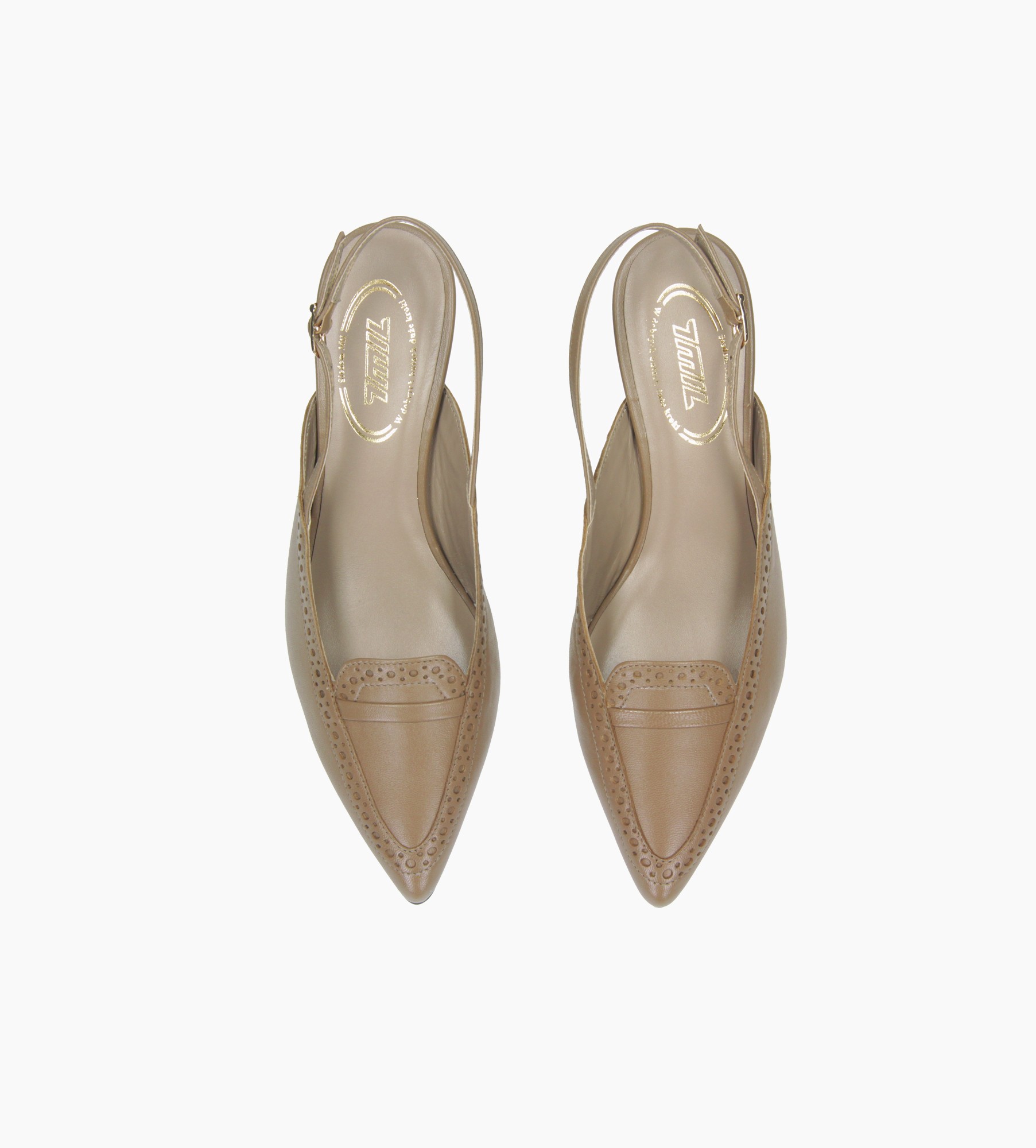 Eleganckie, skórzane sandały damskie w odcieniu ciepłego brązu to idealna propozycja na letnie i wiosenne stylizacje. Model wykonany został z naturalnej skóry licowej, a wewnętrzne wykończenie to miękka i luksusowa skóra jagnięca, zapewniająca wyjątkowy komfort noszenia. Subtelny, niski obcas o modnej linii nie tylko wysmukla sylwetkę, ale także gwarantuje stabilność i wygodę przez cały dzień. Czubek w szpic ozdobiony został klasycznymi perforacjami inspirowanymi stylem brogue, nadającym całości szyku i ponadczasowej klasy. Regulowany pasek wokół pięty umożliwia idealne dopasowanie do stopy. To model, który sprawdzi się zarówno do pracy, jak i na bardziej formalne wyjścia.