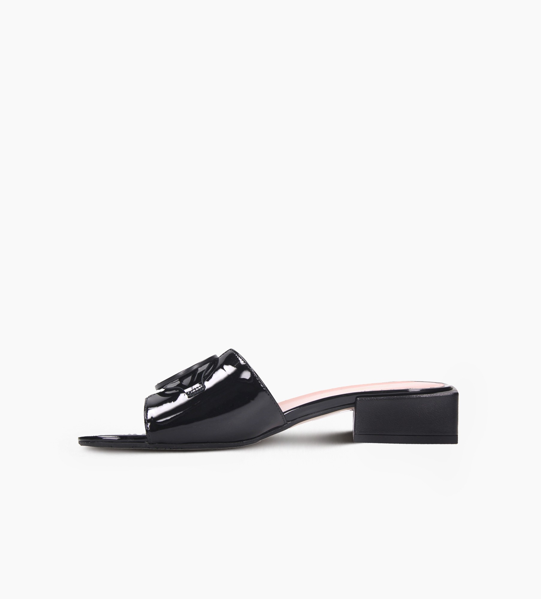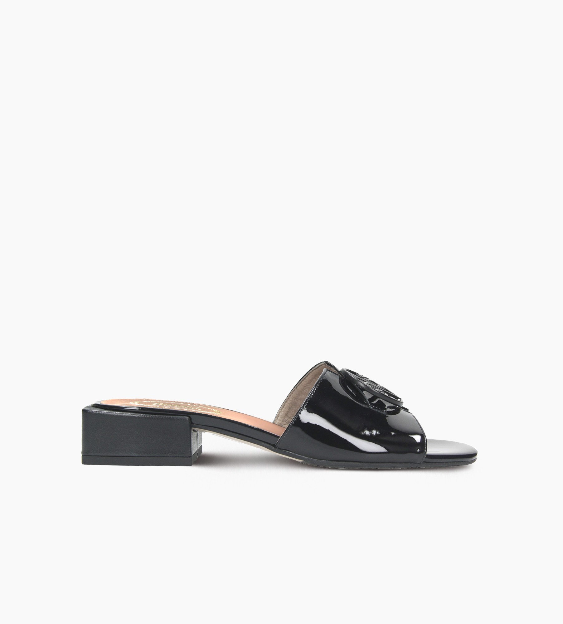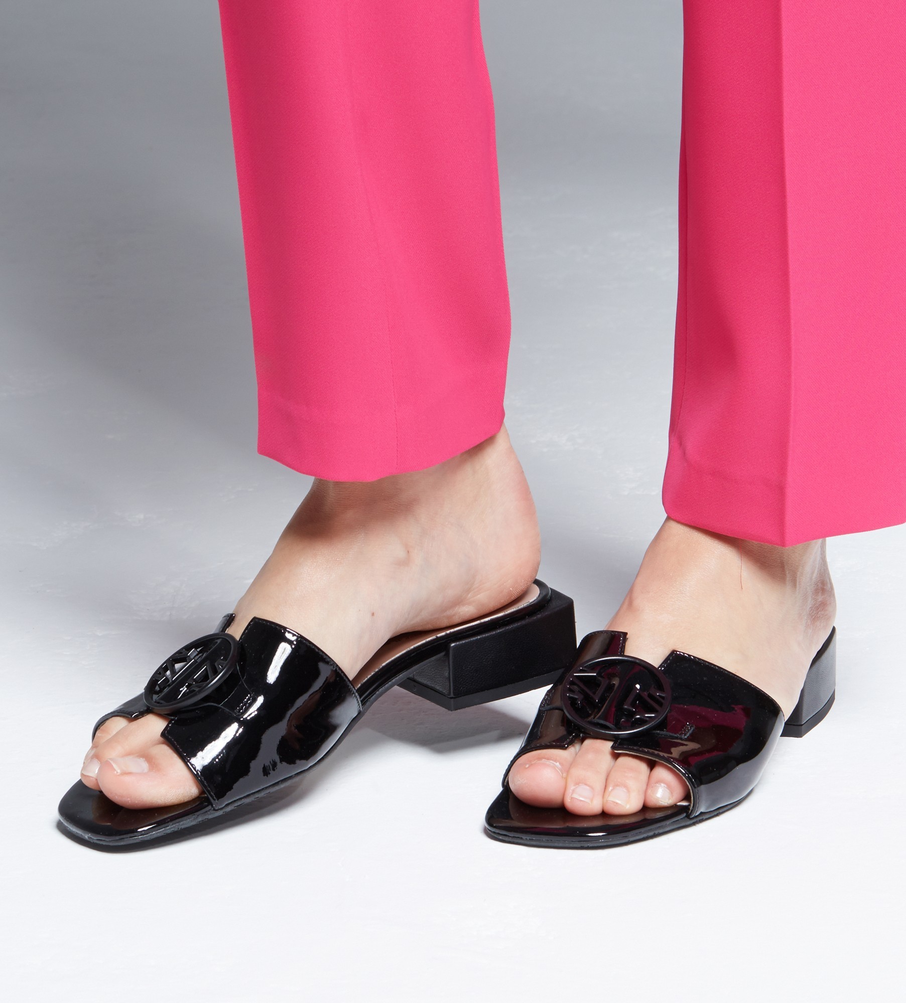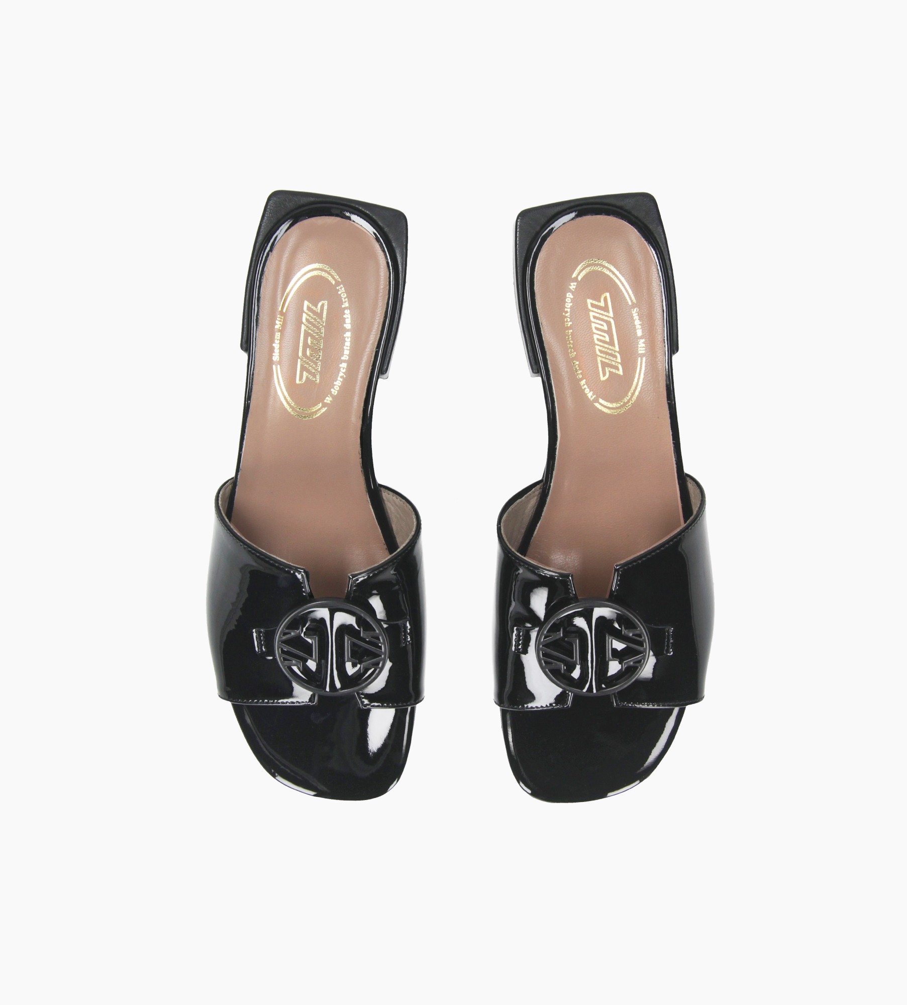 Klapki wykonane są z gładkiej, naturalnej skóry lakierowanej w kolorze czarnym, prezentują niezwykły poziom elegancji. Ich niski, wygodny obcas oraz efektowna ozdoba geometryczna z monogramem firmy 7 Mil nadają im niepowtarzalnego charakteru. Przód buta ma geometrycznie ścięte czubki, dodając im niezwykłej elegancji i modnego wyglądu. Skórzana wkładka pozwala stopie oddychać, zapewniając komfort nawet podczas długiego noszenia. Te czarne lakierowane klapki to nie tylko wyraz elegancji, ale także komfortu i funkcjonalności, sprawiając, że są one doskonałym uzupełnieniem letniej garderoby każdej kobiety.