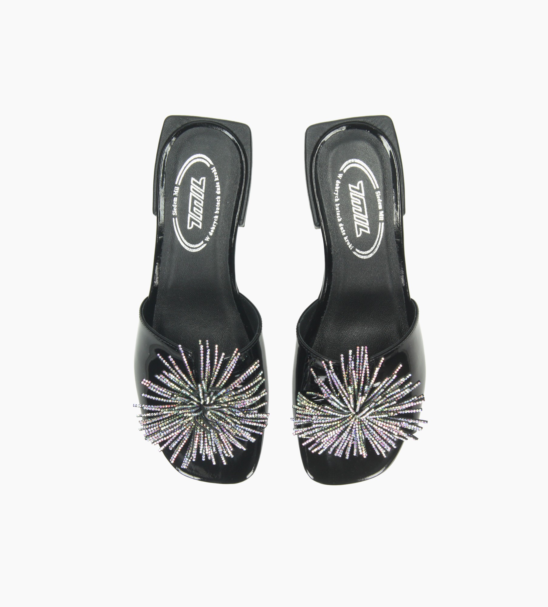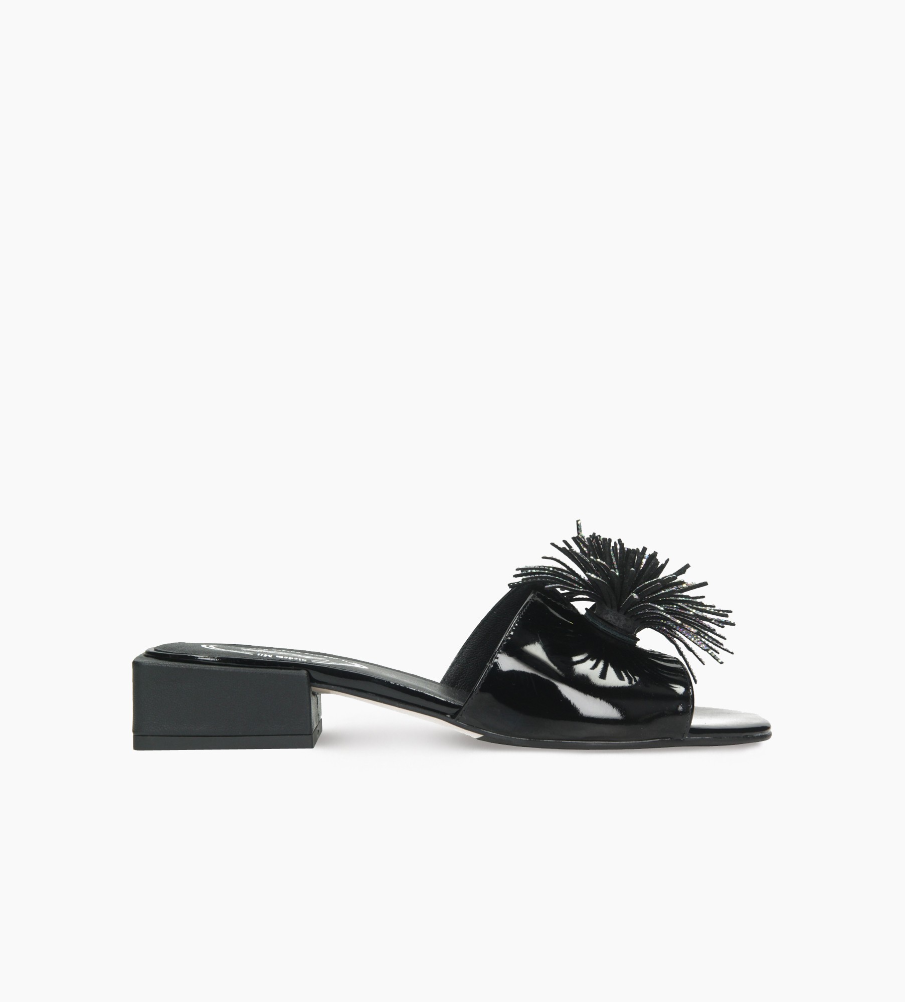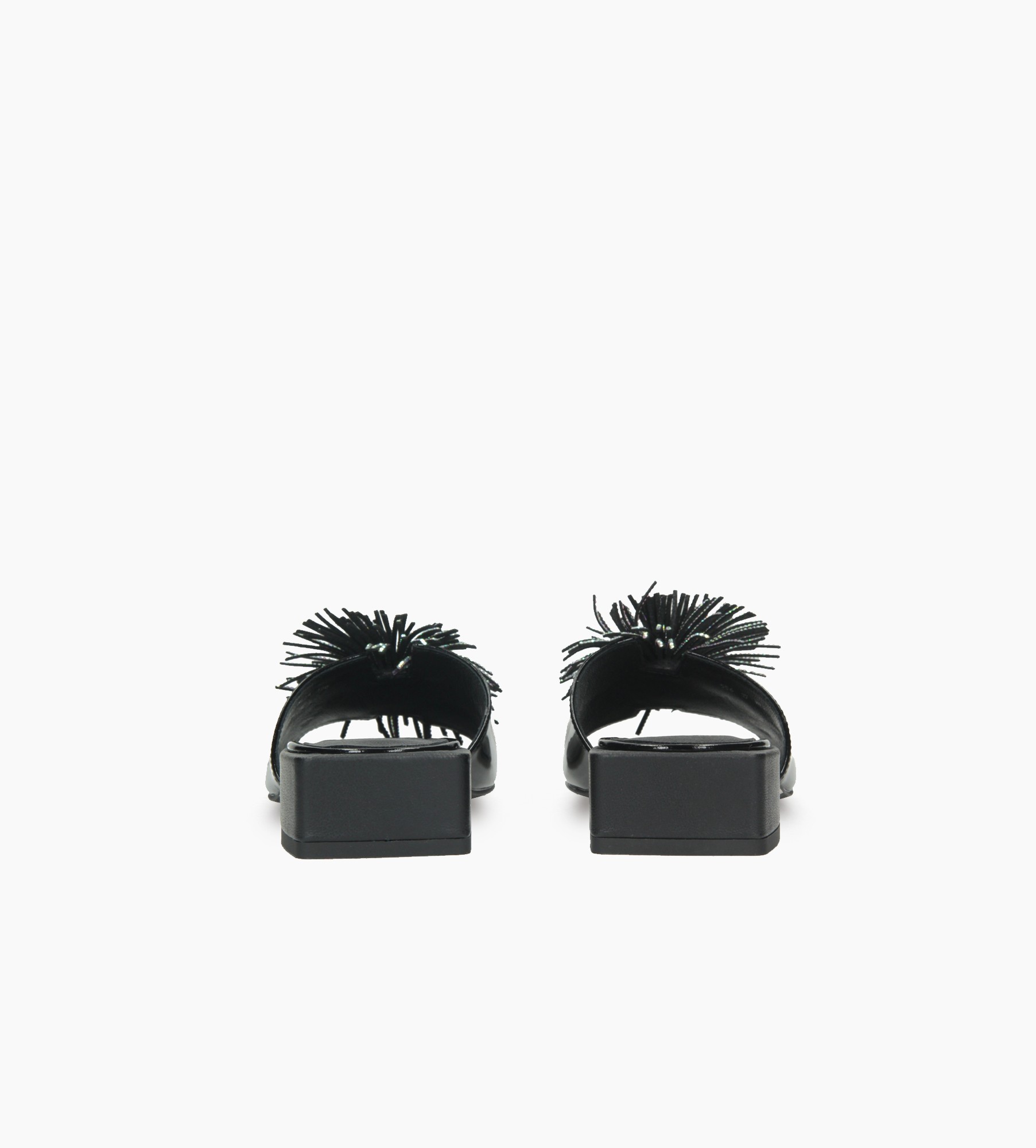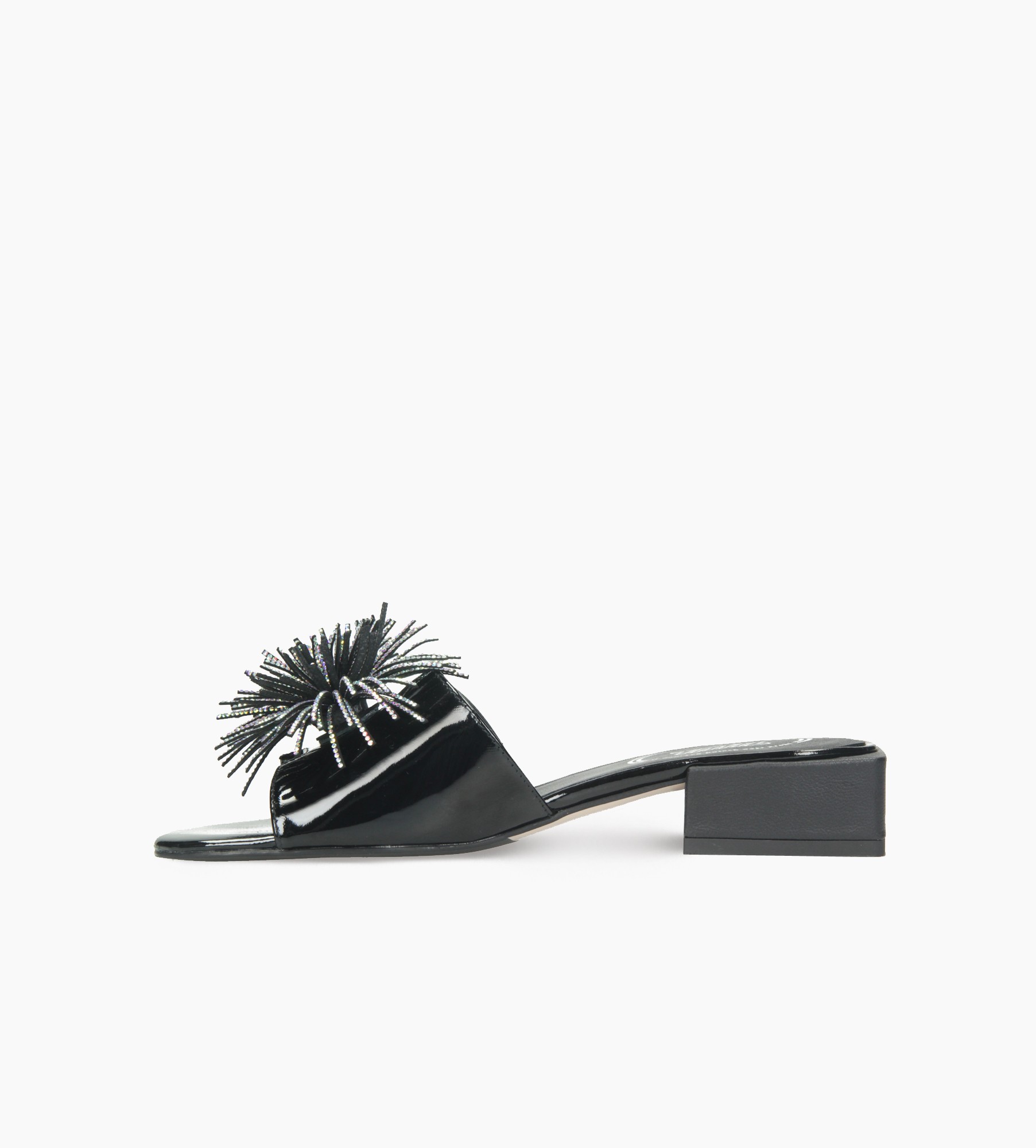 Eleganckie czarne lakierowane klapki damskie, które łączą nowoczesny design z wyrafinowanymi detalami. Wykonane z wysokiej jakości lakierowanej skóry naturalnej, charakteryzują się głębokim, lśniącym odcieniem czerni, który dodaje im luksusowego charakteru.​ Model osadzony jest na modnym, stabilnym obcasie o klockowatym kształcie, zapewniającym komfort noszenia i pewność każdego kroku. Wnętrze buta wyściełane jest miękką skórą jagnięcą, co gwarantuje wyjątkową wygodę nawet podczas długotrwałego użytkowania.​ Wyrazistym akcentem tych klapek jest subtelna ozdoba w formie srebrnego pompona umieszczona na przednim pasku. Ten kobiecy detal dodaje butom unikalnego charakteru i stanowi elegancki akcent.