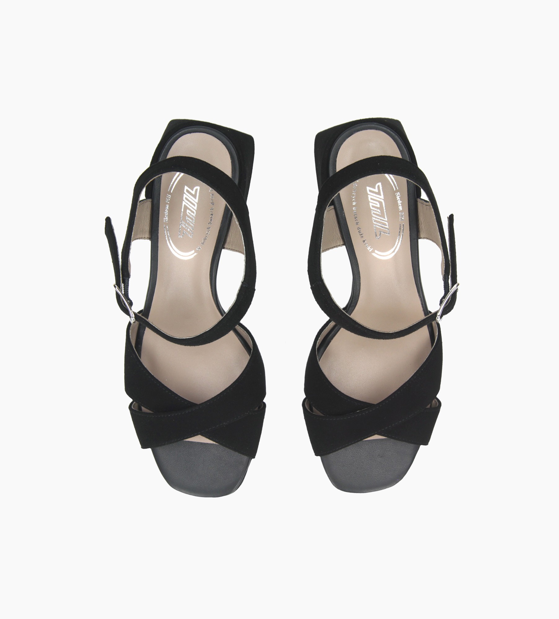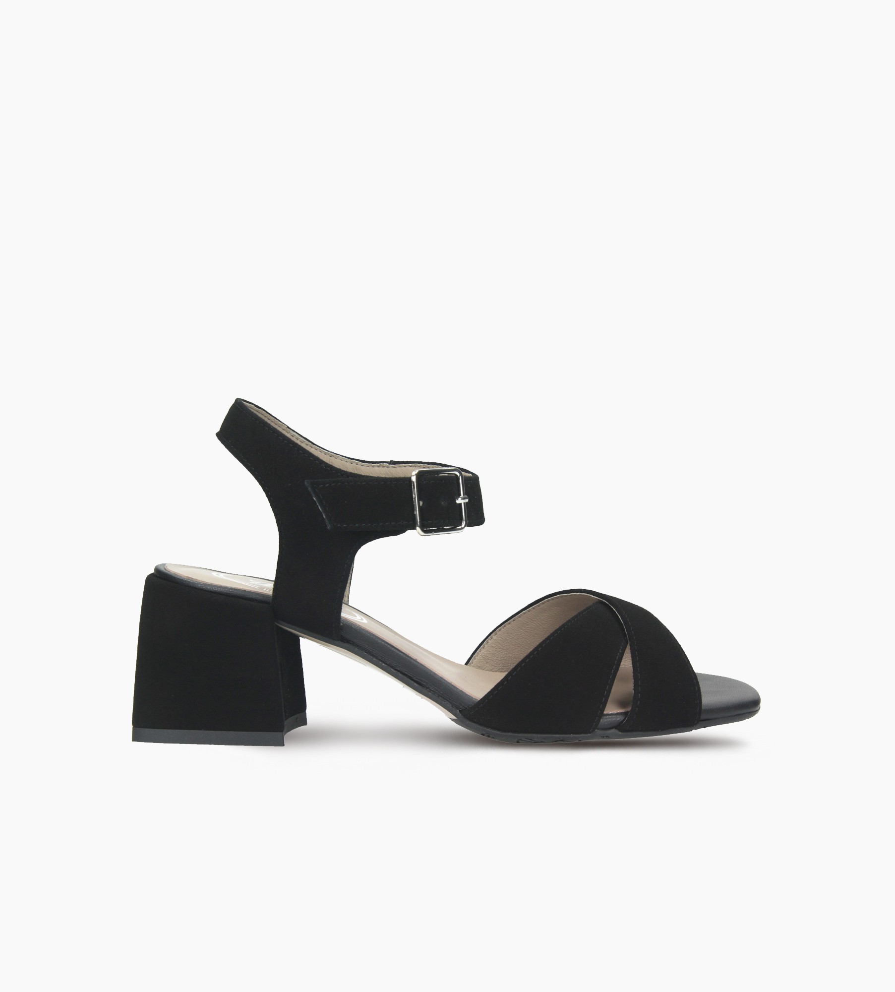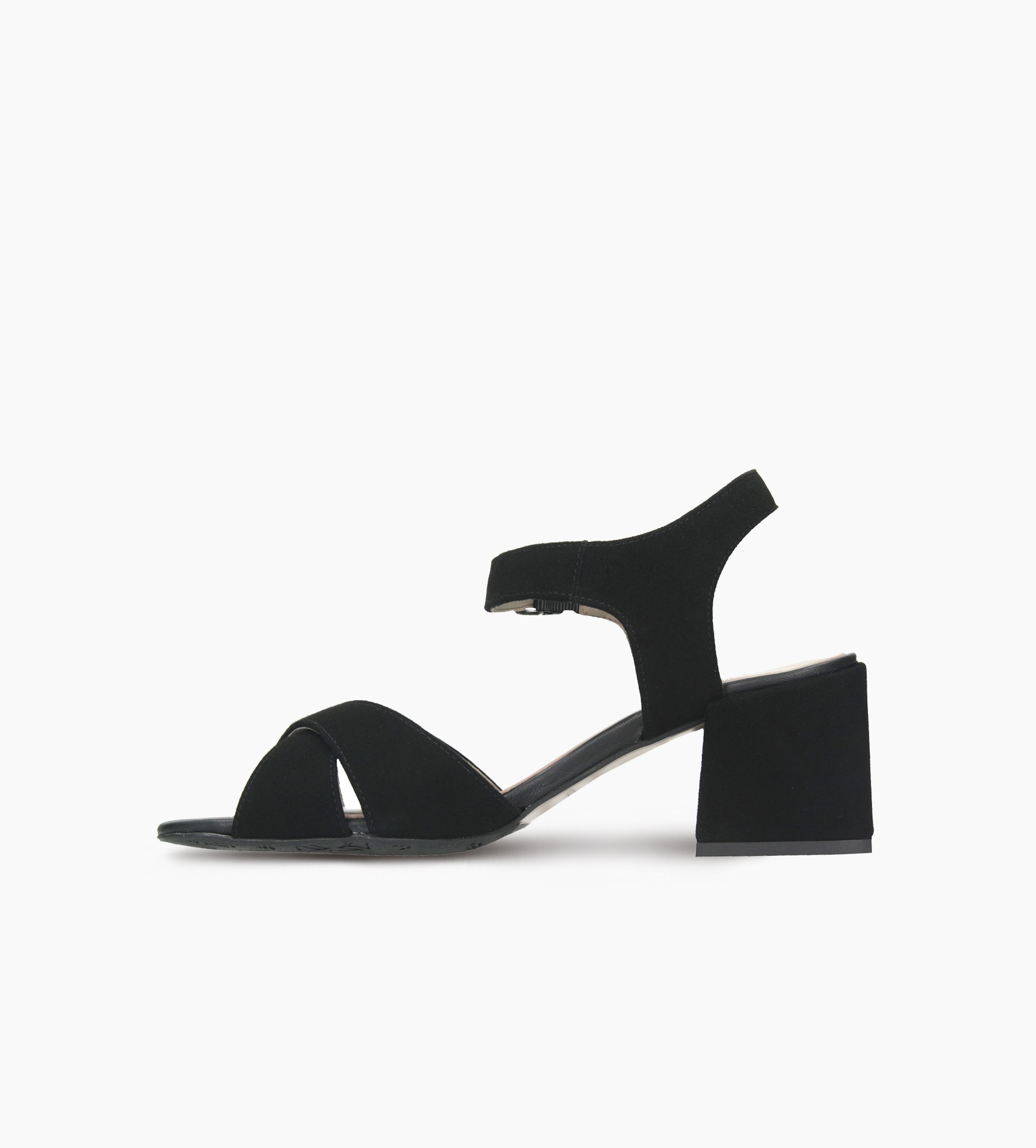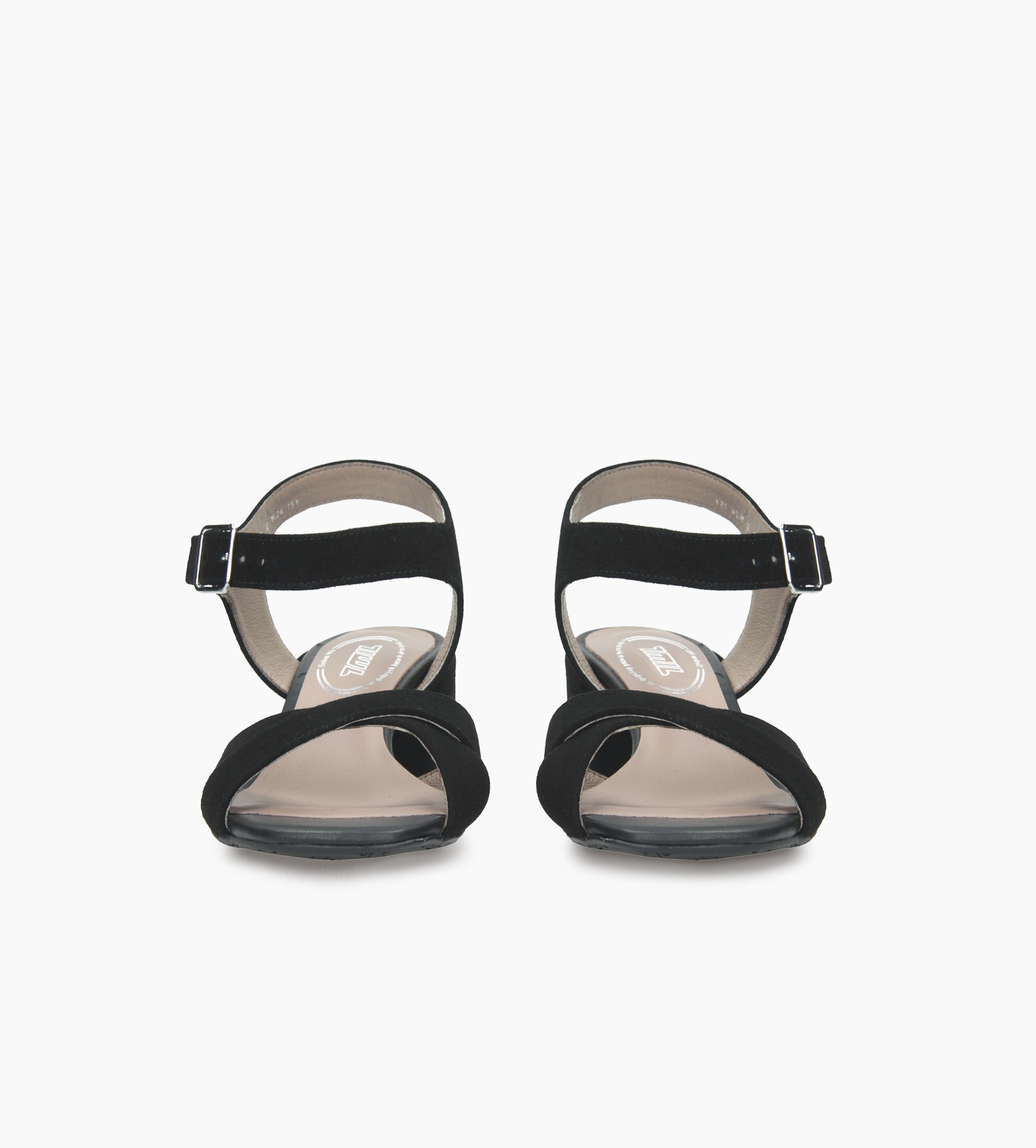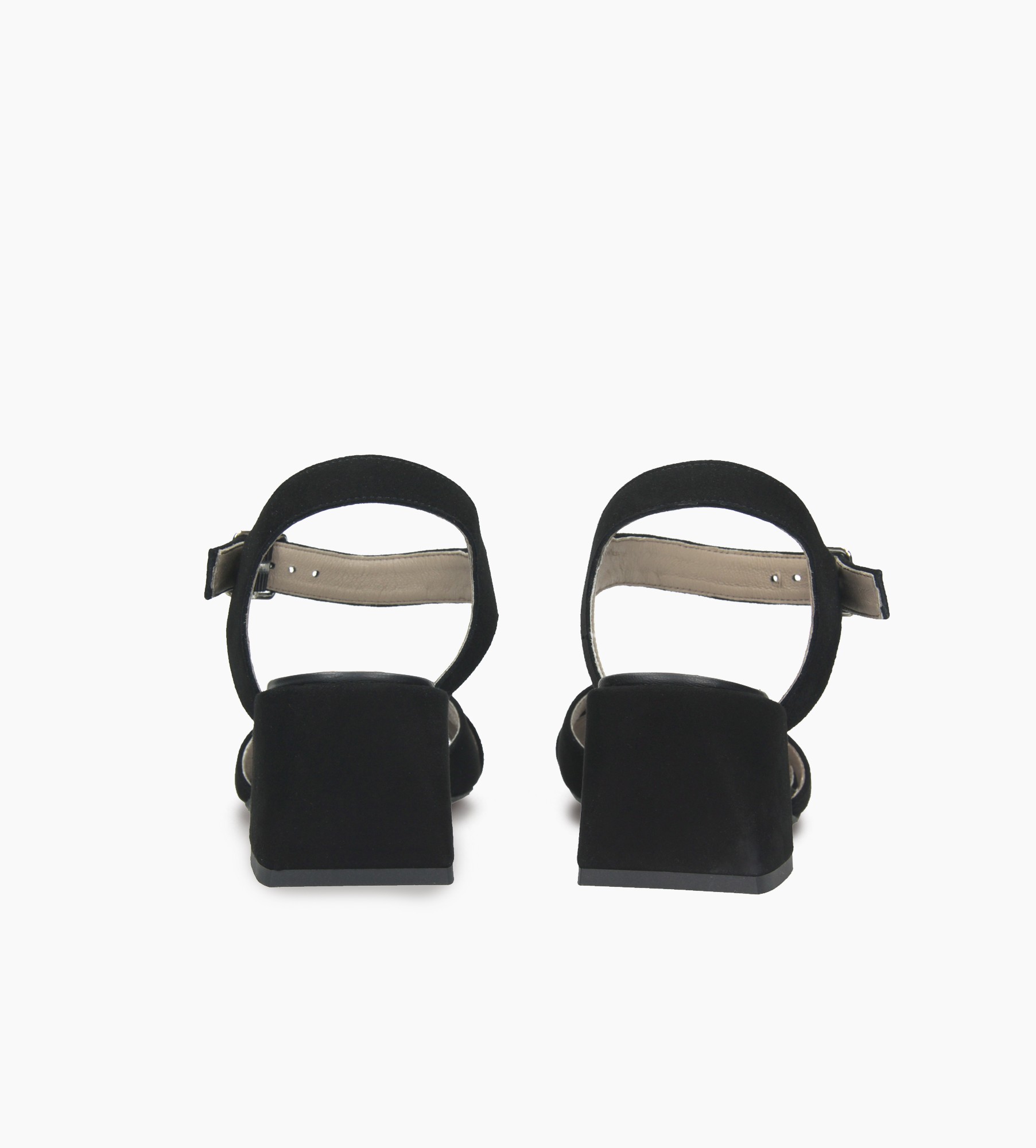 Czarne sandały z naturalnej skóry zamszowej z odkrytą piętą, zapinane na kostce to klasyczny, ponadczasowy fason, który warto mieć w swojej garderobie. Niewysoki, słupkowy obcas 6,5-centymetrowy zapewnia stabilny krok i wygodę przez wiele godzin. Sandały wykonane są z wysokiej jakości skóry zamszowej w neutralnym czarnym kolorze, który pasuje do wielu stylizacji.