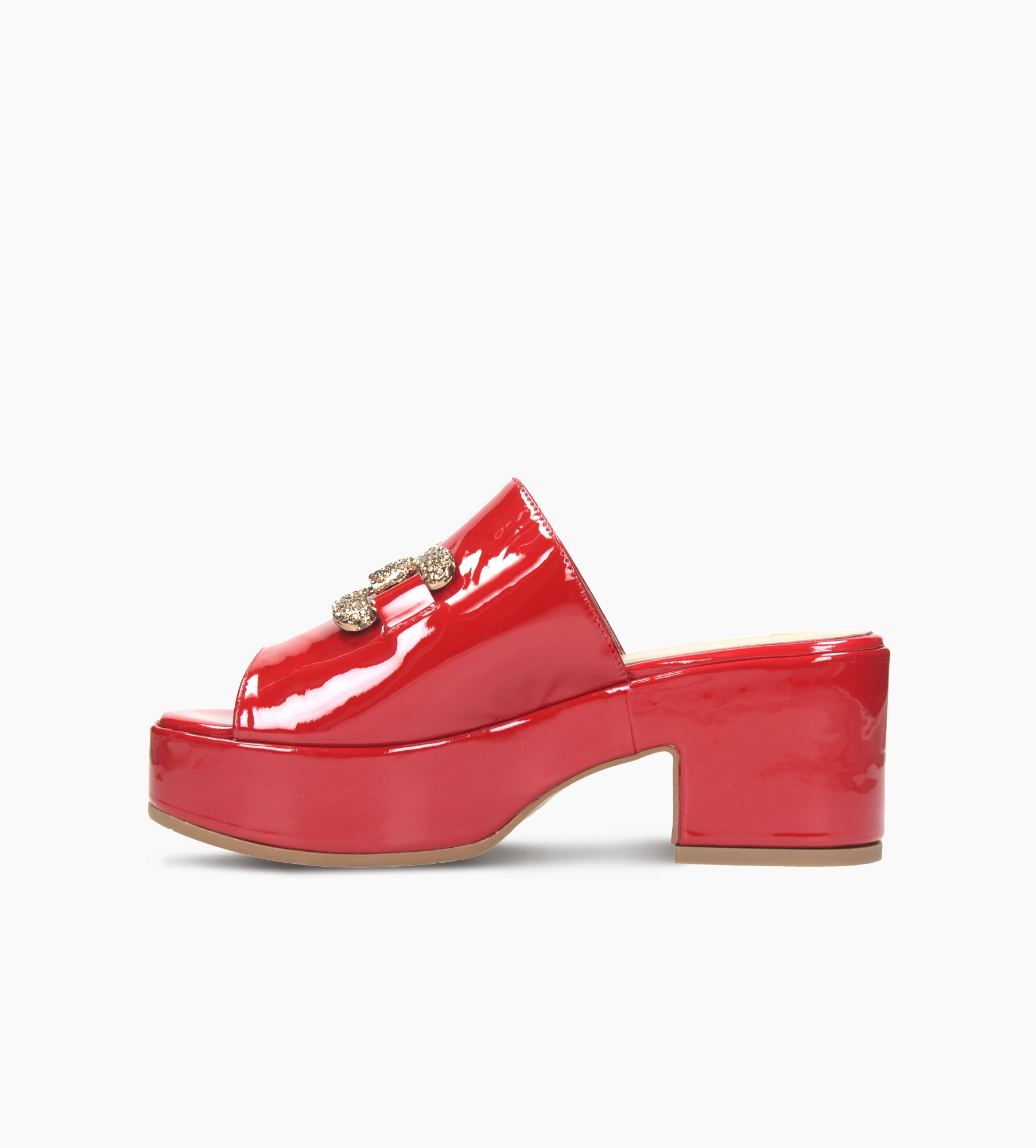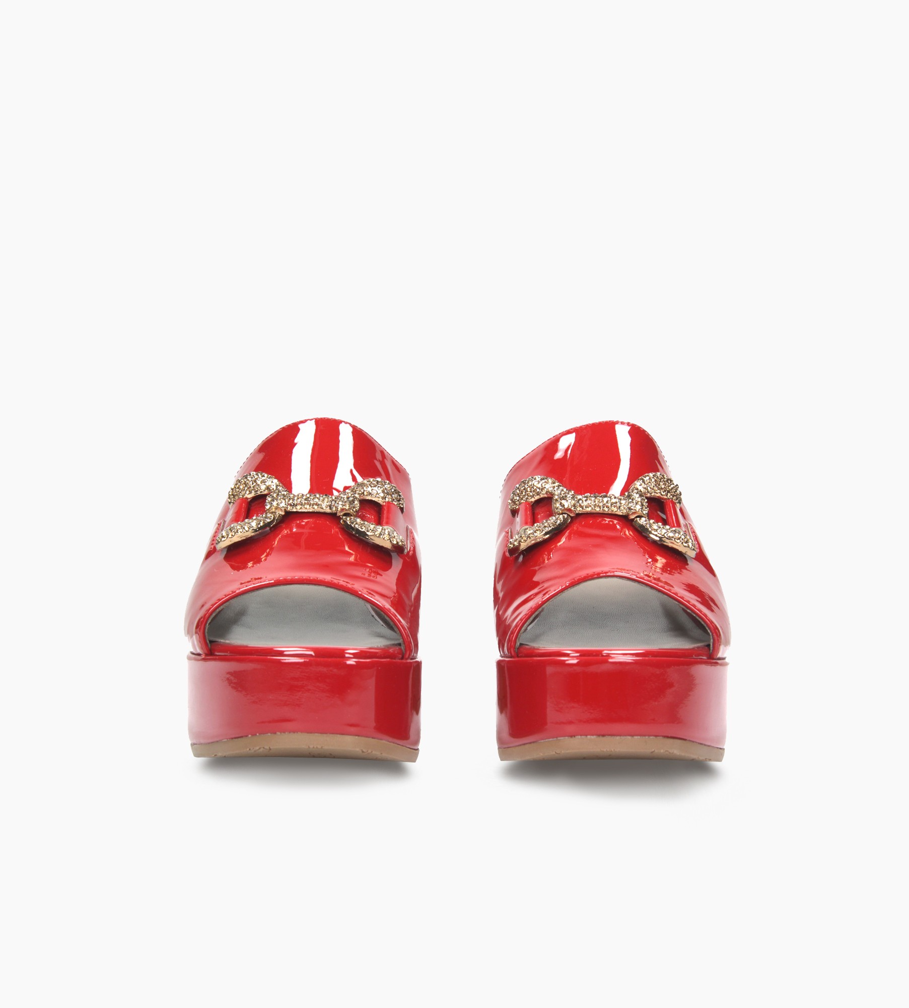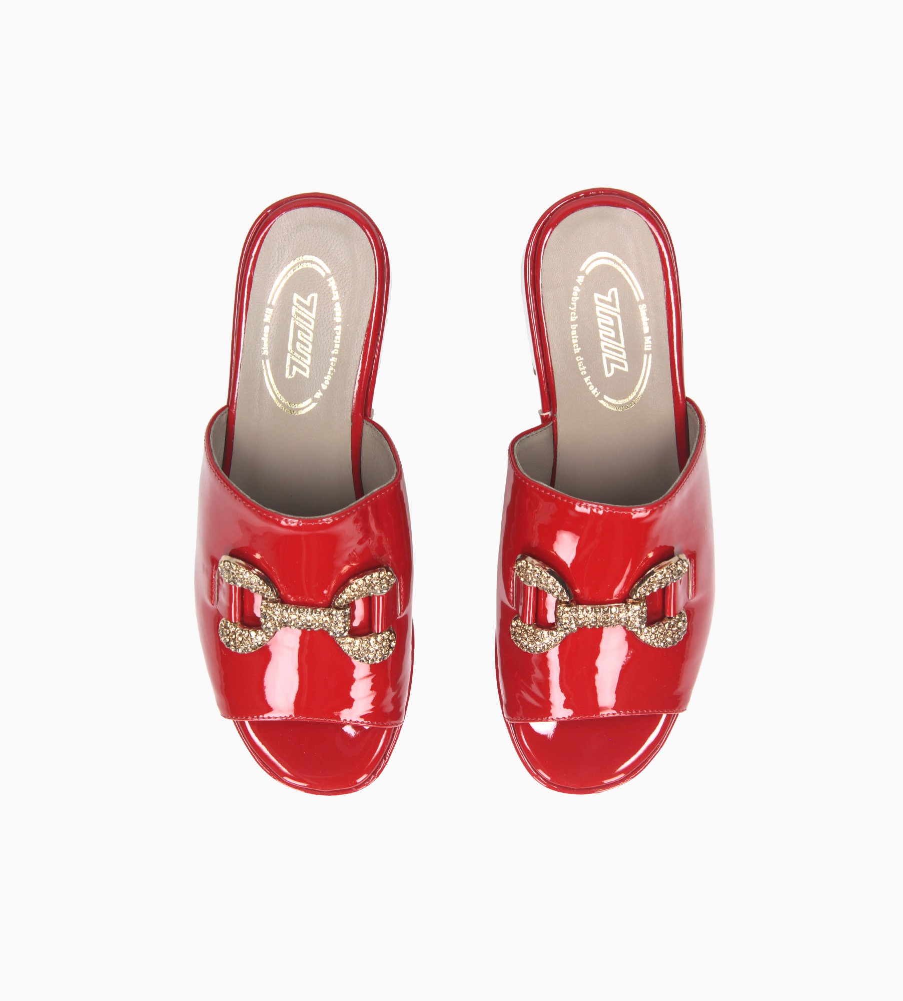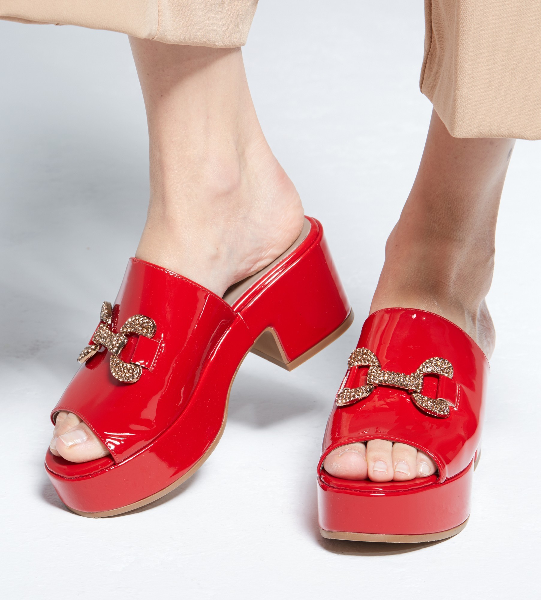 Efektowne czerwone klapki damskie wykonane z naturalnej skóry lakierowanej, nadające im niepowtarzalny lśniący efekt, są idealnym wyborem na letnie spotkania czy specjalne okazje. Wnętrze butów wyściełane jest miękką skórą jagnięcą, zapewniając wysoki komfort noszenia. Skórzana wkładka dodatkowo podkreśla luksusowy charakter sandałów, oferując wsparcie dla stopy i dostosowując się do jej kształtu. Z wysokością obcasa wynoszącą 7 cm oraz wyrazistą złotą ozdobą na pasku, te sandały łączą elegancję z wygodą, idealne na spotkania biznesowe czy wieczorne wyjścia. Nie tylko podążają za najnowszymi trendami, ale również definiują nowe standardy w modzie damskiej. Ich intensywny czerwony kolor dodaje odwagi i pewności siebie każdej stylizacji.