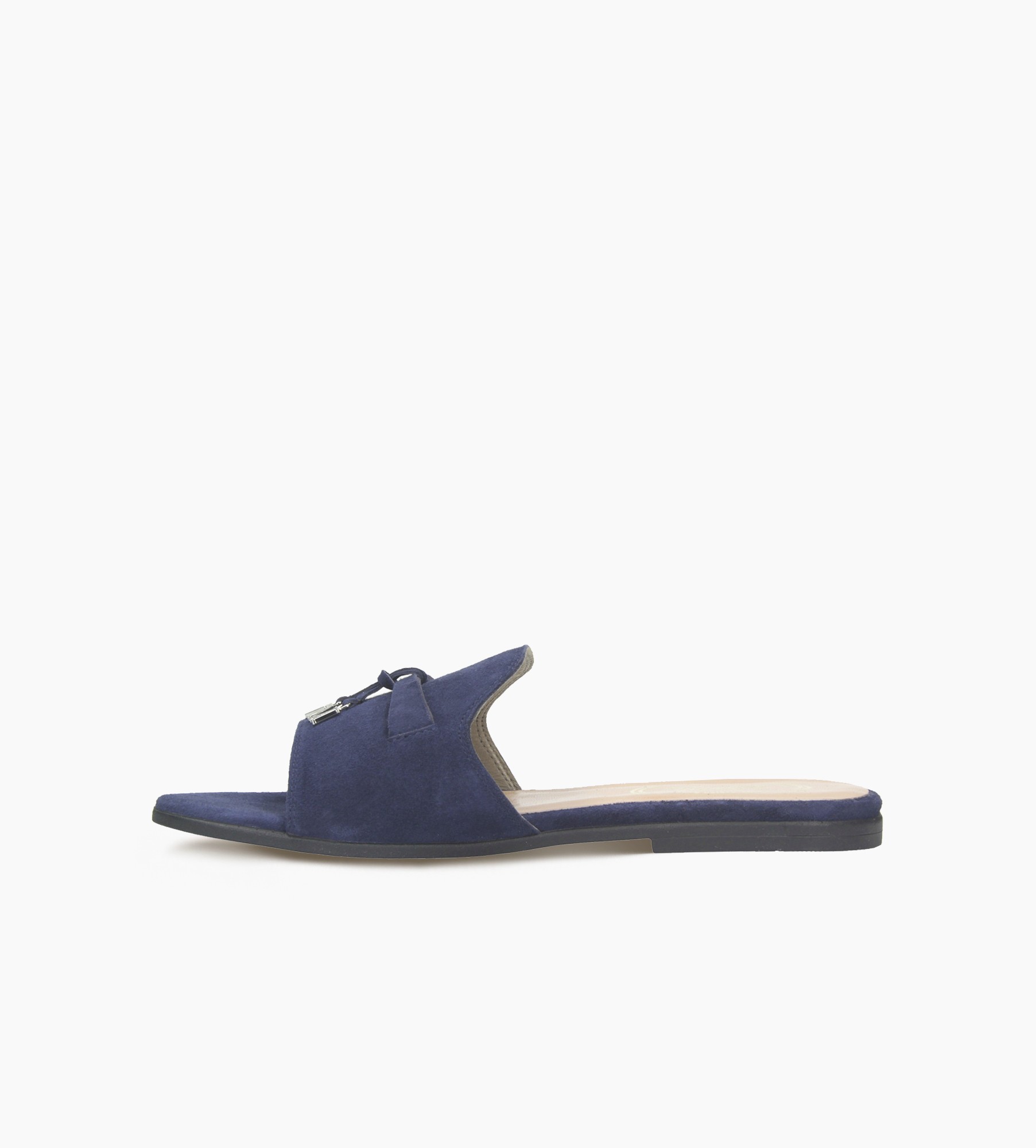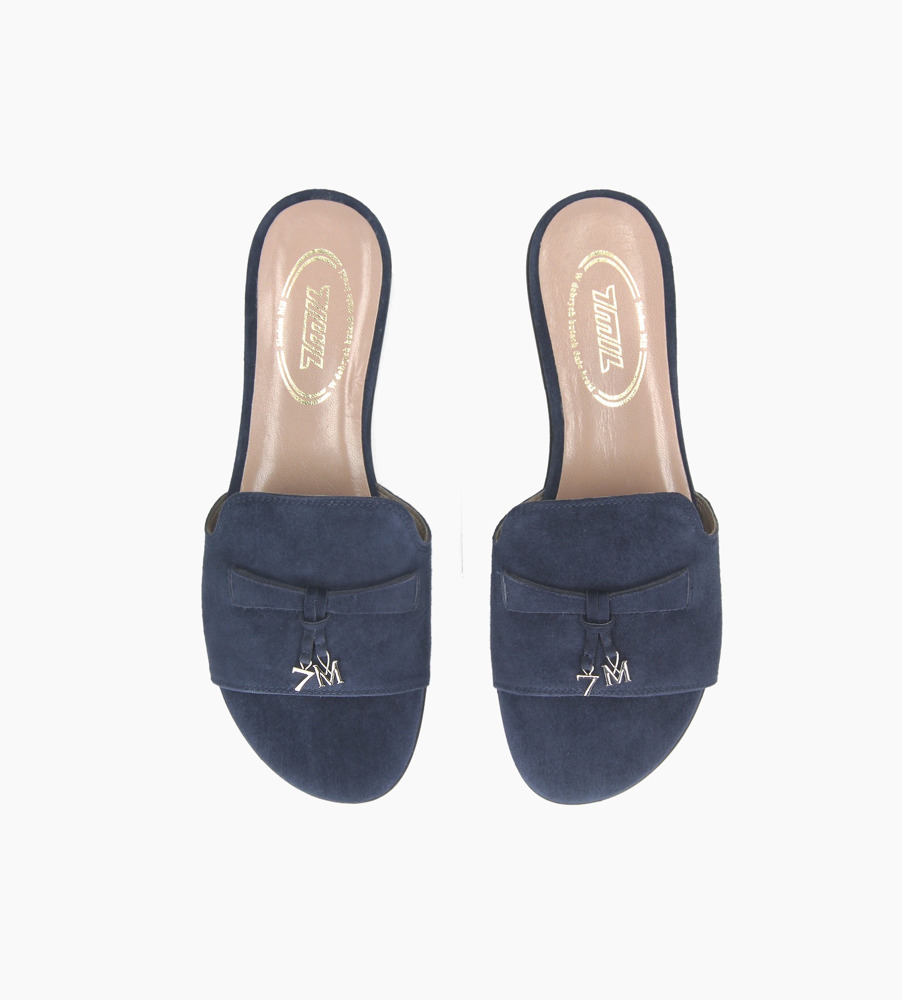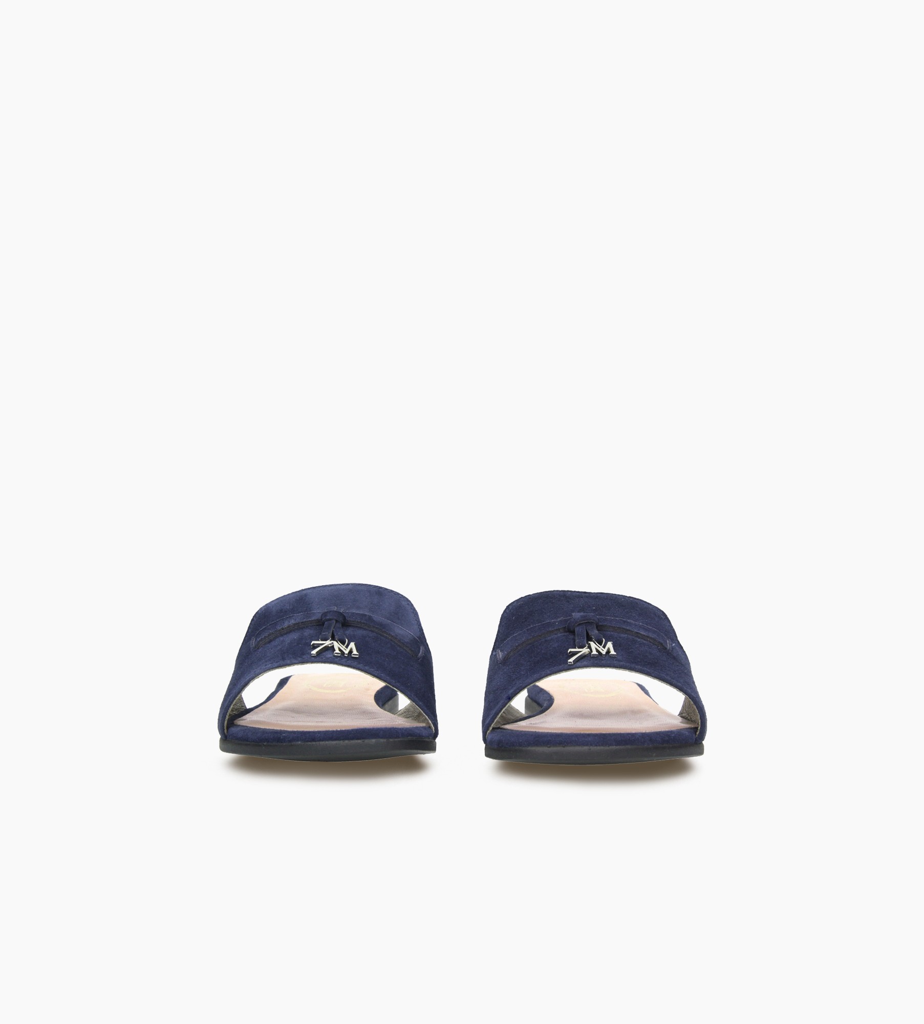 Klapki wykonane są z wysokiej jakości naturalnej skóry zamszowej, dostępne w delikatnym odcieniu granatu. Charakteryzują się ponadczasowym fasonem, posiadającym szeroki pasek oraz płaską podeszwę. Minimalistyczna forma została wzbogacona o delikatną ozdobę w postaci srebrnego monogramu "7 mil". Wygodne, lekkie i niezwykle modne klapki przypadną do gustu kobietom ceniącym klasyczne dodatki. Ich wyjątkowa konstrukcja zapewnia komfort noszenia, a zarazem dodaje szyku każdej letniej stylizacji.