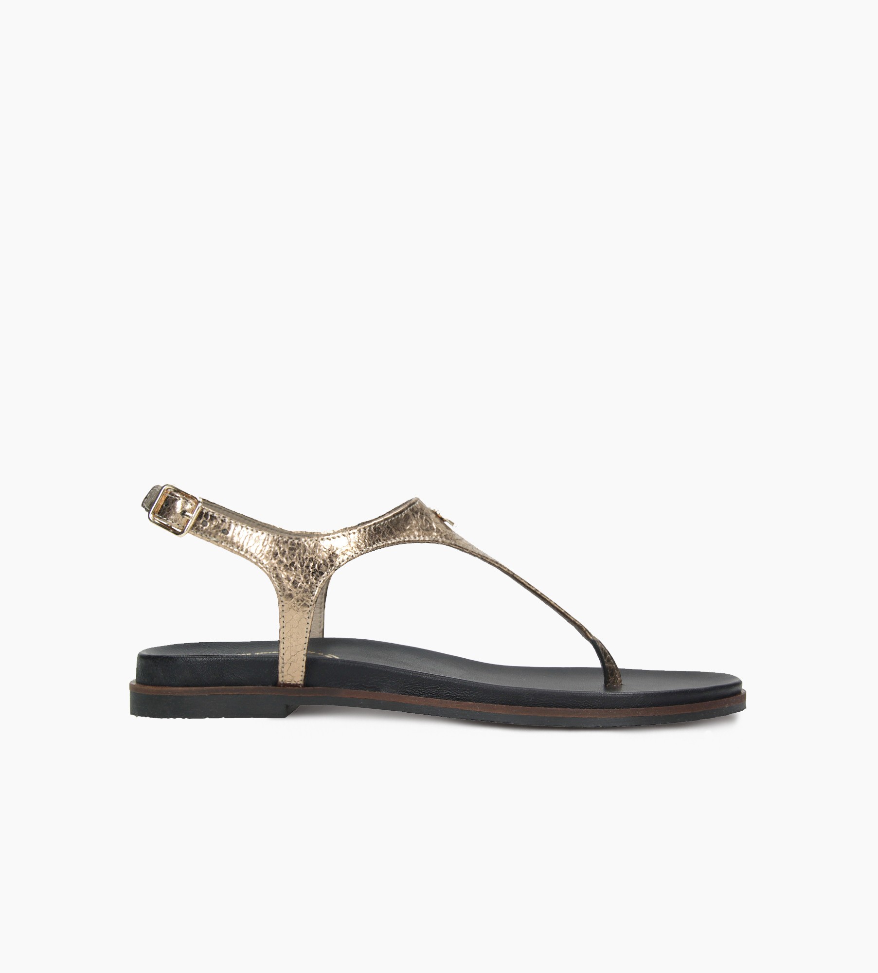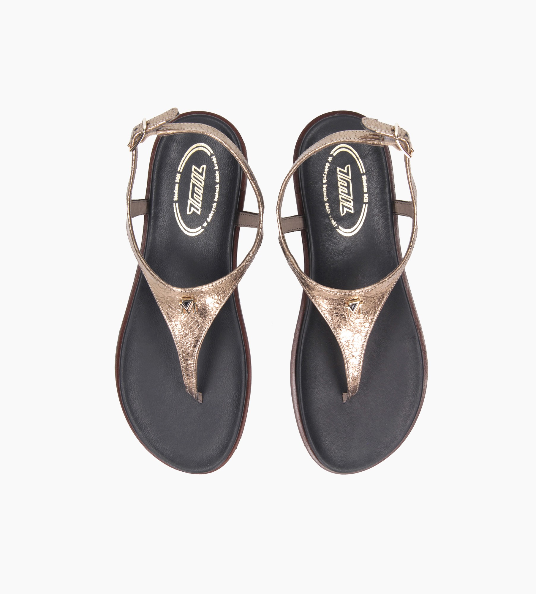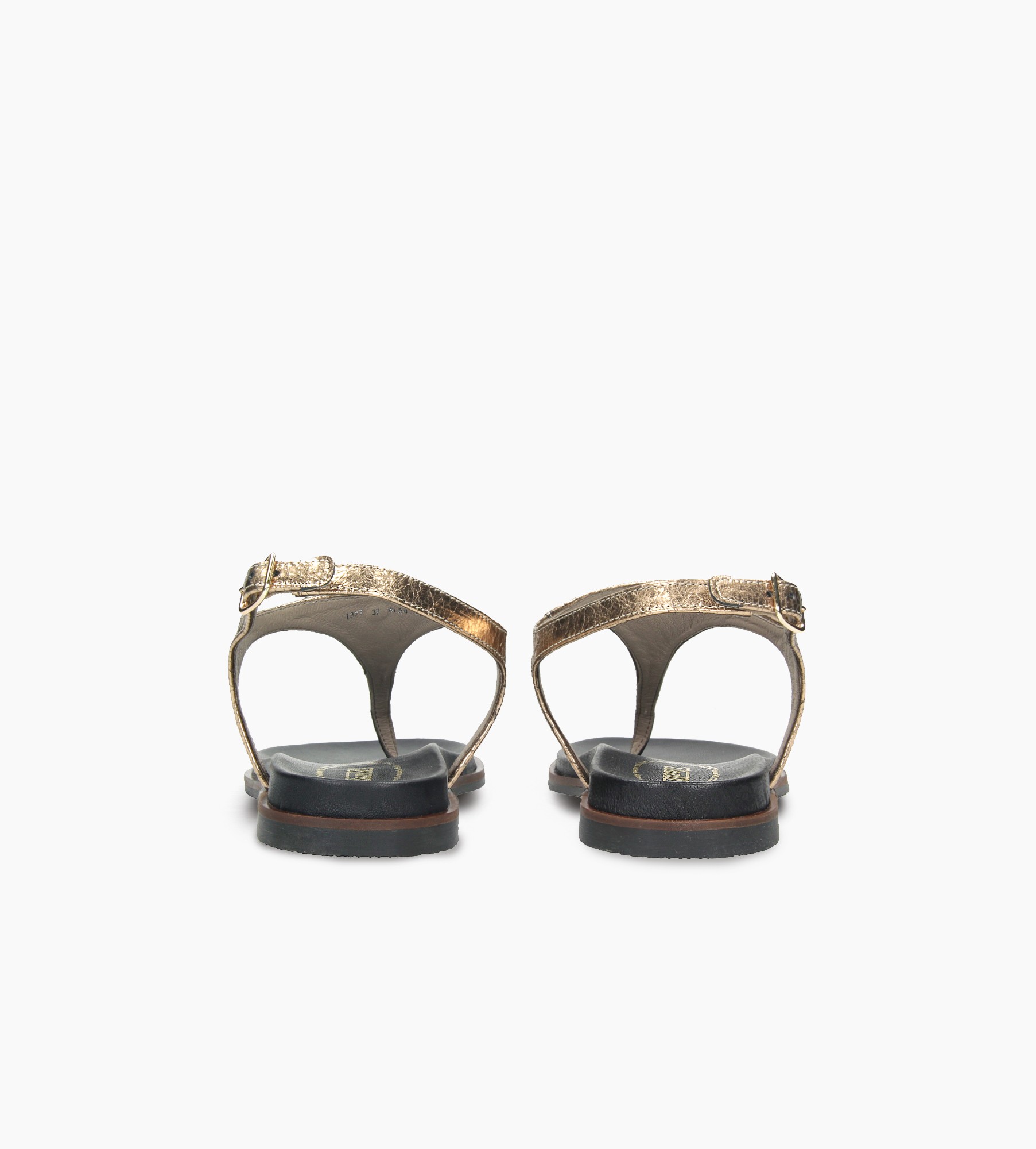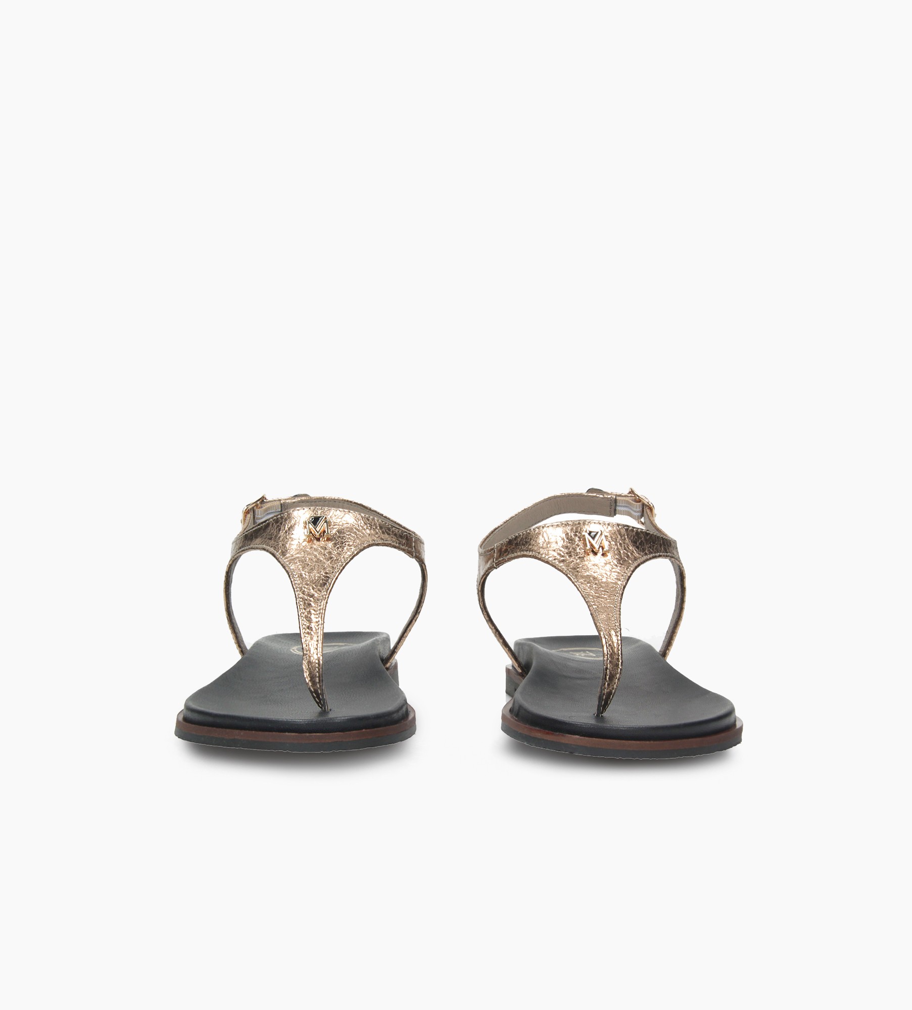 Sandały japonki w kolorze miedzianym wykonane z wysokiej jakości naturalnej skóry licowej to lekki, przewiewny model, który perfekcyjnie sprawdzi się podczas upalnych dni. Pojedynczy pasek znacznie odsłania stopę, przez co obuwie jest praktyczne niewidoczne na nodze. Minimalistyczny krój oraz złoty kolor tworzą subtelną kompozycję, która stanie się uroczą bazą wielu różnorodnych stylizacji.