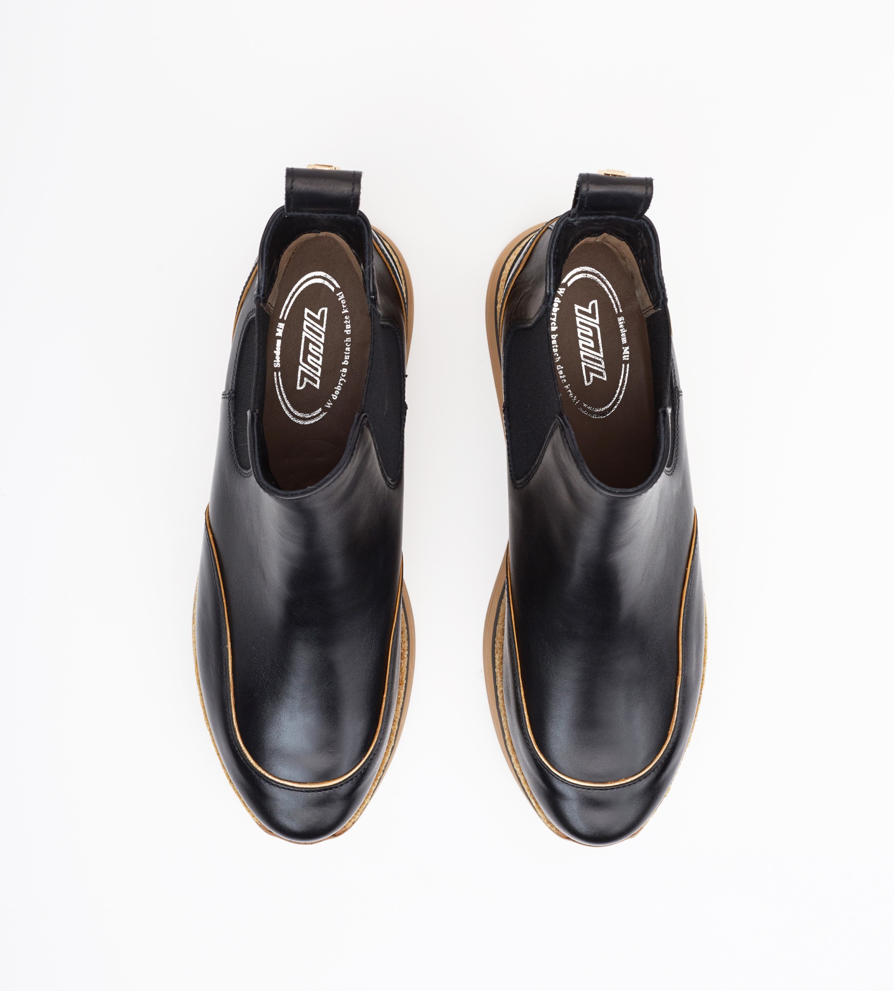 Czarne sztyblety damskie z naturalnej skóry cielęcej z ozdobnymi złotymi rantami, to nowoczesne i stylowe obuwie, które łączy w sobie funkcjonalność i modny wygląd. Sztyblty mają cholewkę wykonaną z wysokiej jakości skóry jagnięcej, co zapewnia trwałość i komfort noszenia. Buty te posiadają grubą, elastyczną podeszwę platformę, która gwarantuje dobrą przyczepność i stabilność na różnych powierzchniach. Dzięki swojej uniwersalnej czarnej kolorystyce, sneakersy te doskonale komponują się z wieloma różnymi stylizacjami, zarówno casualowymi, jak i bardziej eleganckimi.