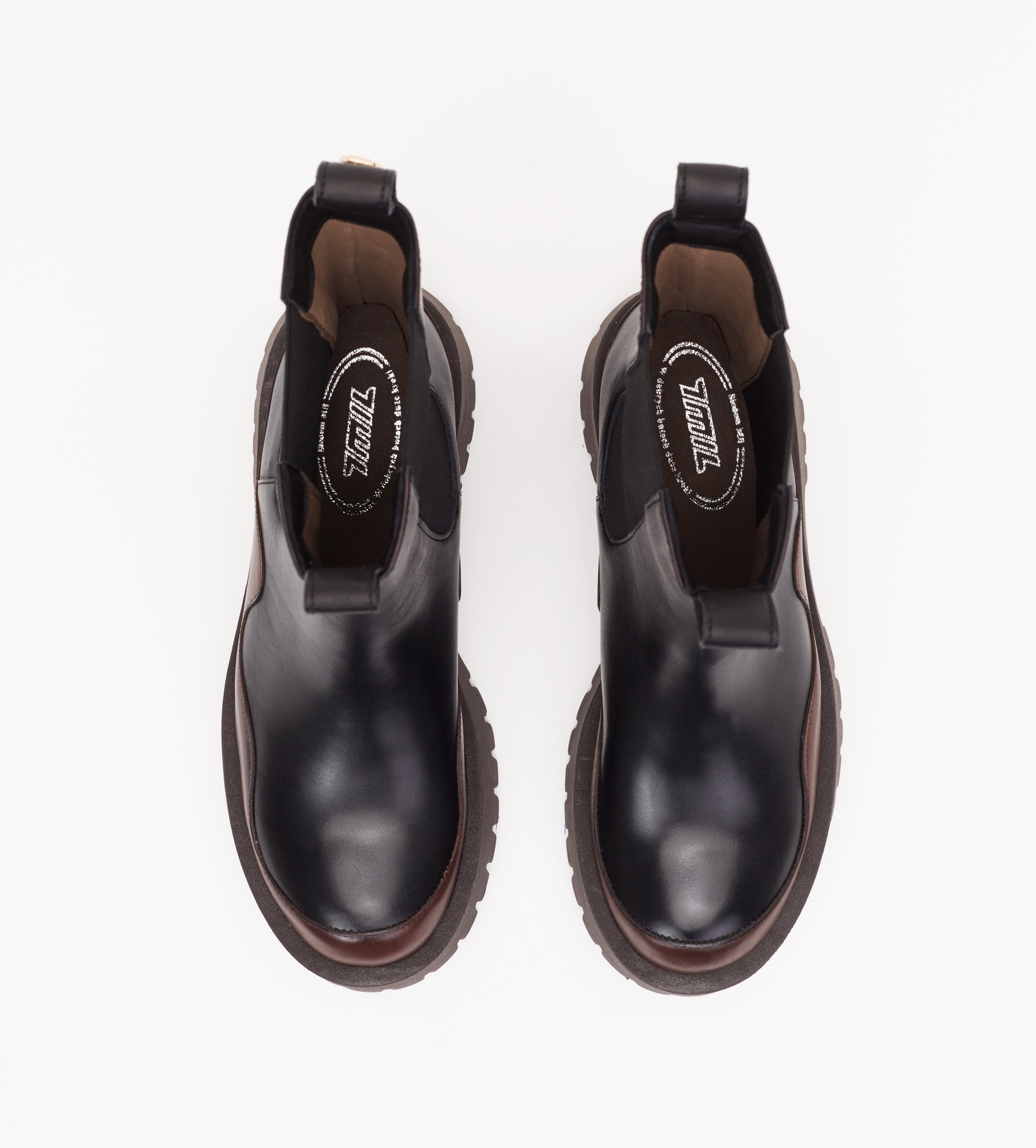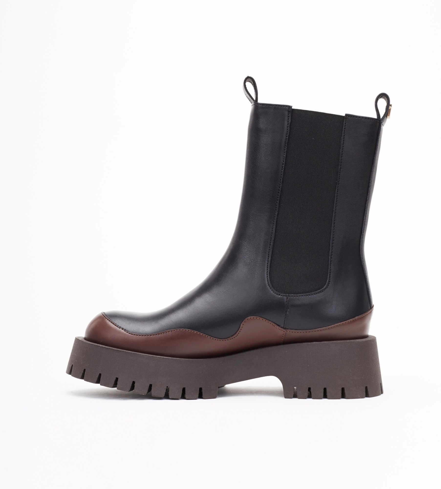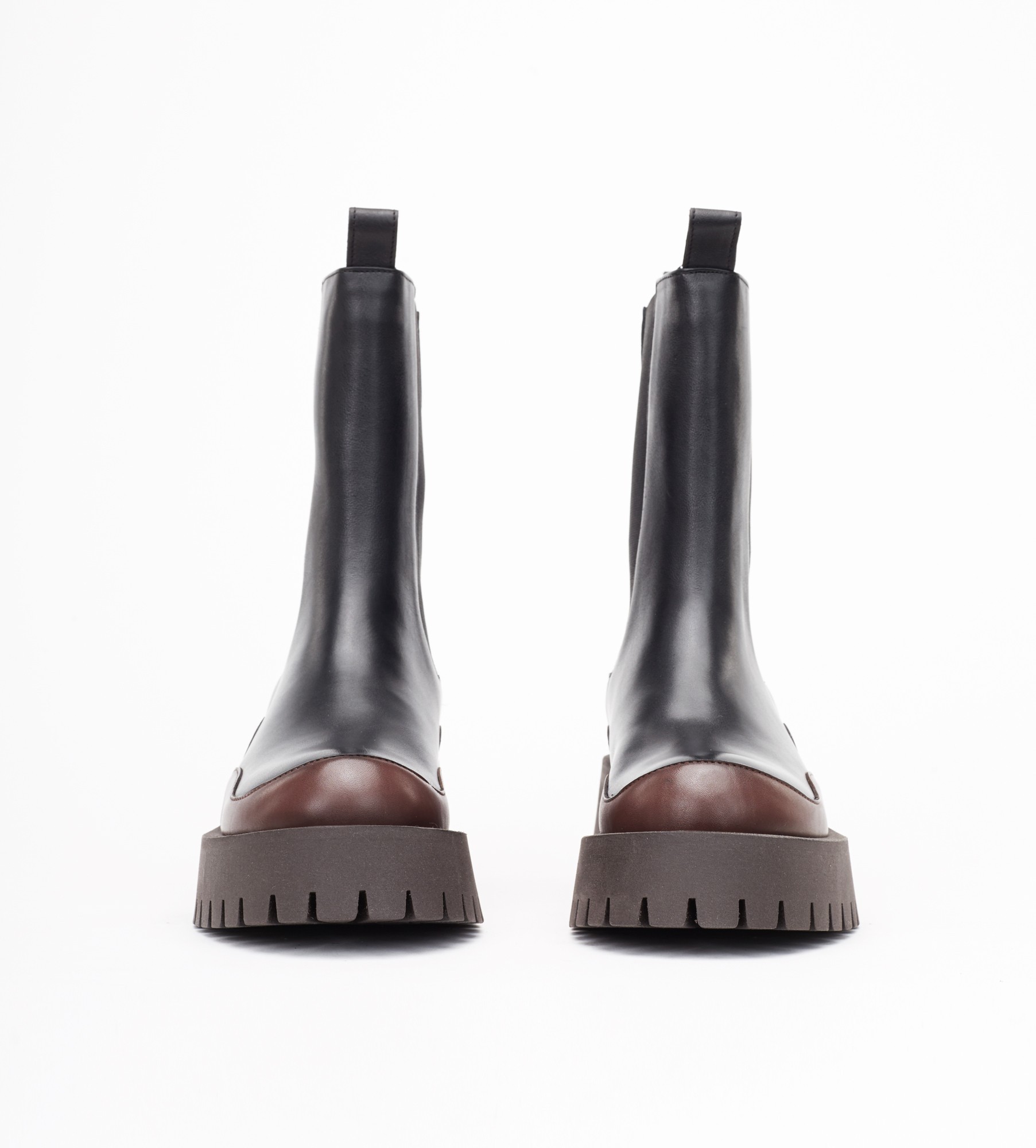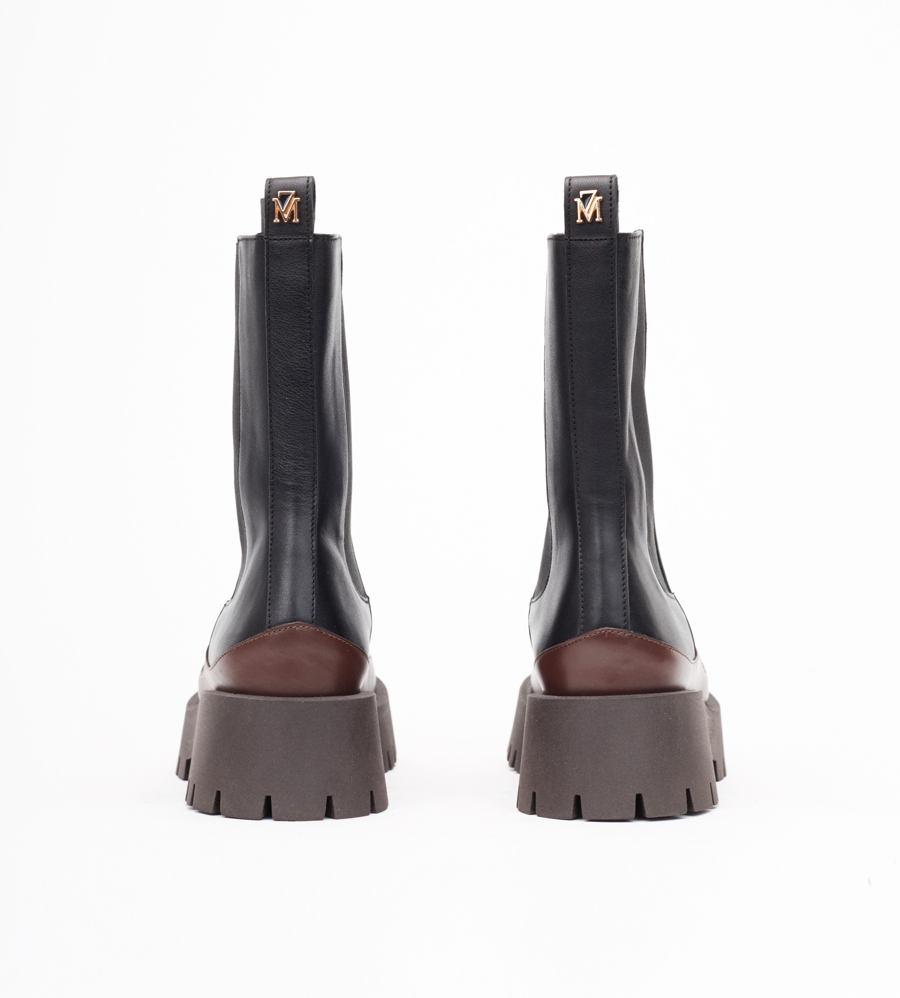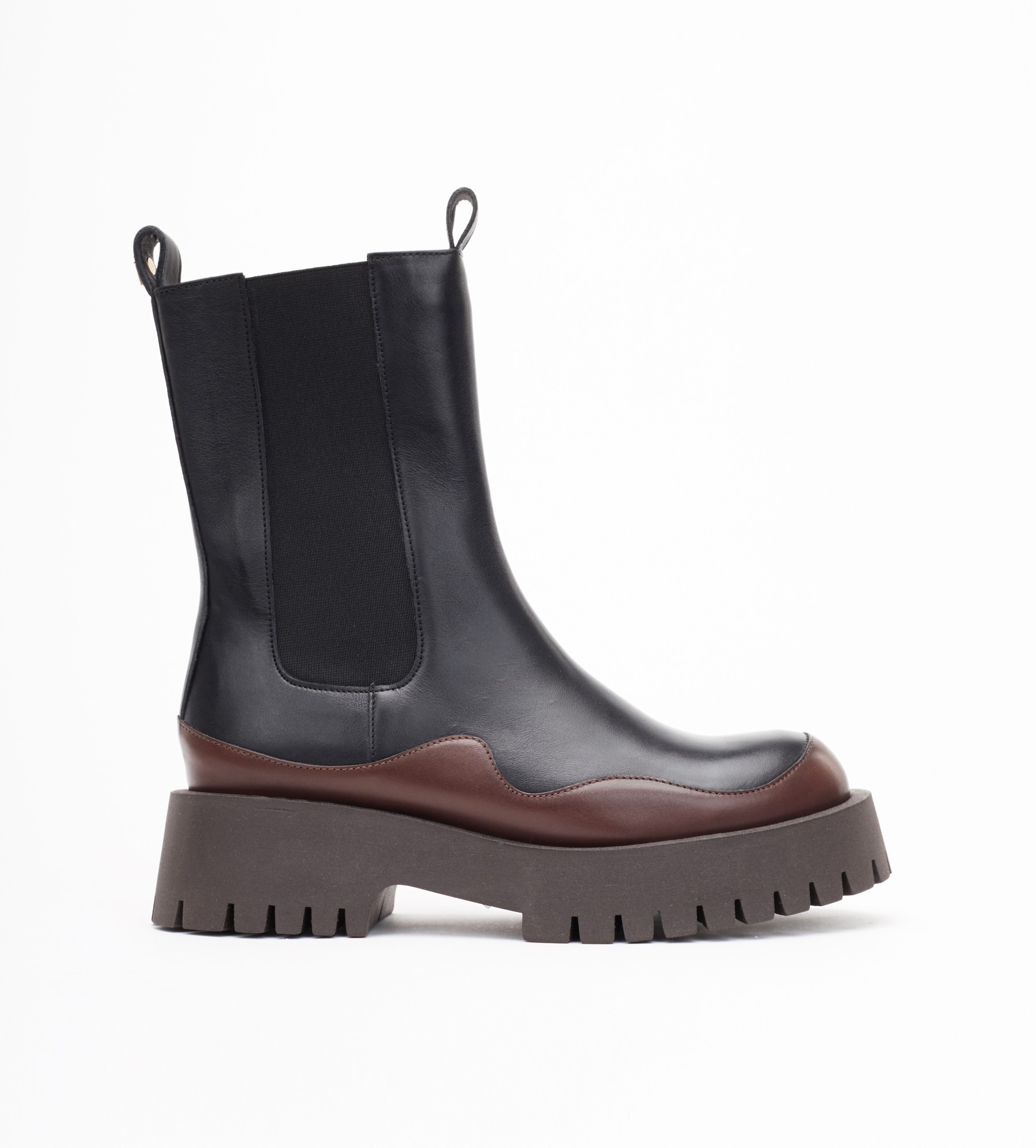 Czarno- brązowe sztyblety z wyższą cholewką z naturalnej skóry cielęcej, które łączy w sobie klasyczny styl z nowoczesnymi akcentami. Wnętrze butów oraz wkładka wykończone są naturalną skórą jagnięcą. Ryflowana podeszwa zapewnia dobrą przyczepność i stabilność na różnych powierzchniach. Elastyczne, czarne gumy po bokach ułatwiają zakładanie i zdejmowanie butów, jednocześnie zapewniając idealne dopasowanie do stopy. Te sztyblety to doskonały wybór zarówno do codziennych, jak i bardziej eleganckich stylizacji, zapewniając komfort i styl przez cały dzień.