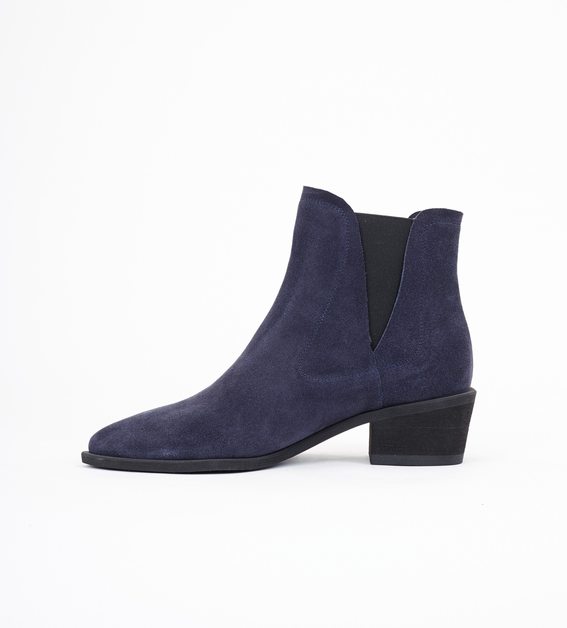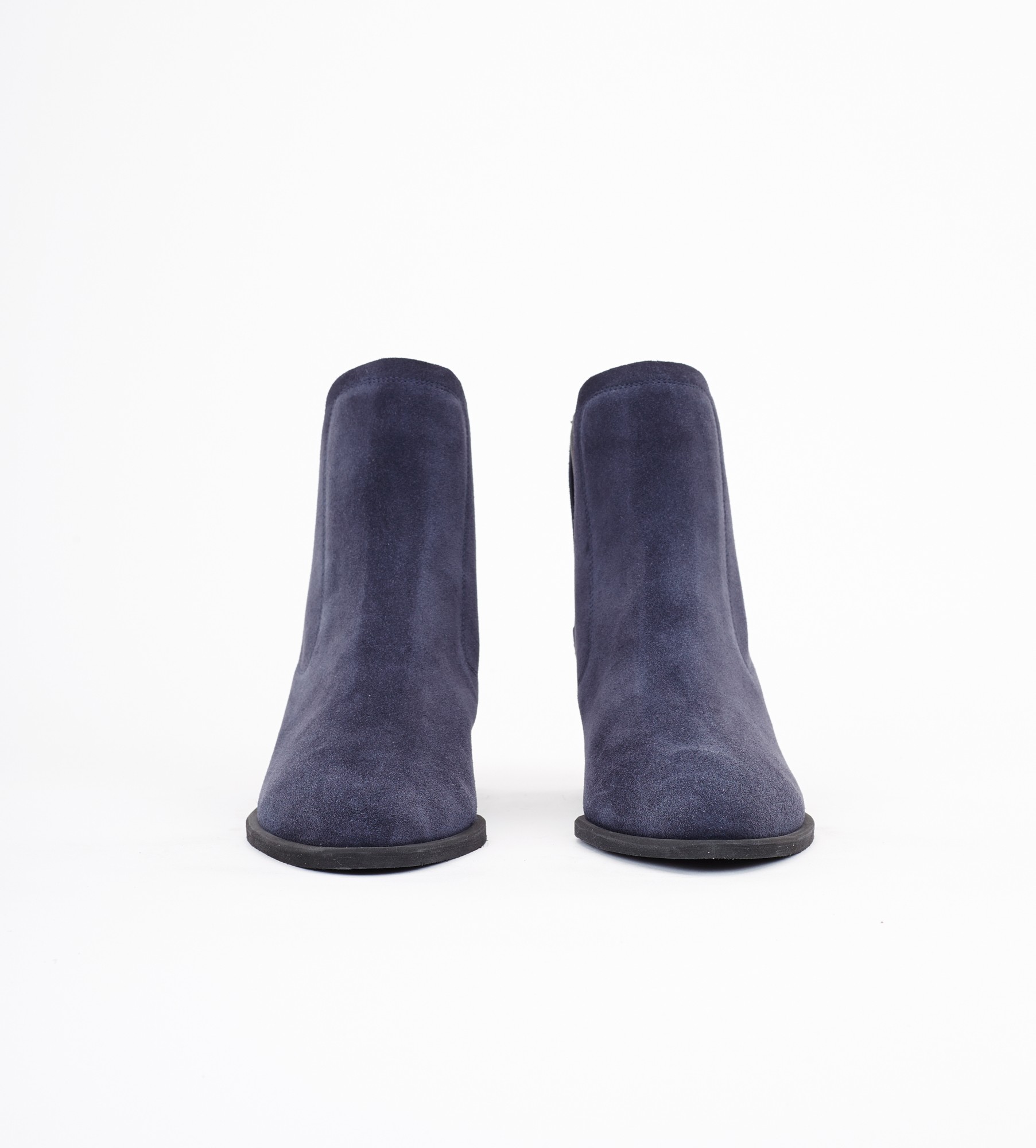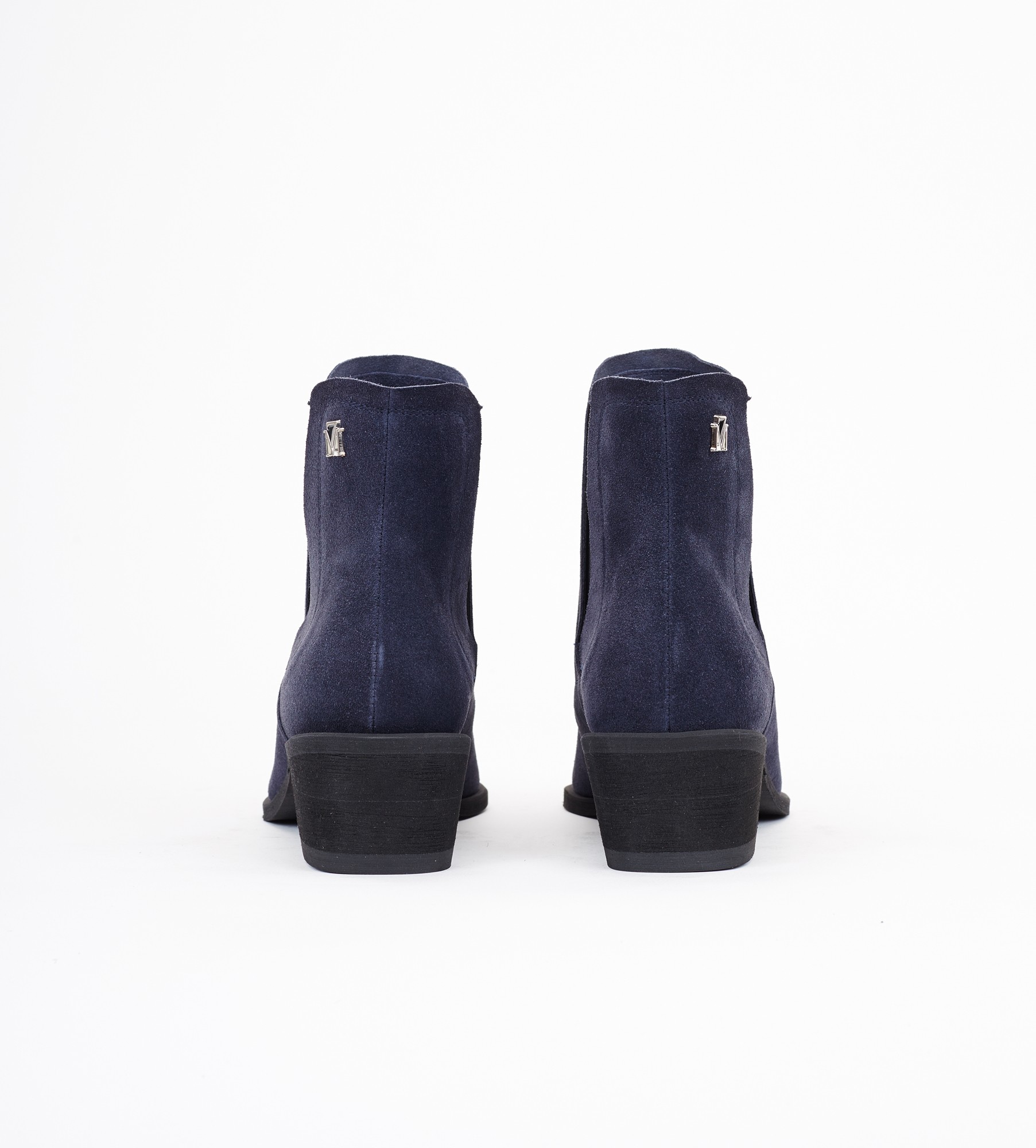 Granatowe kowbojki wykonane są z naturalnej, zamszowej skóry. Mają skórzaną futrówkę i wkładkę, co zapewnia komfort noszenia i idealny mikroklimat dla stóp. Elastyczne, czarne gumki po bokach ułatwiają zakładanie butów. Kowbojki mają stabilny obcas o wysokości 4 cm. Te eleganckie buty łączą w sobie styl i funkcjonalność, idealne na codzienne wyjścia.