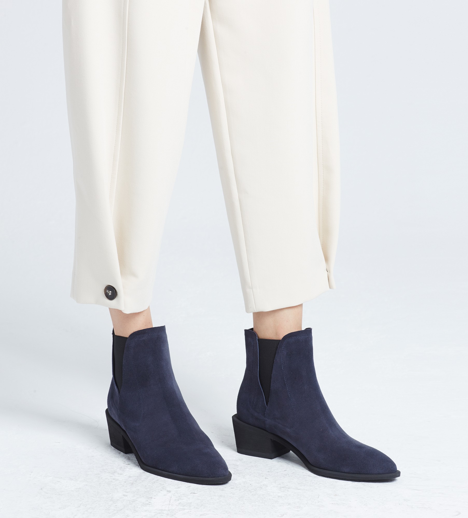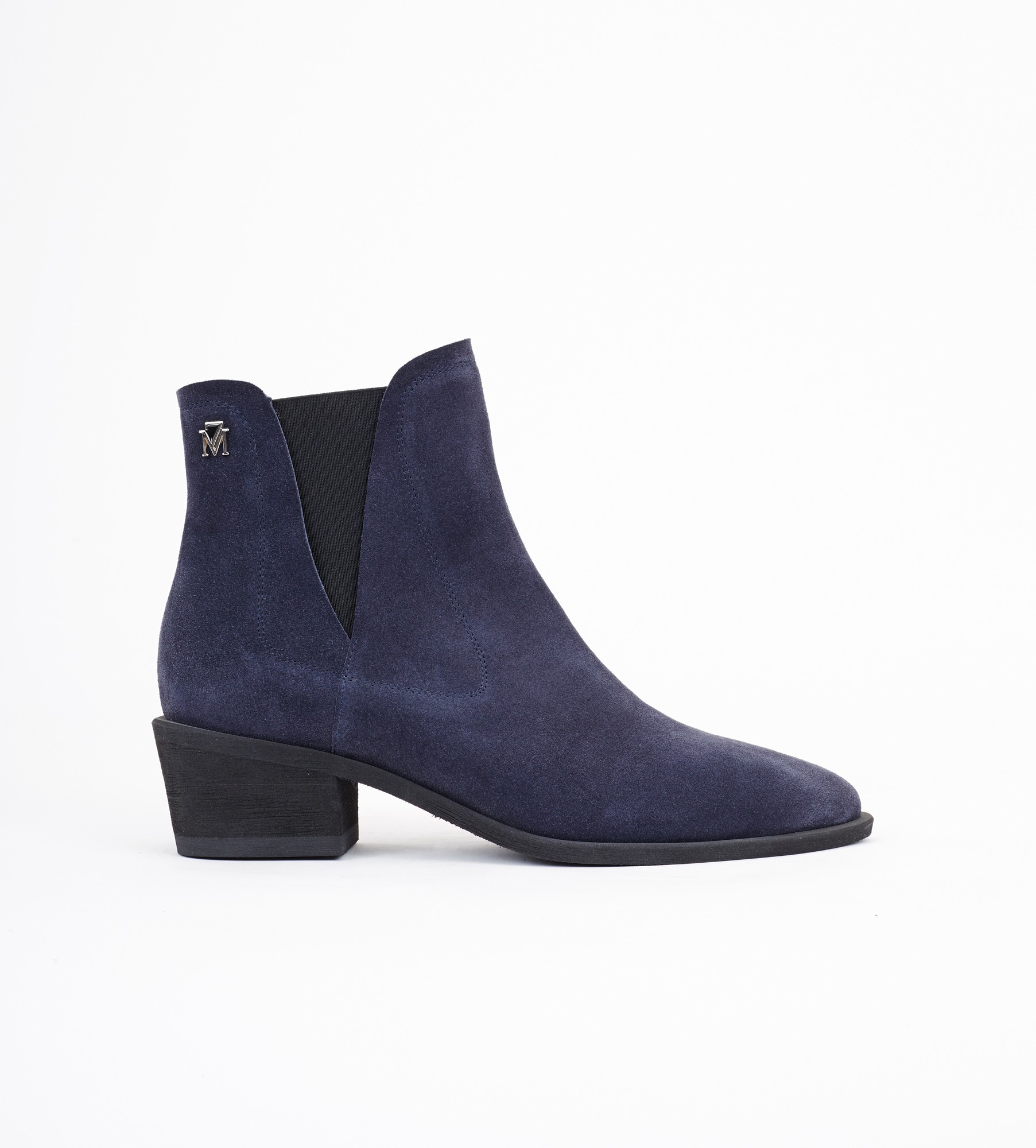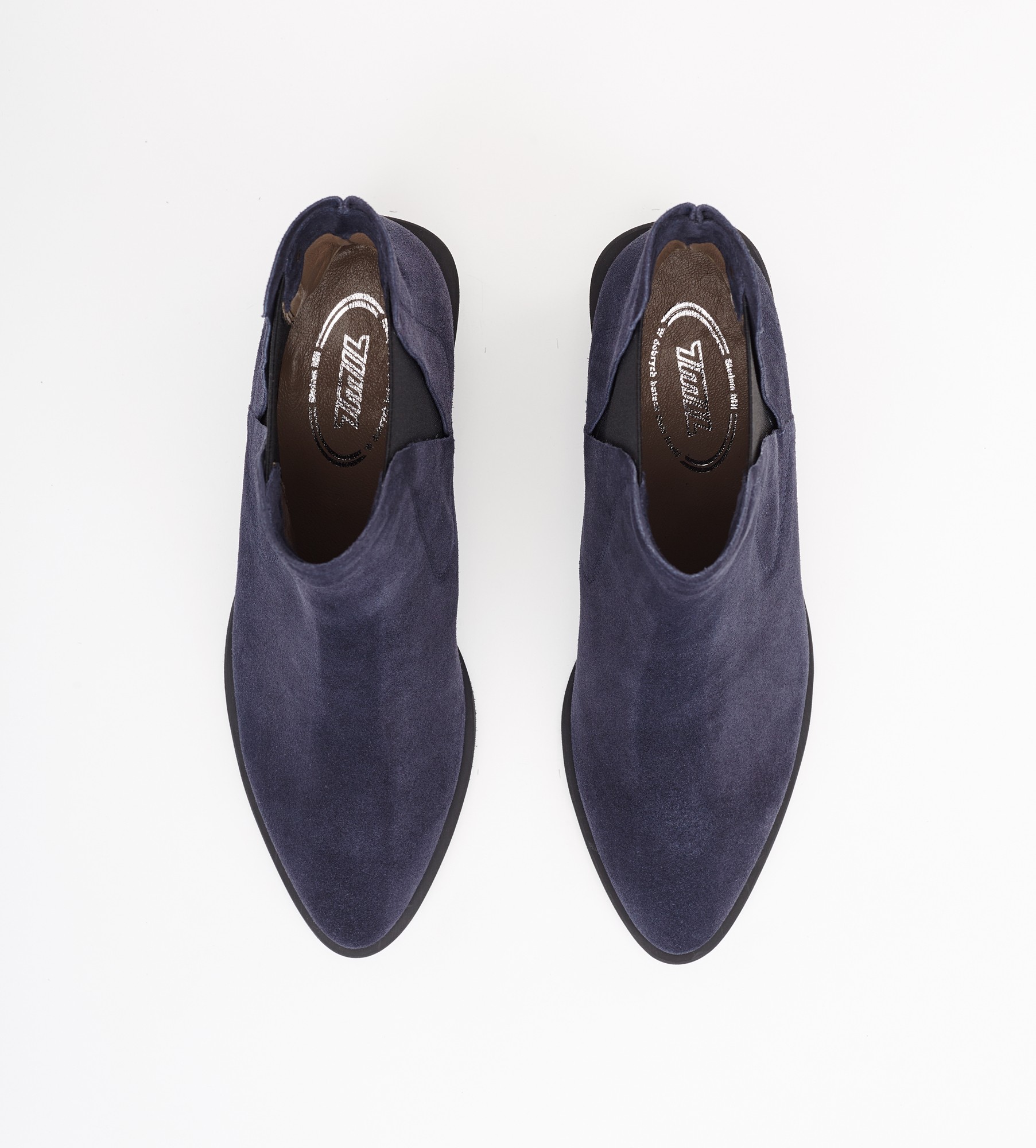 Granatowe kowbojki wykonane są z naturalnej, zamszowej skóry. Mają skórzaną futrówkę i wkładkę, co zapewnia komfort noszenia i idealny mikroklimat dla stóp. Elastyczne, czarne gumki po bokach ułatwiają zakładanie butów. Kowbojki mają stabilny obcas o wysokości 4 cm. Te eleganckie buty łączą w sobie styl i funkcjonalność, idealne na codzienne wyjścia.