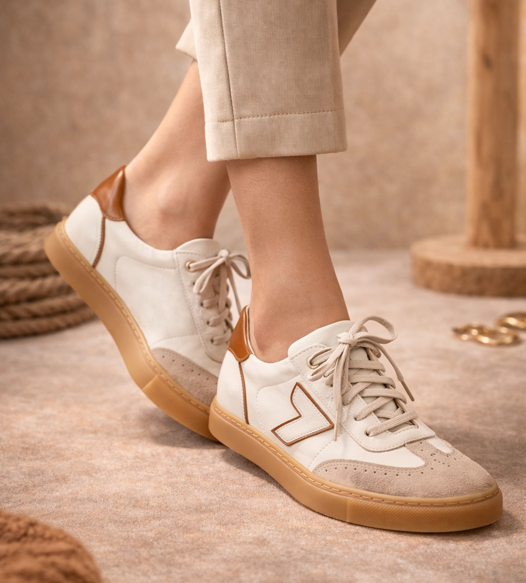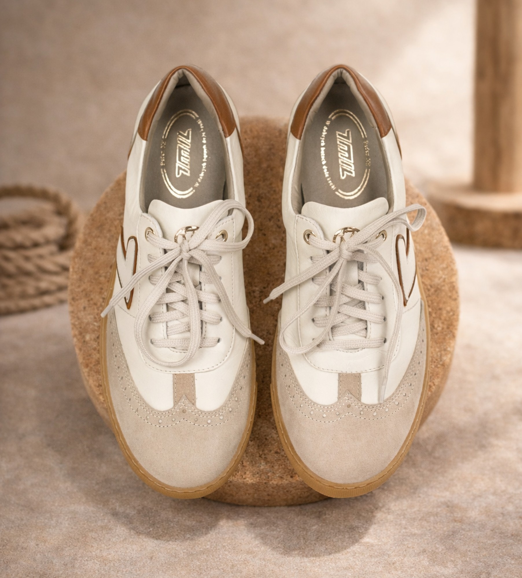 Beżowe trampki to idealne połączenie klasycznej formy z nowoczesnym wykończeniem i wyjątkową dbałością o komfort użytkowania. Wykonane z naturalnej skóry, zachwycają swoją miękkością, elastycznością i subtelną kolorystyką, która z łatwością dopasuje się do każdej stylizacji. Delikatne perforacje inspirowane klasycznym brogue nadają im lekko retro charakter, a kremowo-beżowa tonacja z karmelowym akcentem na pięcie sprawia, że są nie tylko modne, ale i niezwykle kobiece. Wnętrze wyściełane luksusową skórą jagnięcą zapewnia niepowtarzalne uczucie miękkości i doskonałą oddychalność – nawet podczas długiego dnia na nogach.