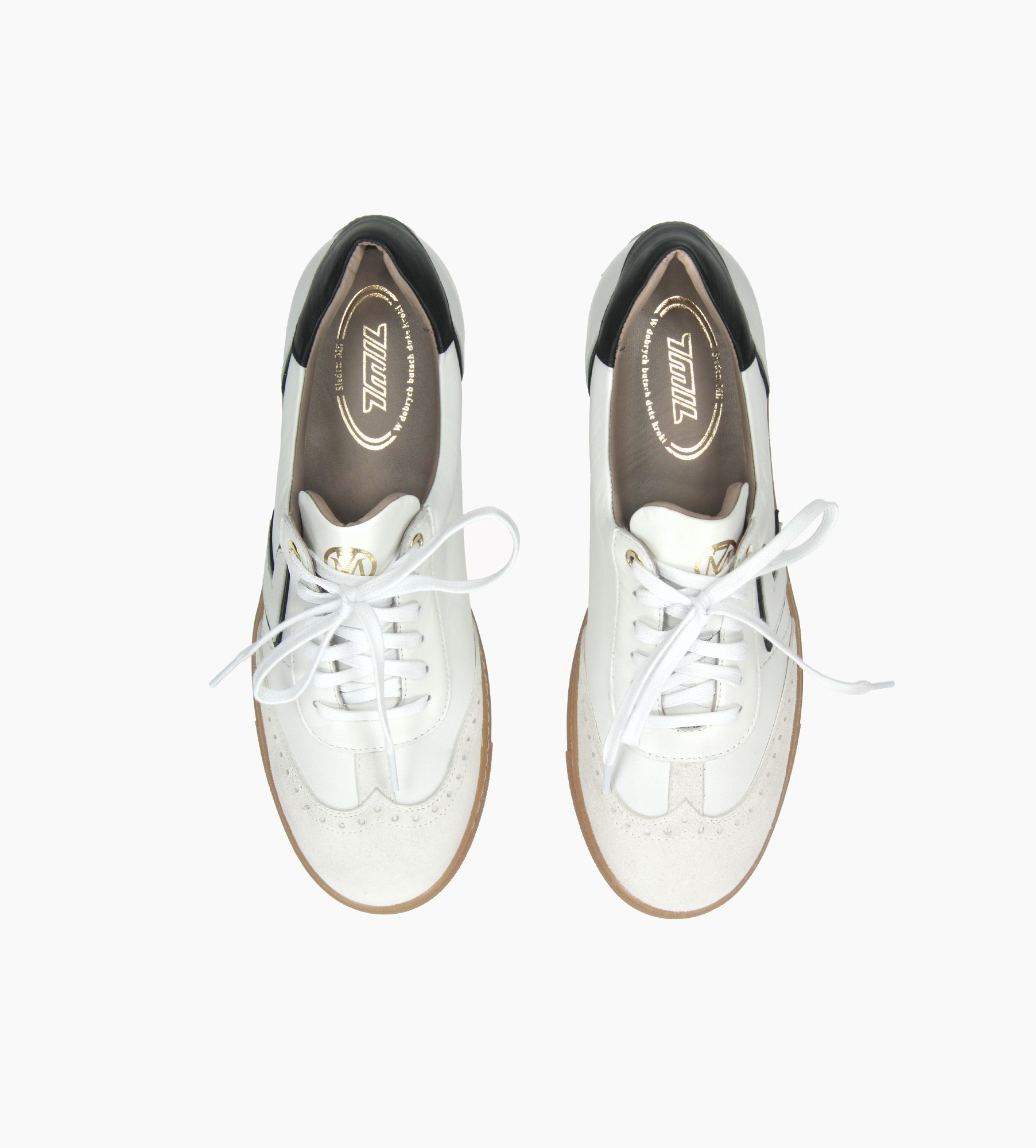 Te stylowe trampki to doskonałe połączenie komfortu i ponadczasowego designu. Wykonane z łączonych skór naturalnych, łączą gładką skórę licową z subtelnymi zamszowymi wstawkami, tworząc harmonijny i nowoczesny wygląd. Ich uniwersalna, biała kolorystyka sprawia, że idealnie wpisują się w codzienne i sportowe stylizacje. Na boku cholewki znajduje się delikatna ozdoba w formie stylizowanego logo, które subtelnie podkreśla ich sportowy charakter. Kontrastowy czarny detal na pięcie dodaje całości dynamiki, a beżowa podeszwa nadaje butom lekkości i casualowego wyrazu.