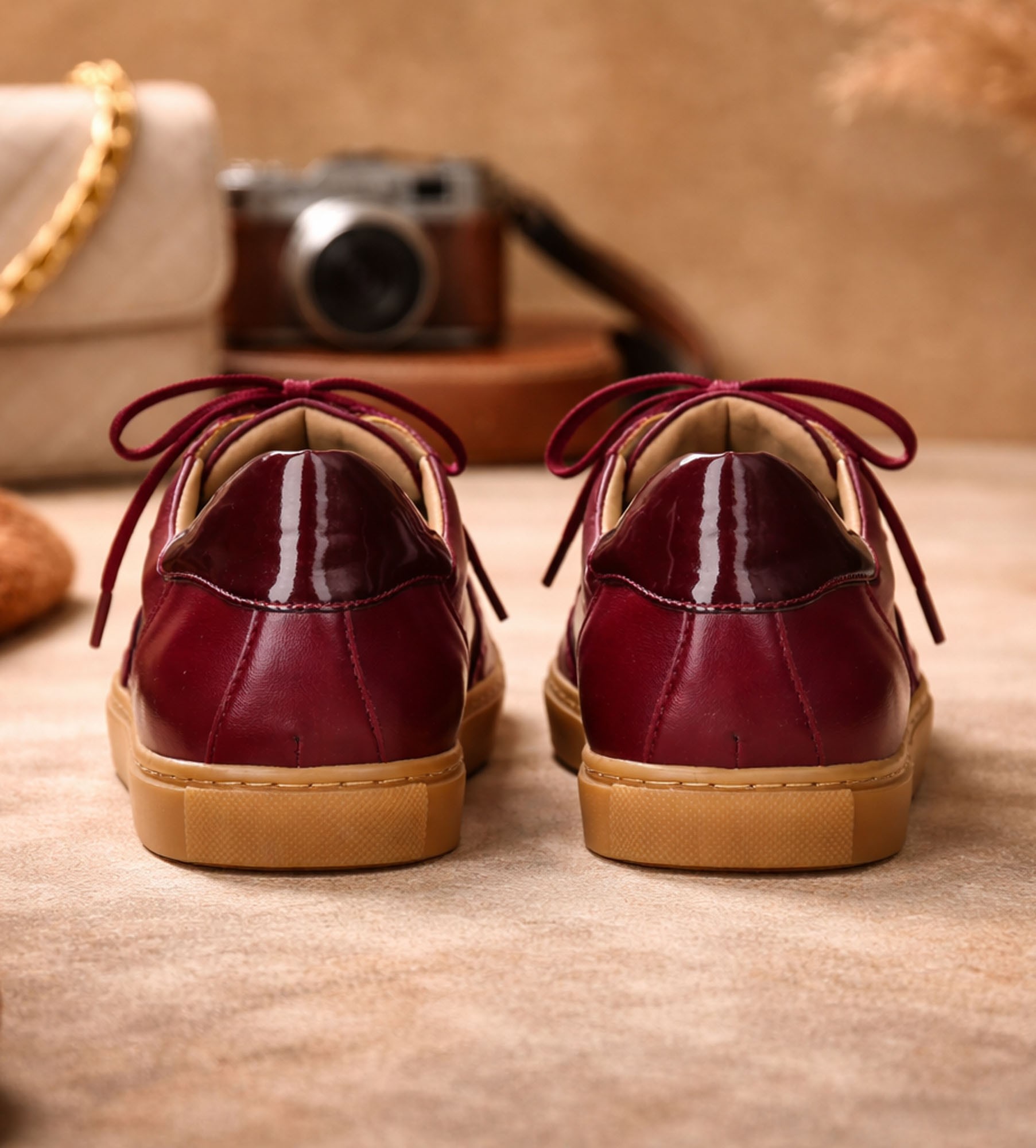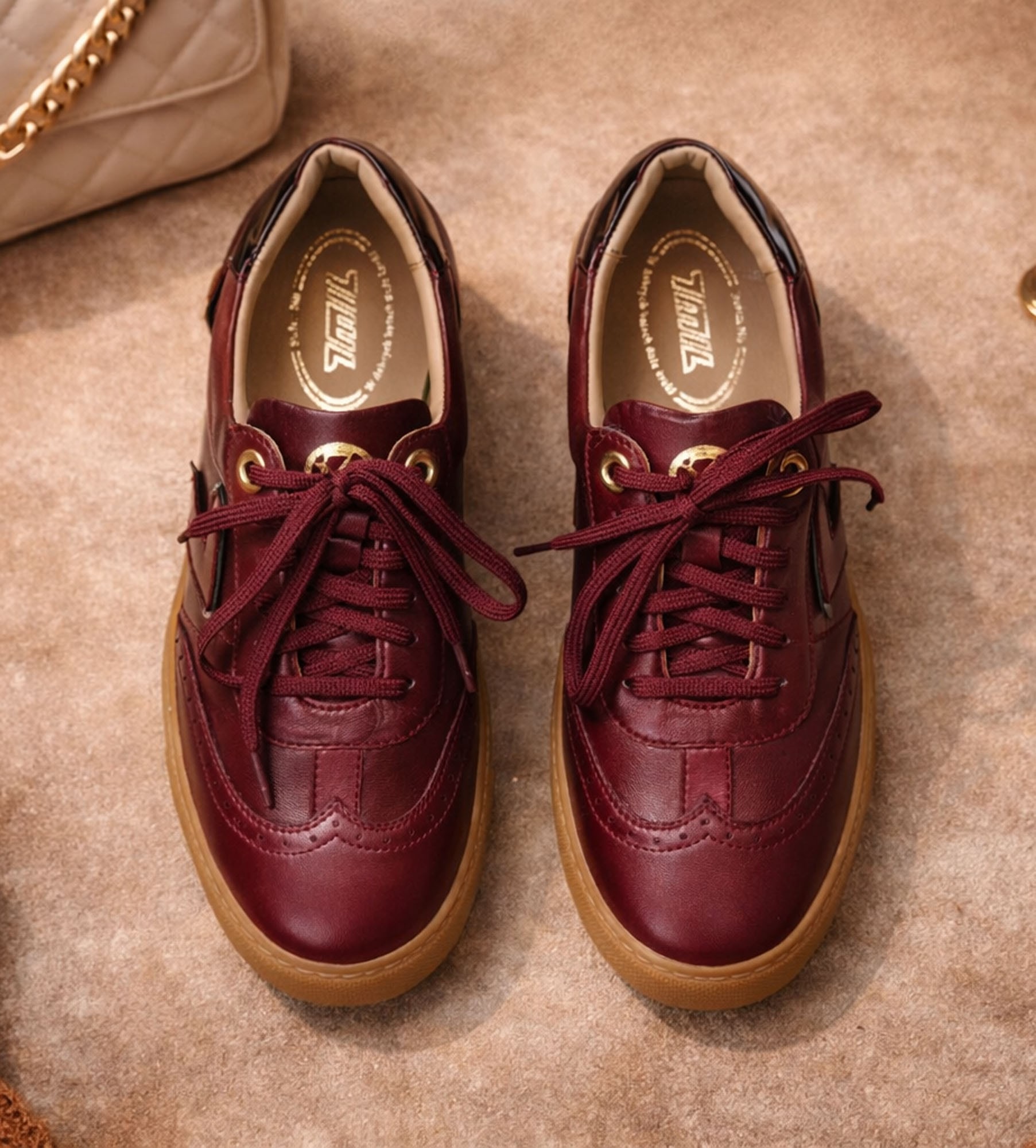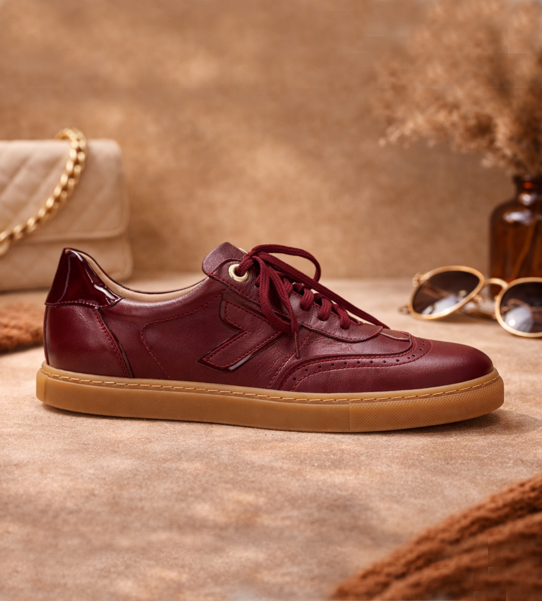 Bordowe trampki to połączenie kobiecego stylu z codzienną wygodą. Wykonane z wysokogatunkowej skóry, zachwycają głębokim kolorem i subtelnym połyskiem. Ozdobne przeszycia i delikatne detale nadają im elegancki charakter, który doskonale sprawdzi się zarówno w miejskich stylizacjach, jak i w bardziej casualowych zestawach. Wnętrze wyściełane miękką skórą jagnięcą gwarantuje komfort noszenia przez cały dzień. Model sznurowany, z klasyczną gumową podeszwą w kolorze karmelowym, zapewnia wygodę i stabilność na każdym kroku.