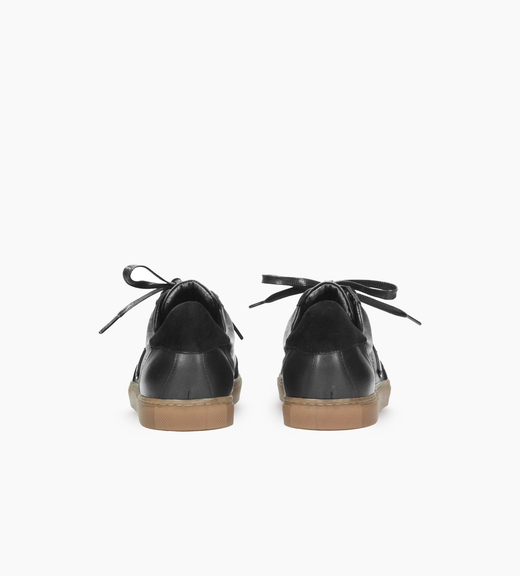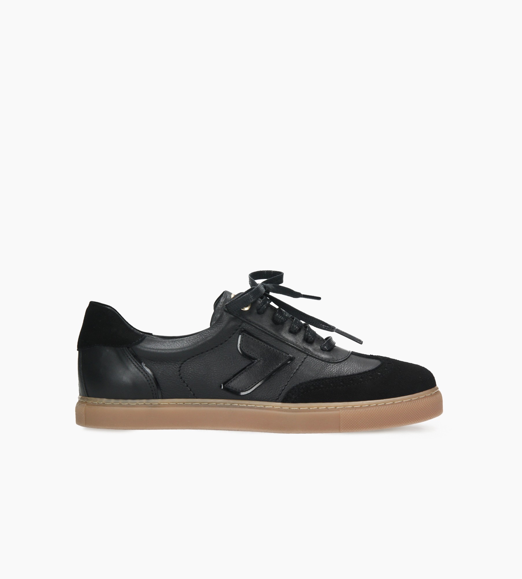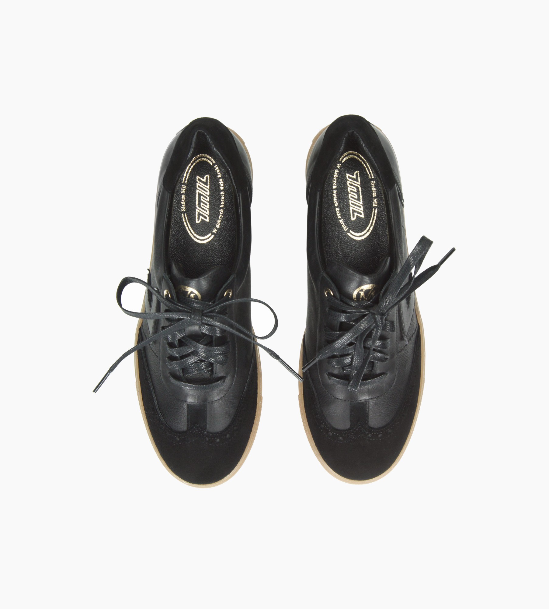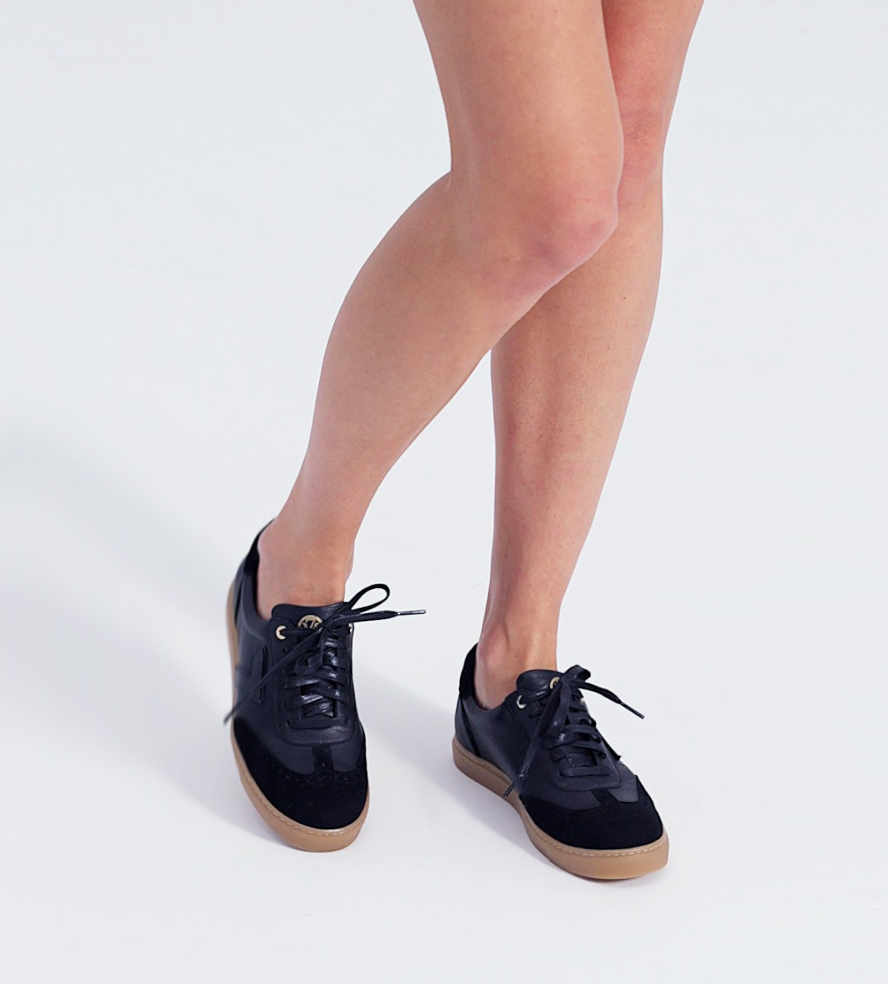 Czarne trampki damskie łączą nowoczesny styl z najwyższą jakością wykonania. Połączenie różnych rodzajów naturalnej skóry, w tym gładkiej skóry licowej oraz miękkiego zamszu, tworzą niezwykle interesującą fakturę i nadają butom stylowego charakteru. Czerń dodaje im uniwersalności, sprawiając, że pasują zarówno do codziennych, jak i bardziej sportowych stylizacji. Wnętrze butów zostało wyściełane naturalną skórą jagnięcą, która gwarantuje miękkość, oddychalność i komfort noszenia przez cały dzień. Lekka, elastyczna podeszwa w kontrastującym odcieniu beżu zapewnia świetną amortyzację i wygodę, co czyni je idealnym wyborem na intensywne dni w mieście.
