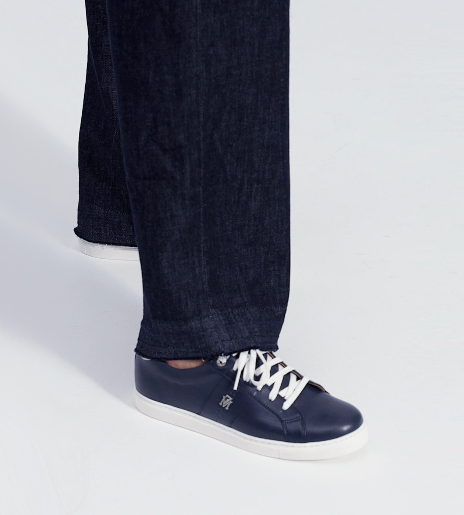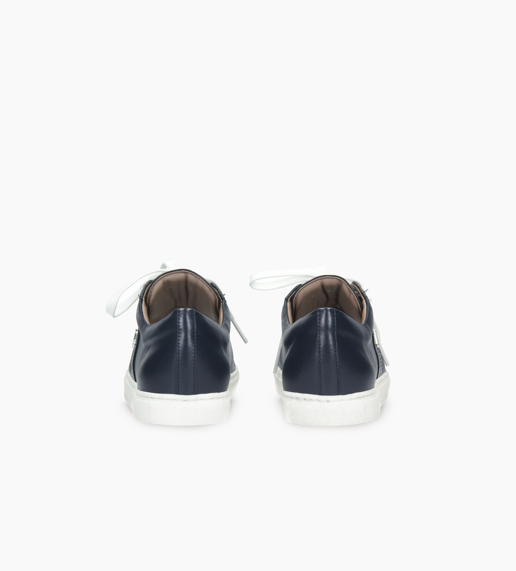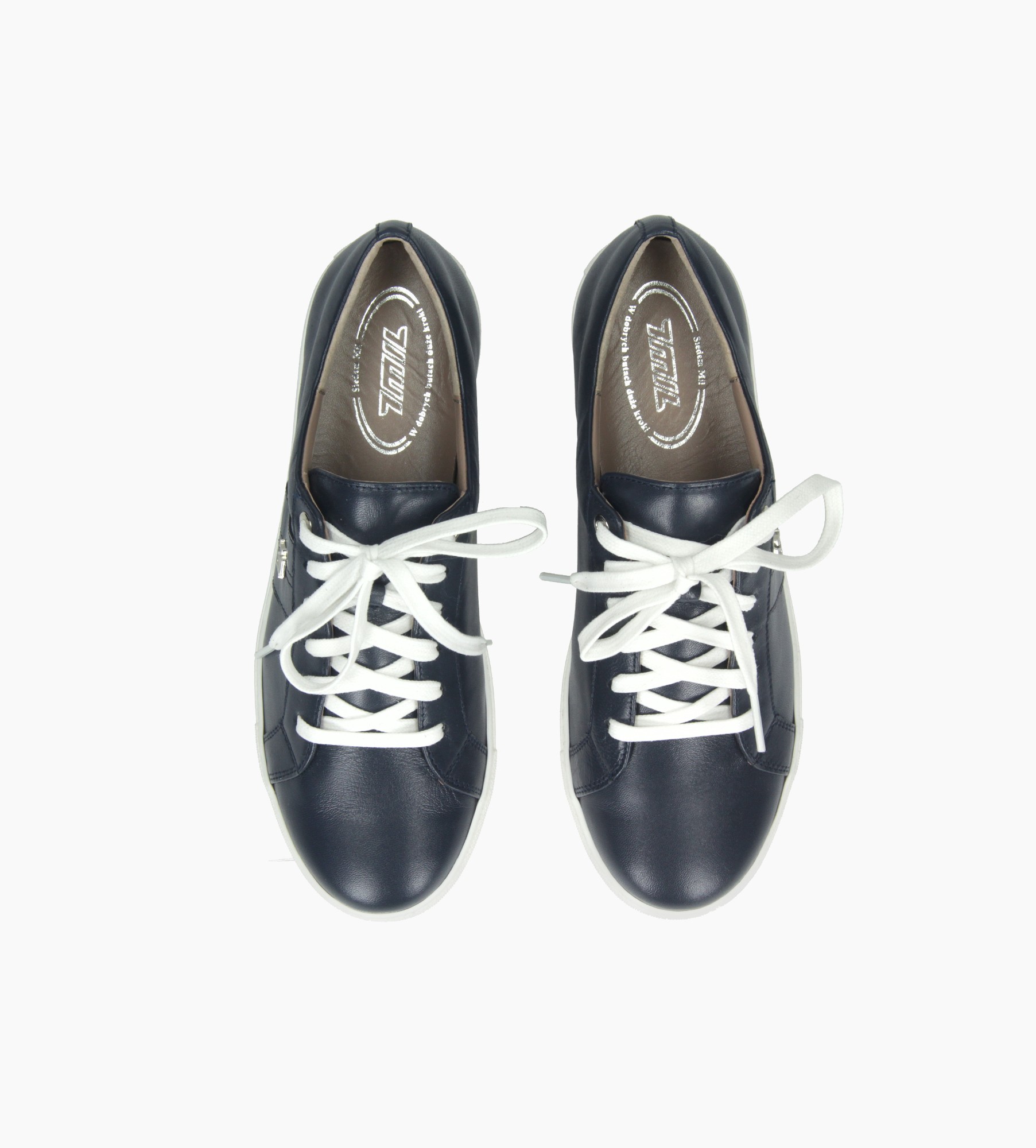 Granatowe trampki damskie wykonane z wysokiej jakości naturalnej skóry licowej łączą klasyczny design z nowoczesnym akcentem. Ich wnętrze wyściełane jest miękką skórą jagnięcą, zapewniając komfort i odpowiednią wentylację. Kontrastowa biała podeszwa dodaje lekkości i sportowego charakteru, a ozdobny metalowy nit z logo firmy, umieszczony na boku cholewki, podkreśla ekskluzywny styl modelu. Trampki te doskonale sprawdzą się zarówno w casualowych stylizacjach, jak i w bardziej eleganckich, sportowo-miejskich zestawieniach.