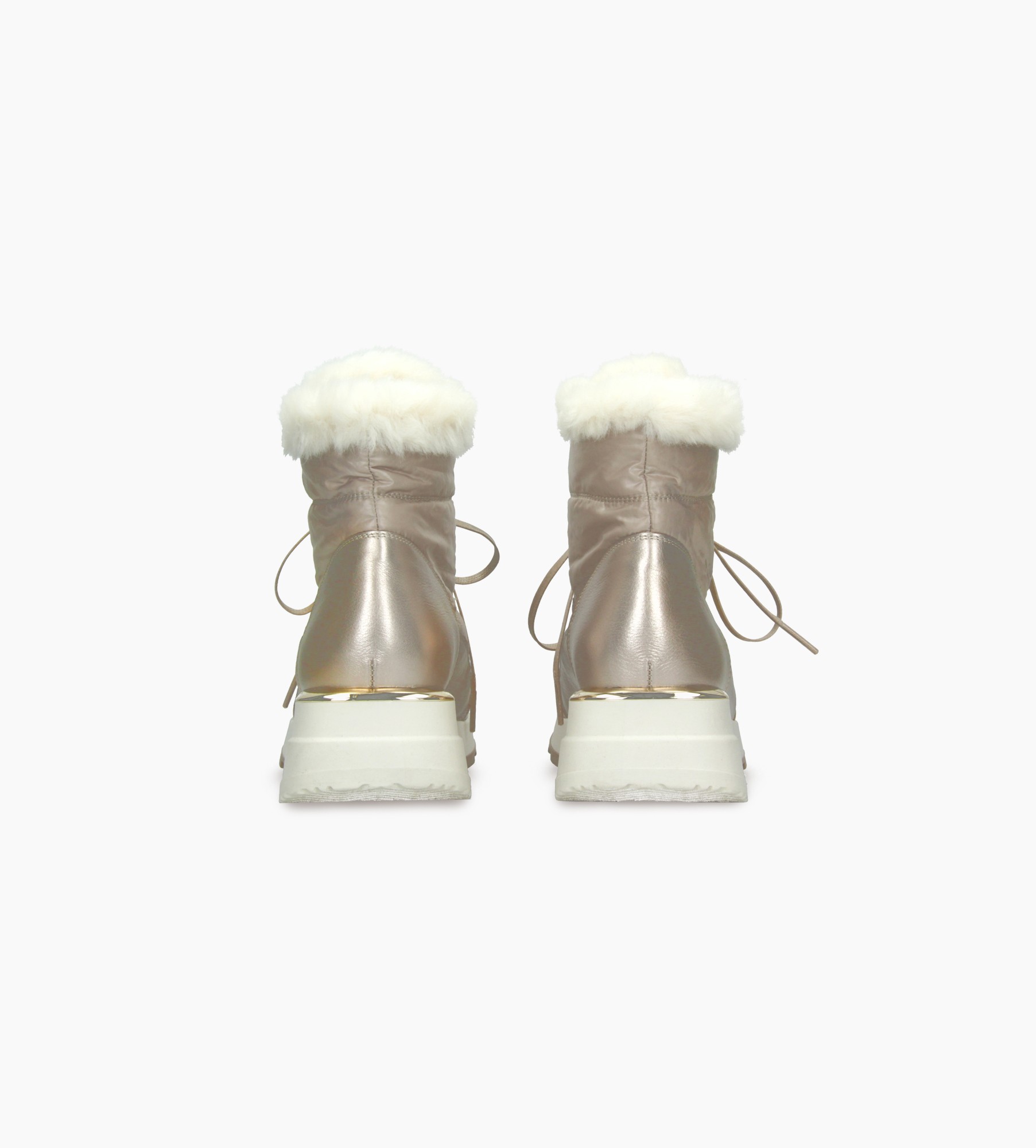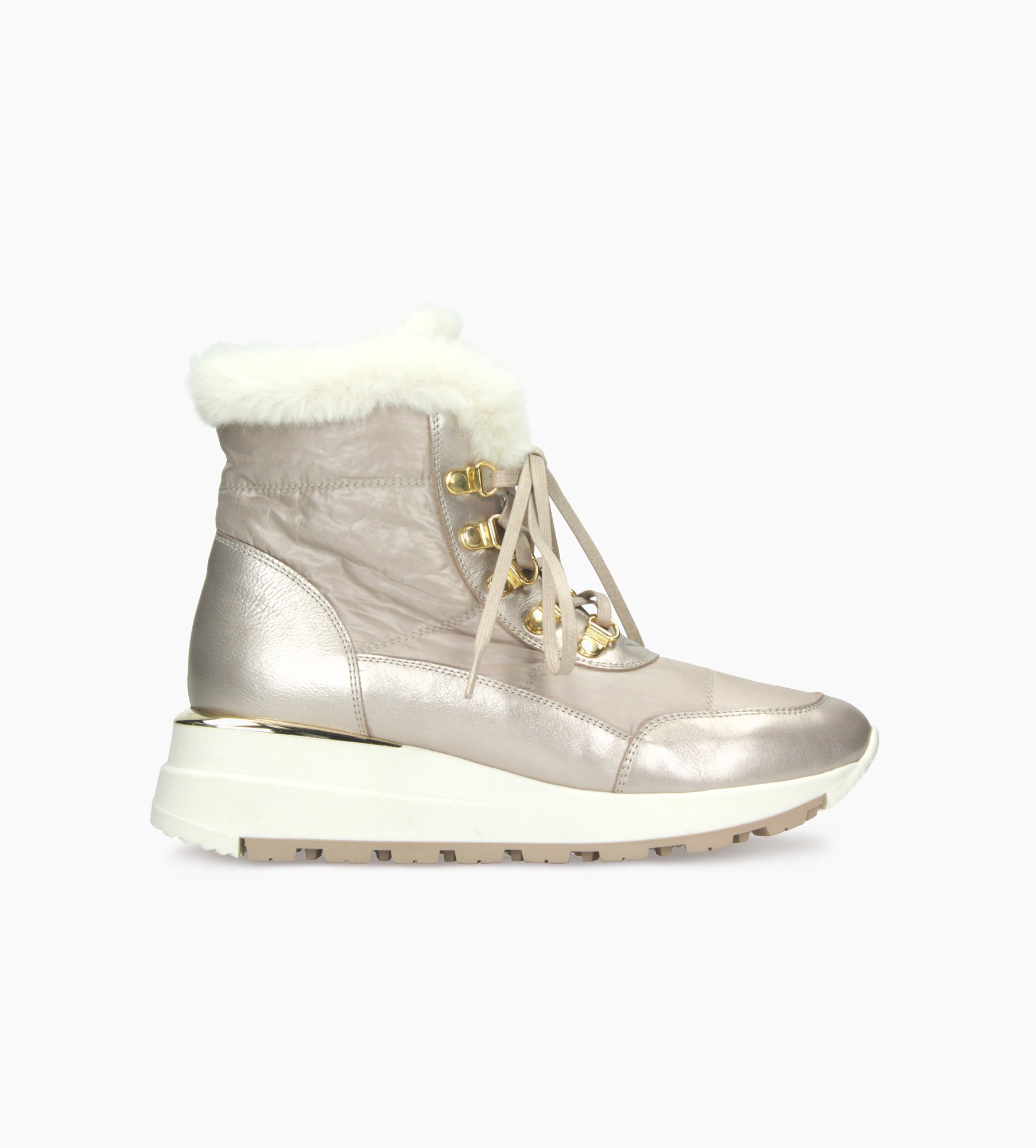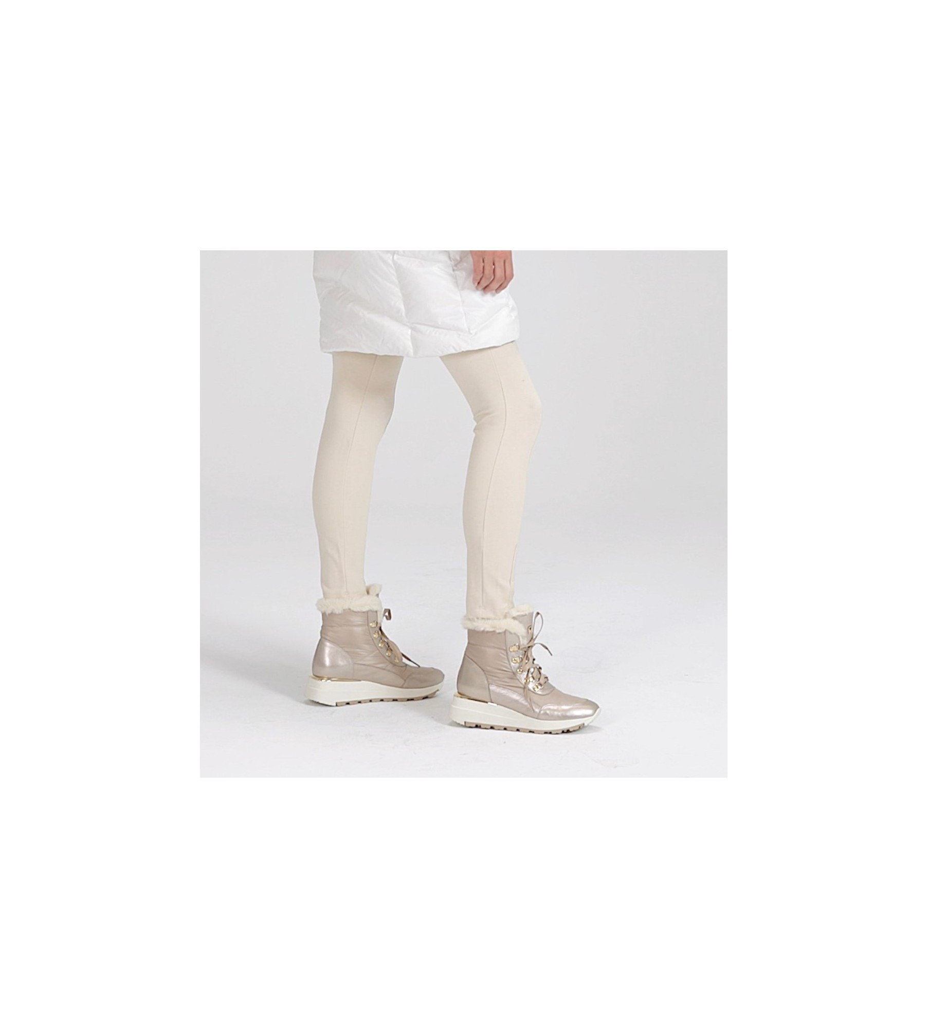 Złote ocieplane sneakersy damskie na grubszej podeszwie to elegancka i praktyczna propozycja na chłodniejsze dni. Wykonane z wysokiej jakości naturalnej skóry licowej i materiału waterproof wyróżniają się stylowym złotym kolorem, który nadaje im wyjątkowy charakter. Wykończone wewnątrz miękkim futrem, zapewniają ciepło i wygodę. Grubsza podeszwa dodaje nowoczesnego wyglądu, a wiązanie pozwala na idealne dopasowanie do stopy. Te sneakersy to połączenie modnego designu z funkcjonalnością, idealne do casualowych stylizacji na zimowe dni.