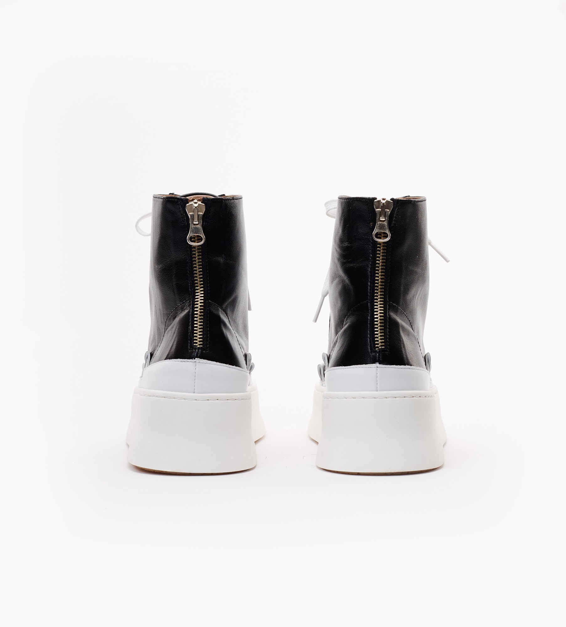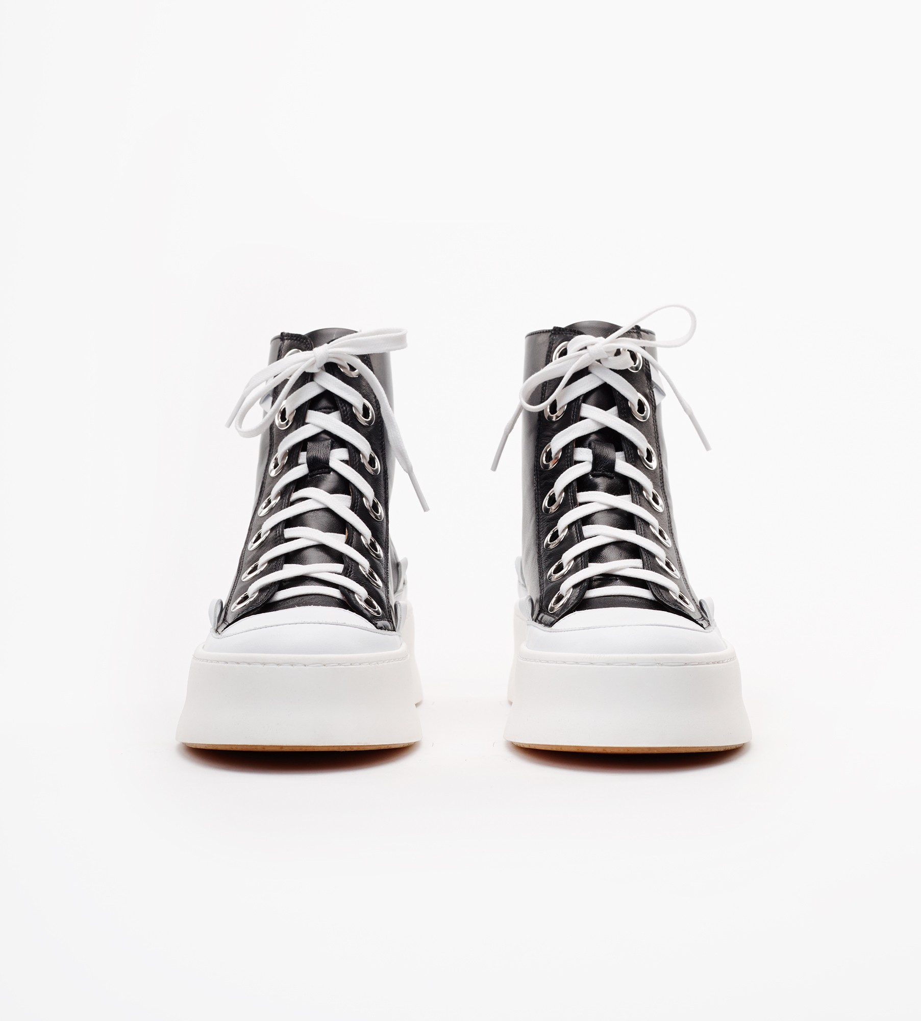 Czarne trzewiki damskie to efektowne i nowoczesne obuwie wykonane z naturalnej skóry licowej, wyposażone w elastyczne, ryflowane podeszwy dla lepszej przyczepności. Wnętrze i wkładka z miękkiej skóry jagnięcej zapewniają komfort noszenia. Trzewiki mają sznurowadła umożliwiające idealne dopasowanie oraz subtelną złotą ozdobę, która dodaje im wyrafinowanego stylu. Wysokość obcasa wynosi 2 cm, co sprawia, że są idealne na chłodniejsze dni, łącząc styl i wygodę.