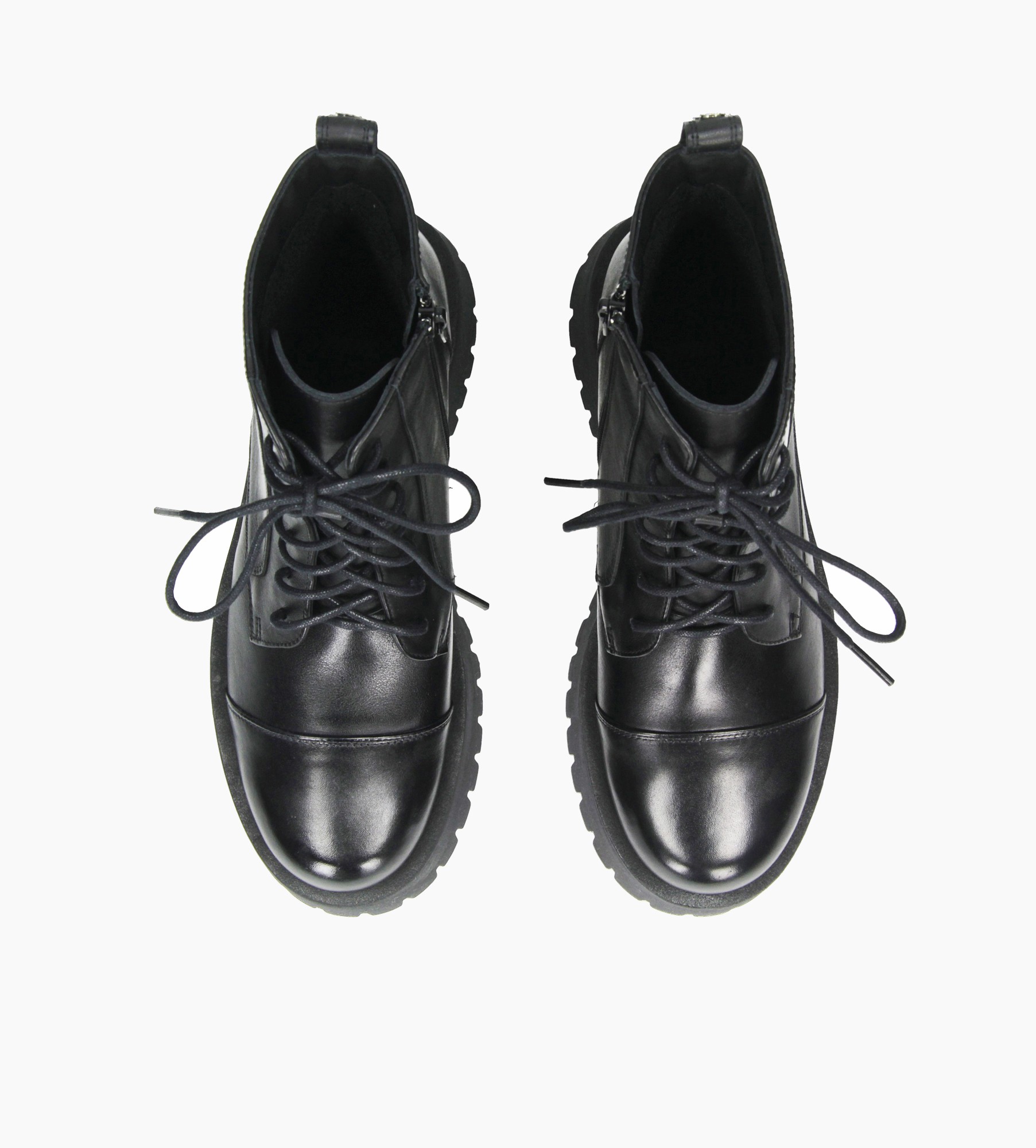 Czarne trzewiki damskie wykonane z najwyższej jakości naturalnej skóry cielęcej charakteryzują się eleganckim i wyrafinowanym designem. Cholewka, ozdobiona subtelnymi przeszyciami, sięga ponad kostkę, zapewniając stylowy wygląd. Wnętrze oraz wkładka ocieplone są miękkim kocykiem, co gwarantuje komfort i ciepło w chłodniejsze dni. Buty posiadają praktyczny suwak po wewnętrznej stronie, który ułatwia zakładanie, oraz sznurowadła pozwalające na dopasowanie cholewki. Obcas o wysokości 3 cm dodaje subtelnej elegancji, a całkowita wysokość buta to 18 cm. Te trzewiki to idealne połączenie stylu i wygody, doskonałe na jesienne i zimowe dni.